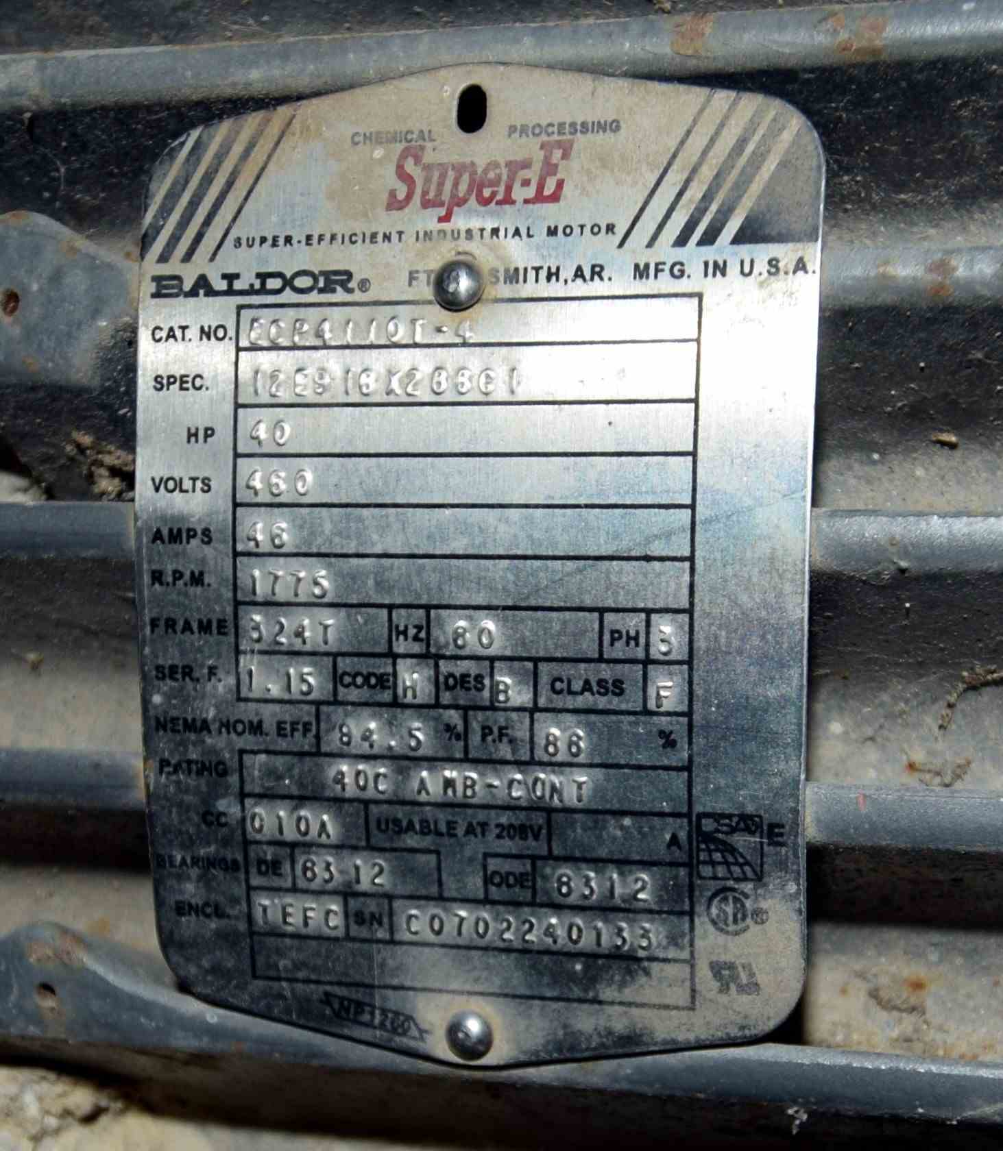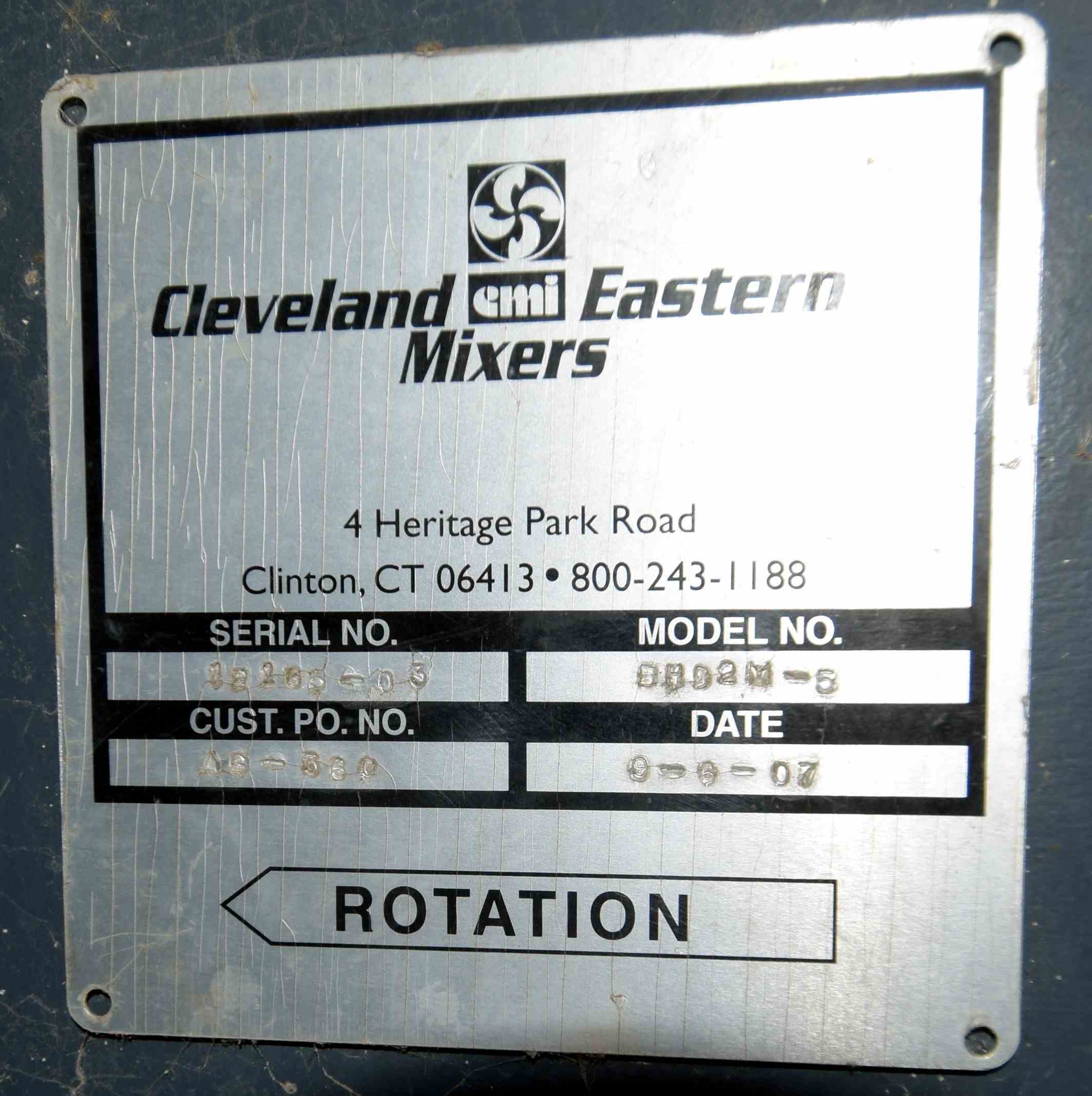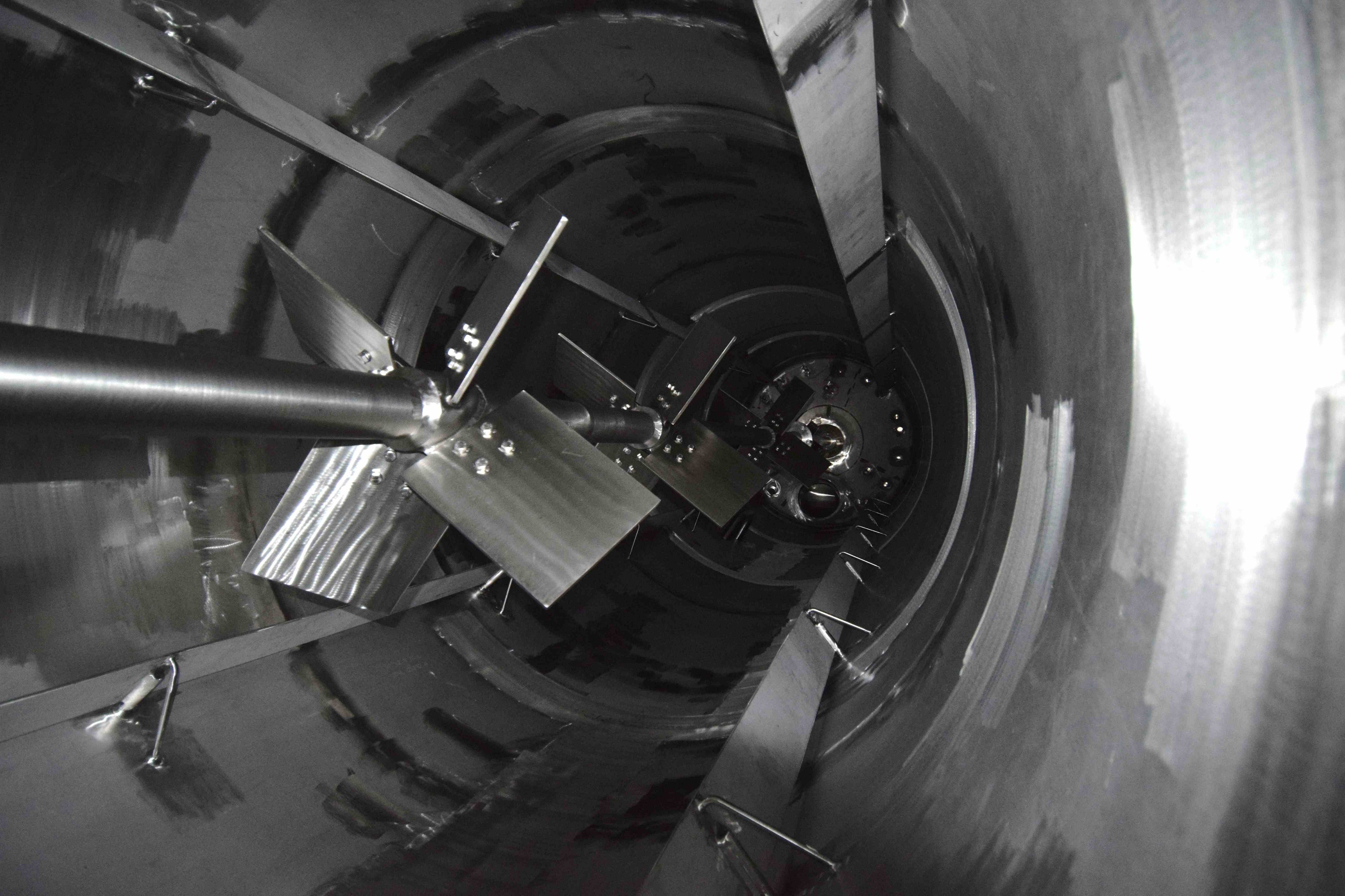 Used Steel-Pro Pressure Tank, Approximate 6300 Gallons, 304L Stainless Steel, Vertical. Approximate 74” diameter x 318” straight side, dished top and bottom. Internal rated 30/-10 psi at -20 to 300 degrees F. Top entering Cleveland agitator, model BHD2M-5, serial# 12165-03, approximate 4” diameter shaft with multiple turbines and a mechanical seal, driven by a 40hp, 3/60/460 volt, 1775 rpm motor. Side wall baffles, top and side bottom man way, center bottom outlet. Mounted on 4 carbon steel legs. National Board# 1362, serial# 17977D, built 2007.