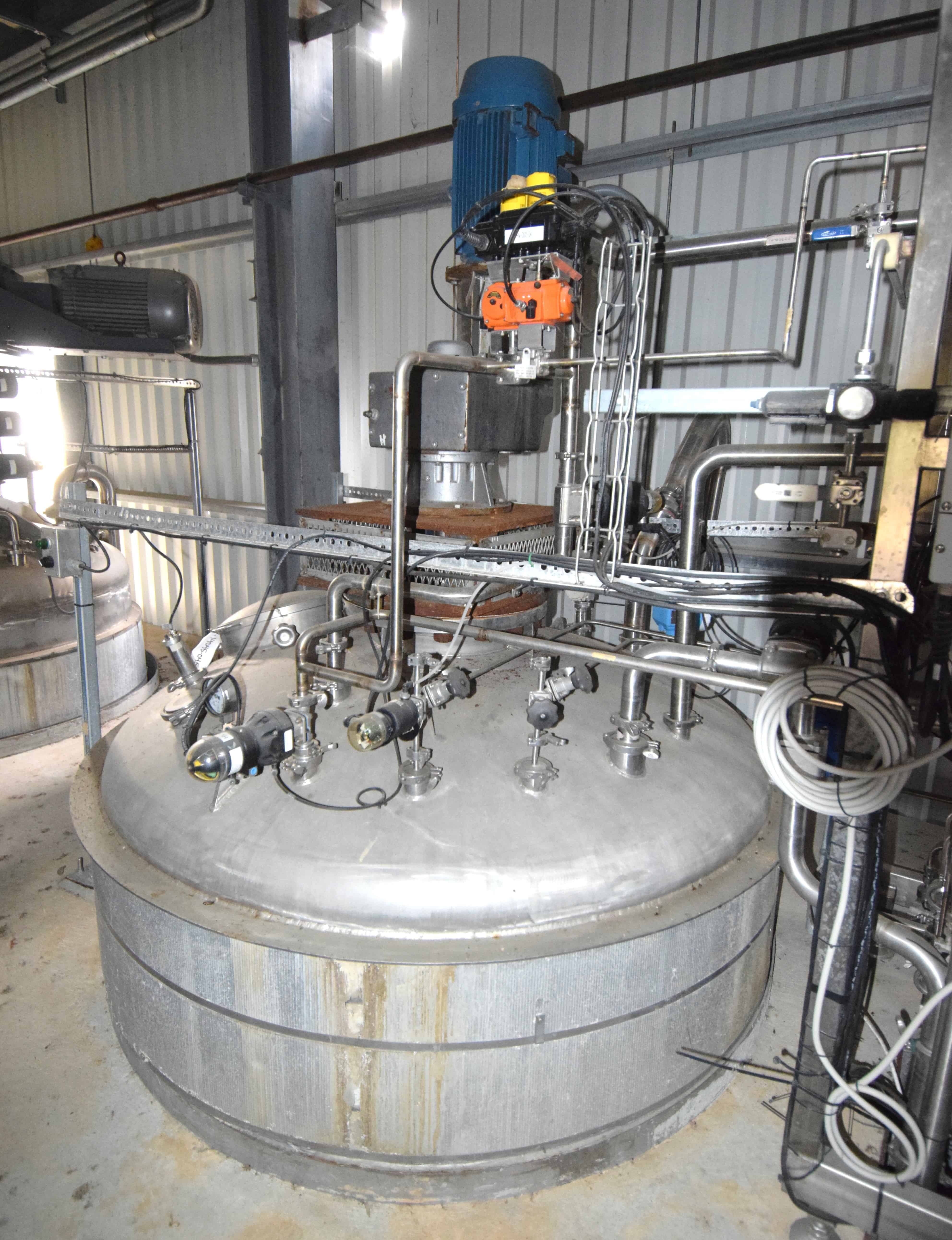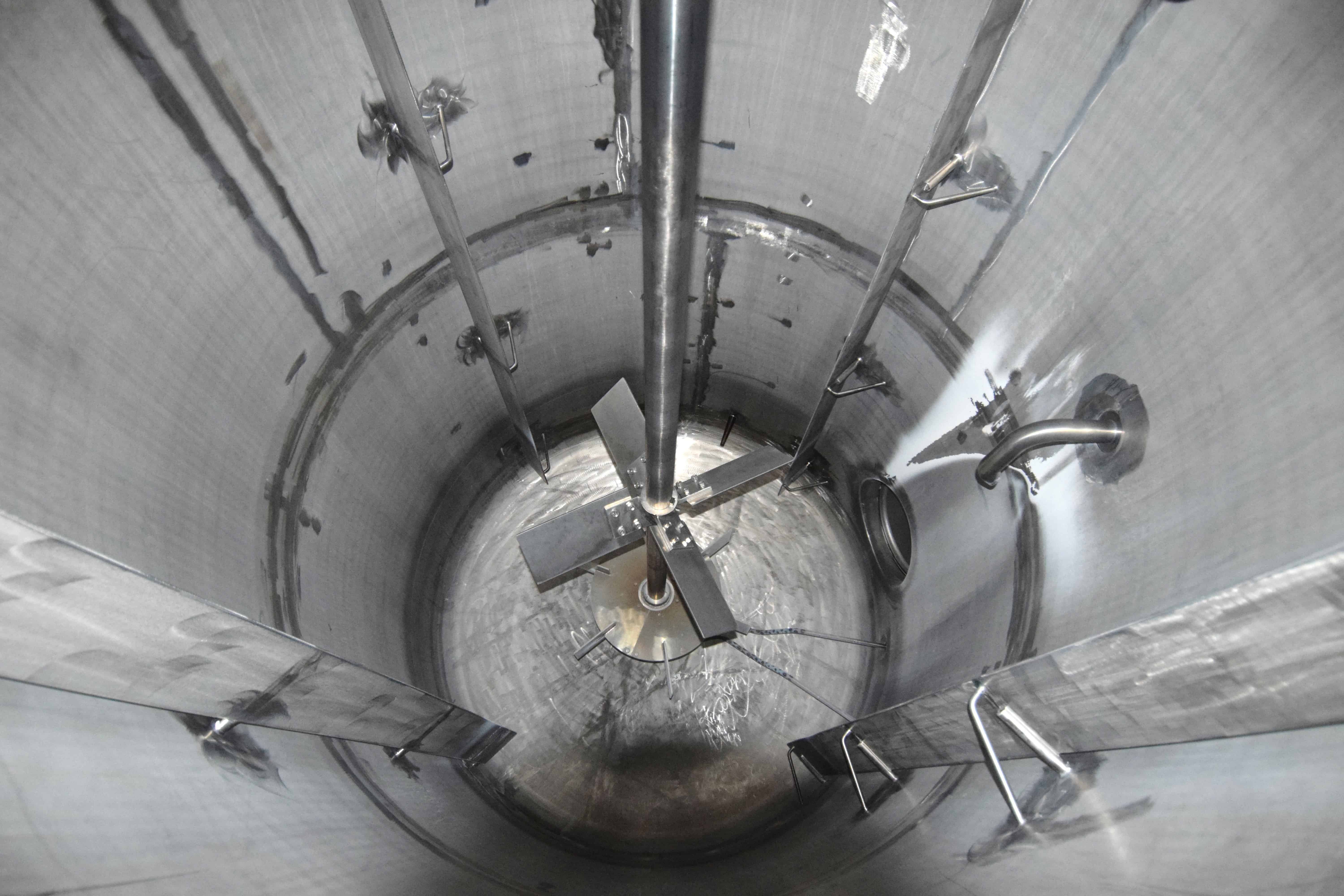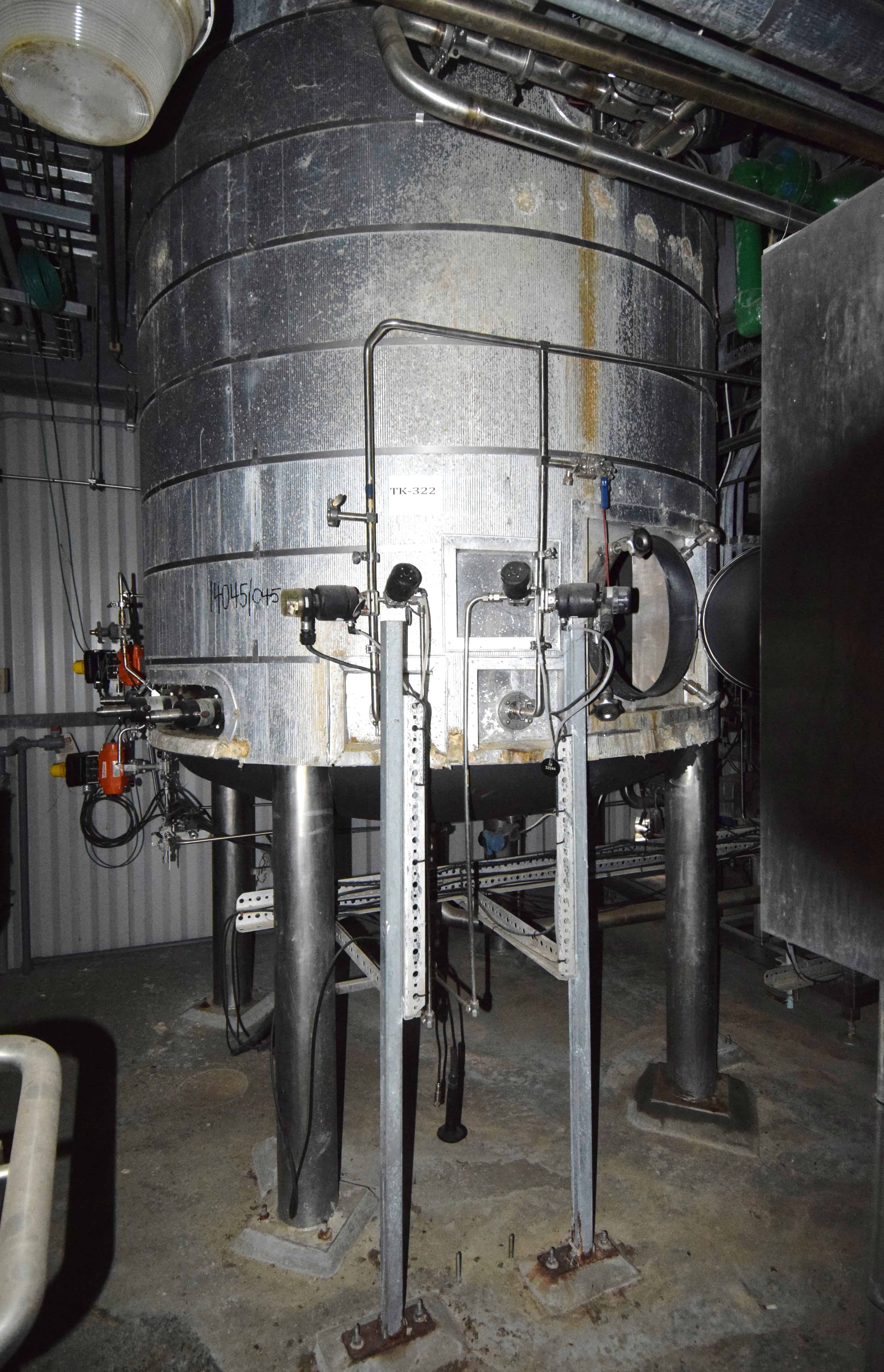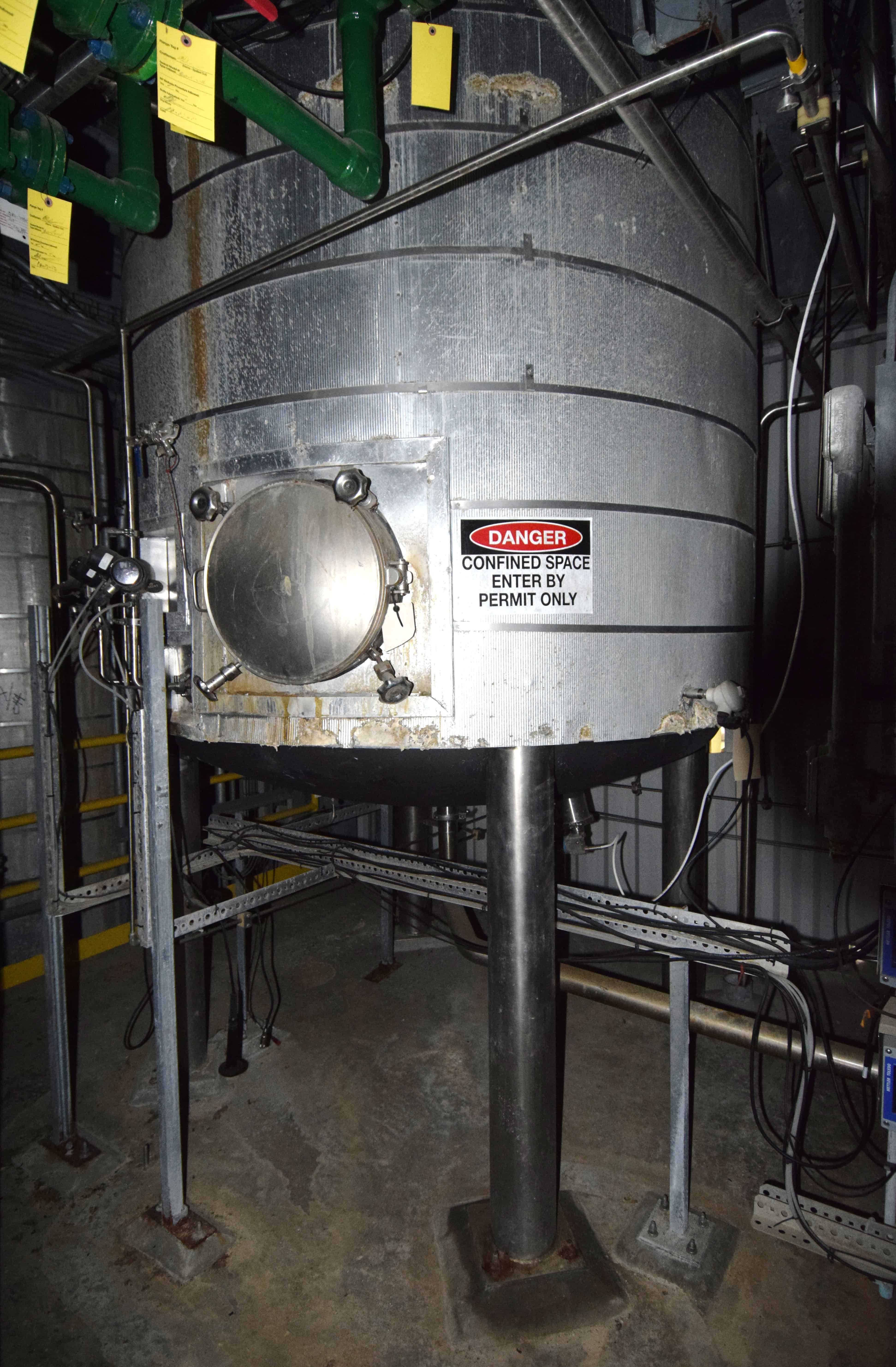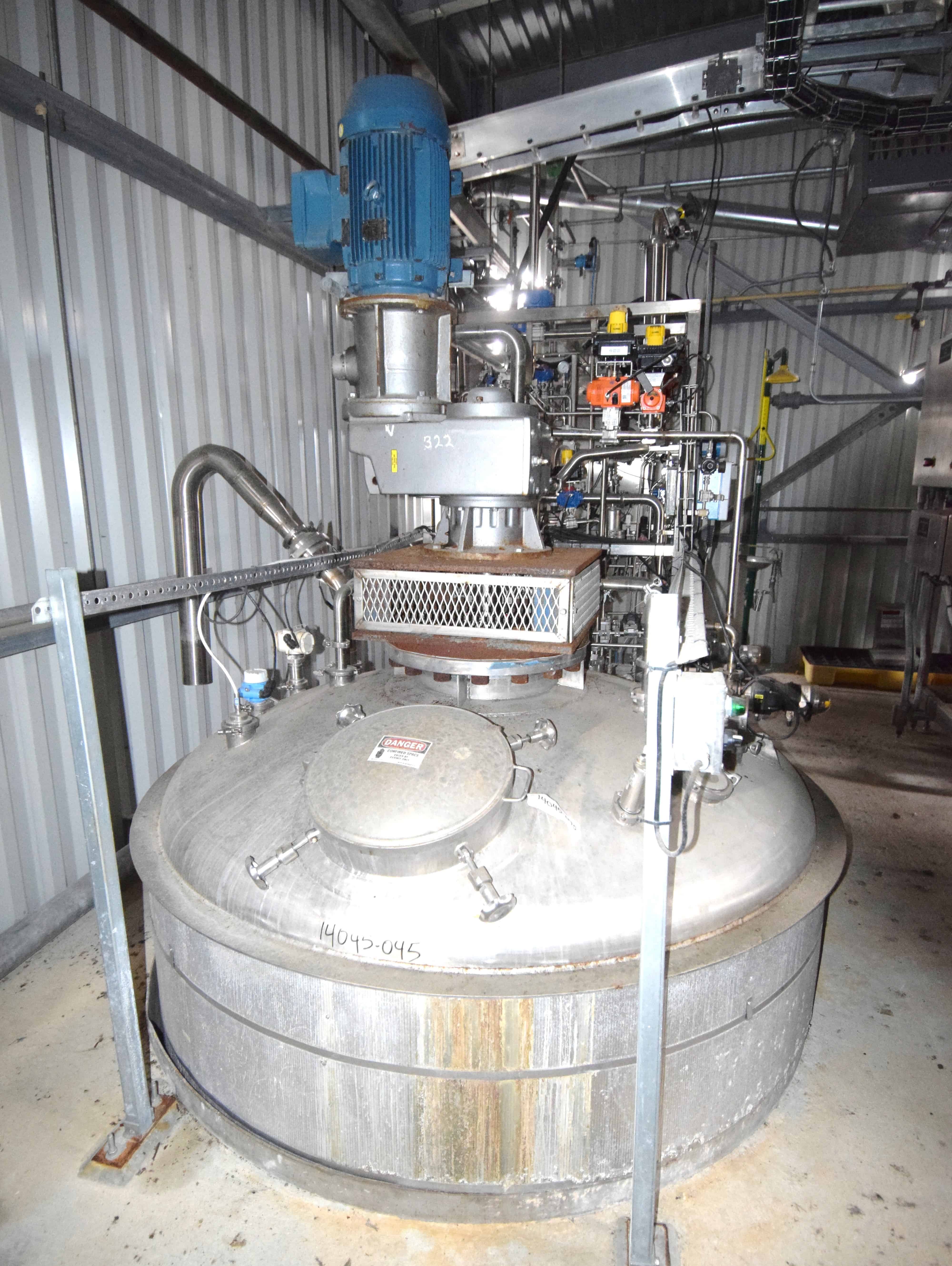 Used Tank, Approximate 2300 Gallons, Stainless Steel, Vertical. Approximate 78” diameter x 108” straight side, dished top and bottom. Top entering agitator, approximate 3” diameter shaft with multiple turbines and a mechanical seal, driven by a 20hp, 3/60/208-230/460 volt, 1770 rpm XP gear motor. Side wall baffles, top and side bottom man way, center bottom outlet. Mounted on 4 stainless steel legs. No manufacturers tag.