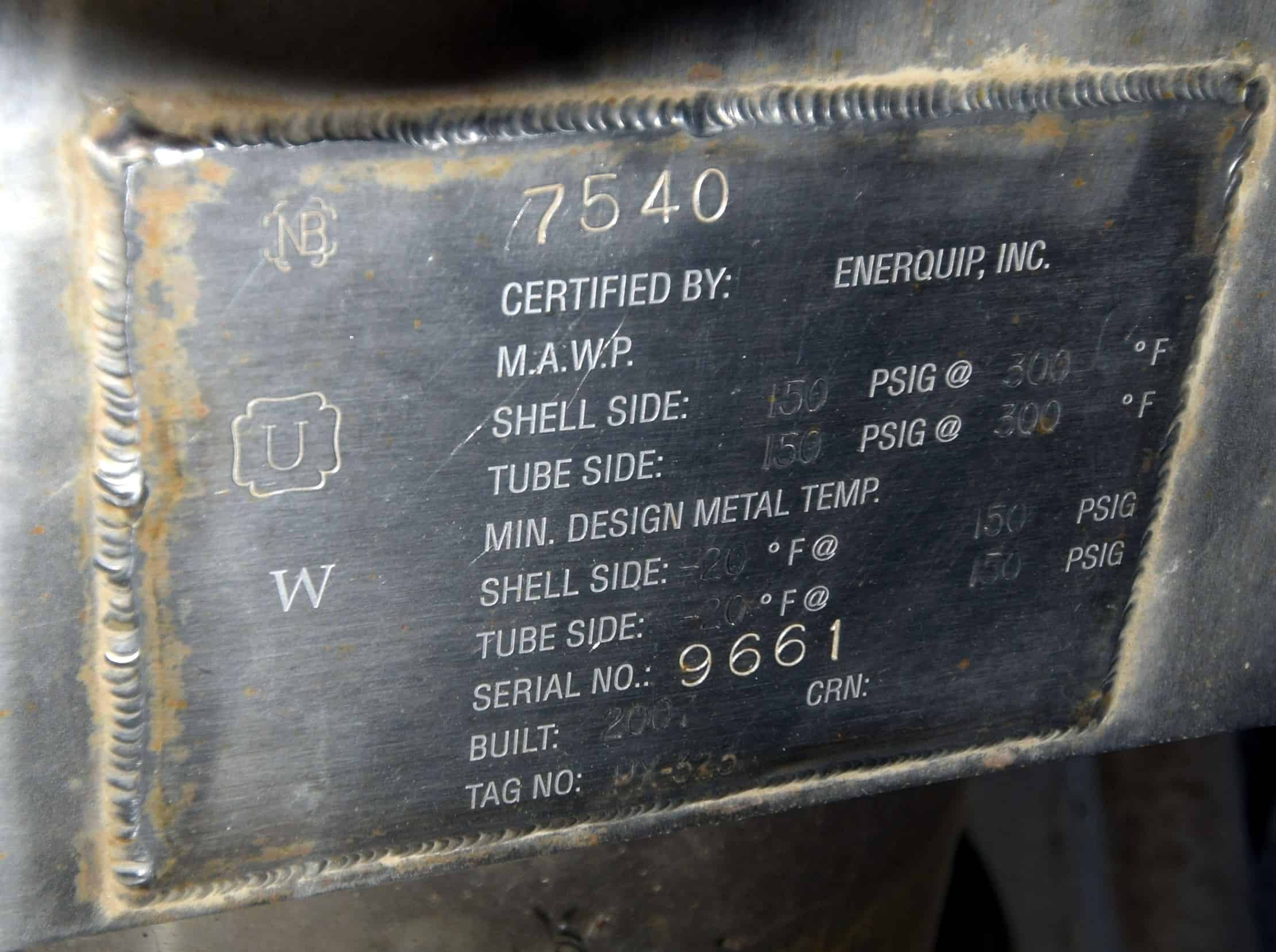 Used Enerquip U Tube Shell & Tube Heat Exchanger, Approximately 800 Square Feet, Model BEUH, Stainless Steel, Horizontal. 304L Stainless steel shell rated 150 psi at -20 to 300 degrees F. (354) 1/2" diameter x 108” long 304L stainless steel tubes rated 150 psi at -20 to 300 degrees F. 304L Stainless steel tubeshaeet and head. Openings for tubes (2) 3", openings for shell (2) 3". National Board# 7540, serial# 9661, built 2007.