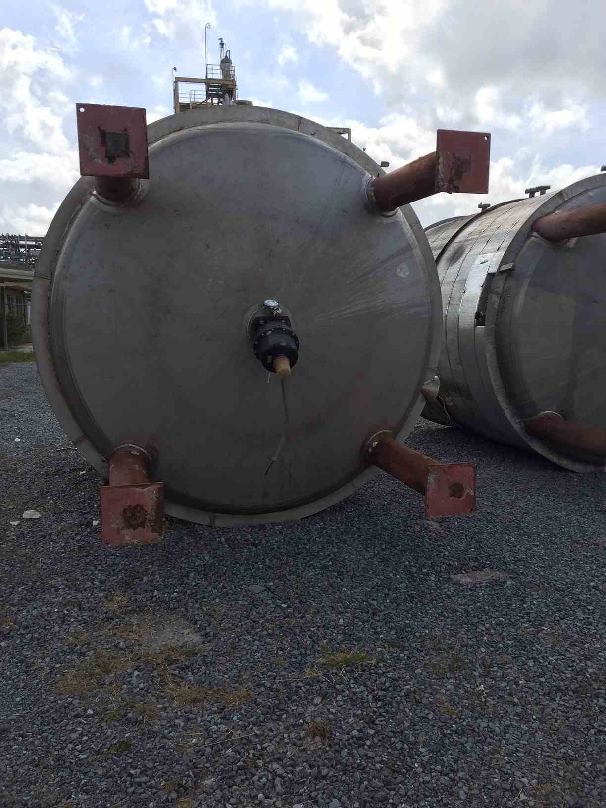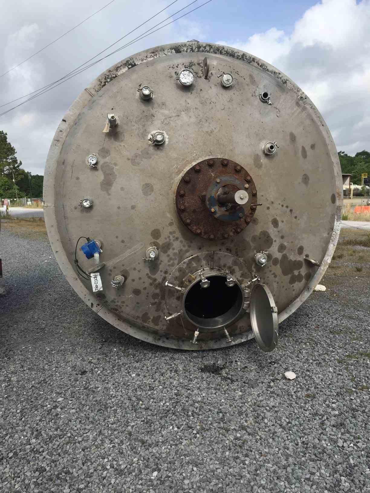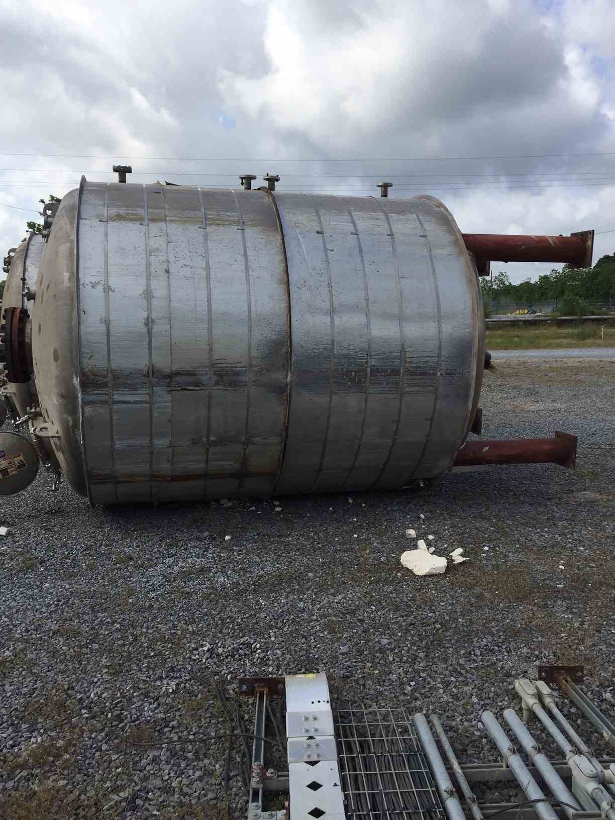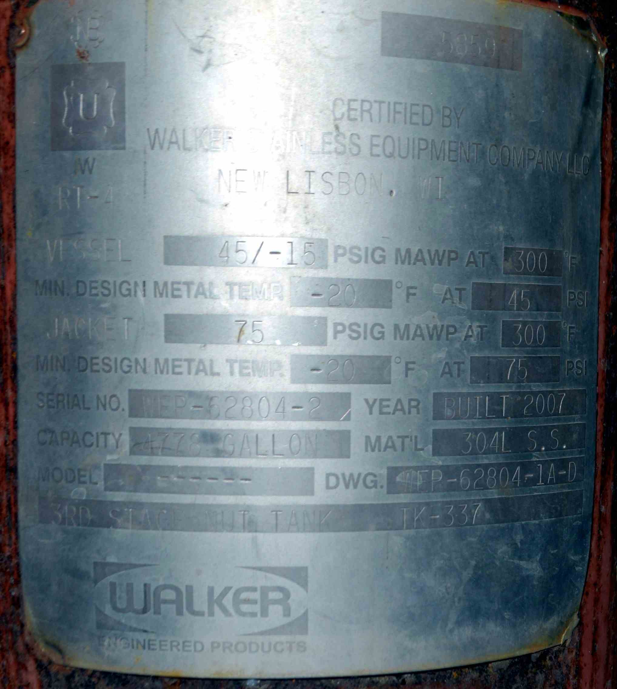 Used Walker Stainless Reactor, 4778 Gallon, 304L Stainless Steel, Vertical. Approximate 102” diameter x 114” straight side, dished top and bottom. Internal rated 45/-15 psi at -20 to 300 degrees F., 304 stainless steel dimple jacket rated 75 psi at -20 to 300 degrees F. Approximate 3” diameter shaft with multiple turbines, no agitator motor. Side wall baffles, 20" top man way, 3" center bottom outlet. Mounted on 4 carbon steel legs. National Board# 5859, serial# WEP-62804-2, built 2007.