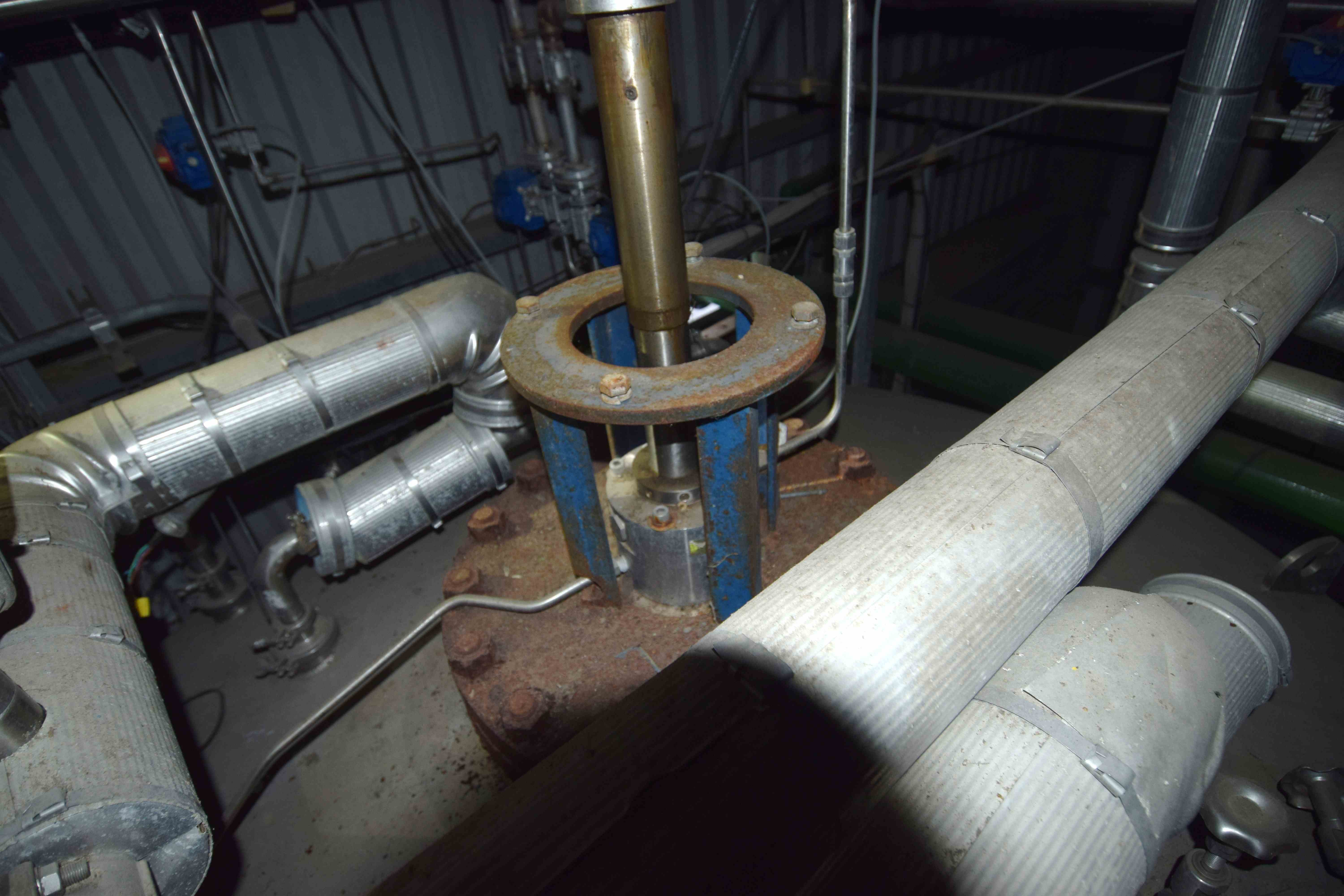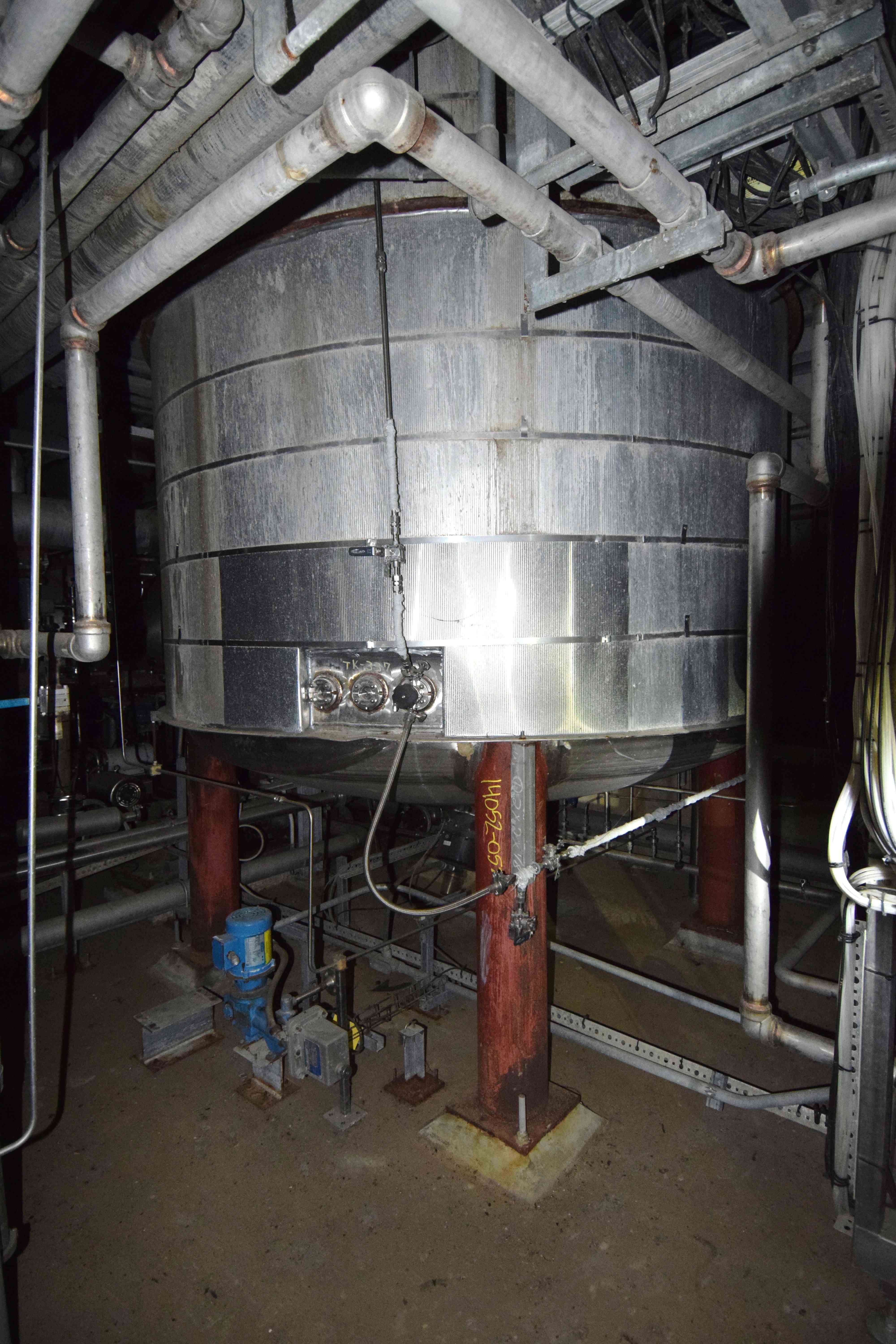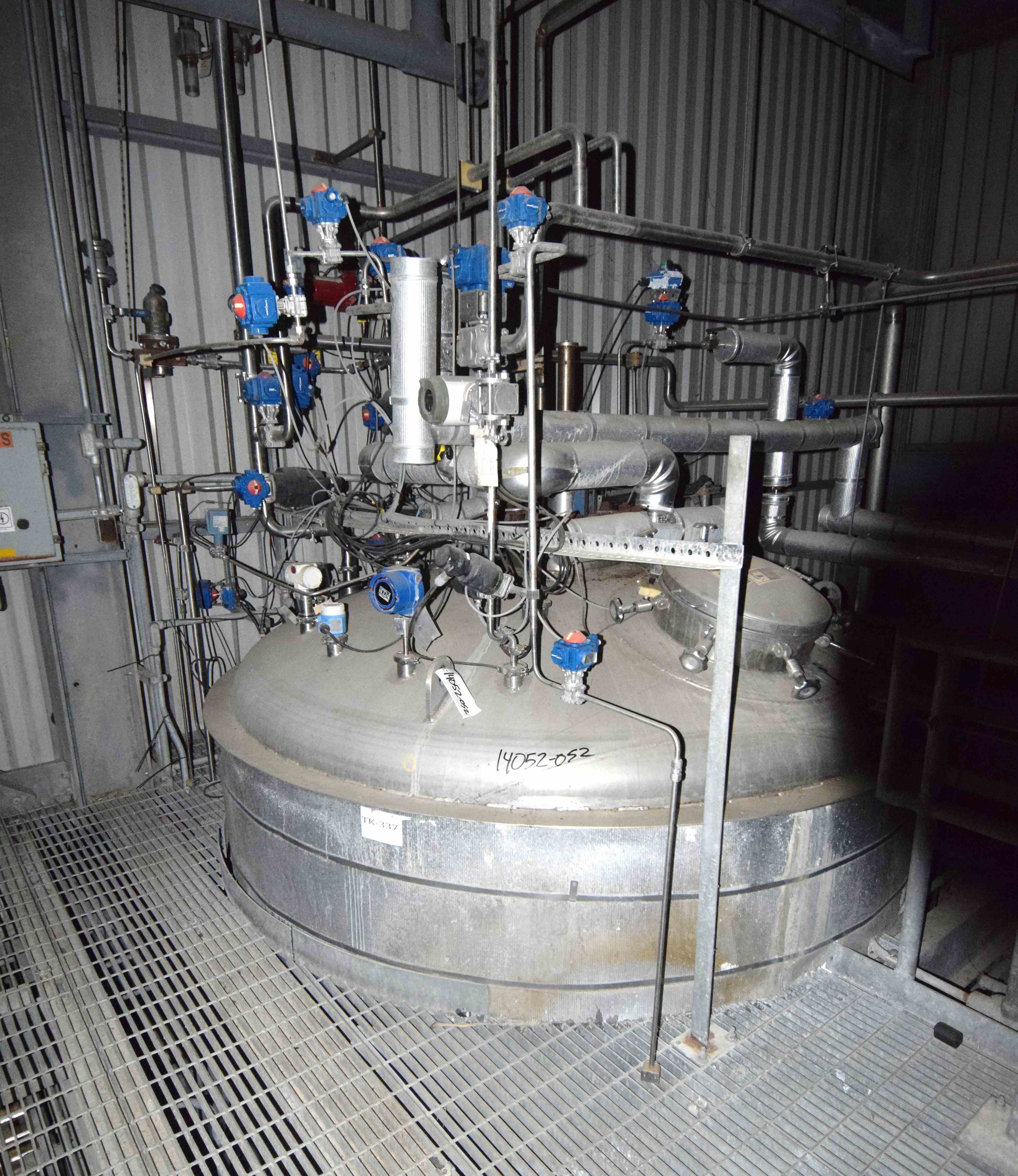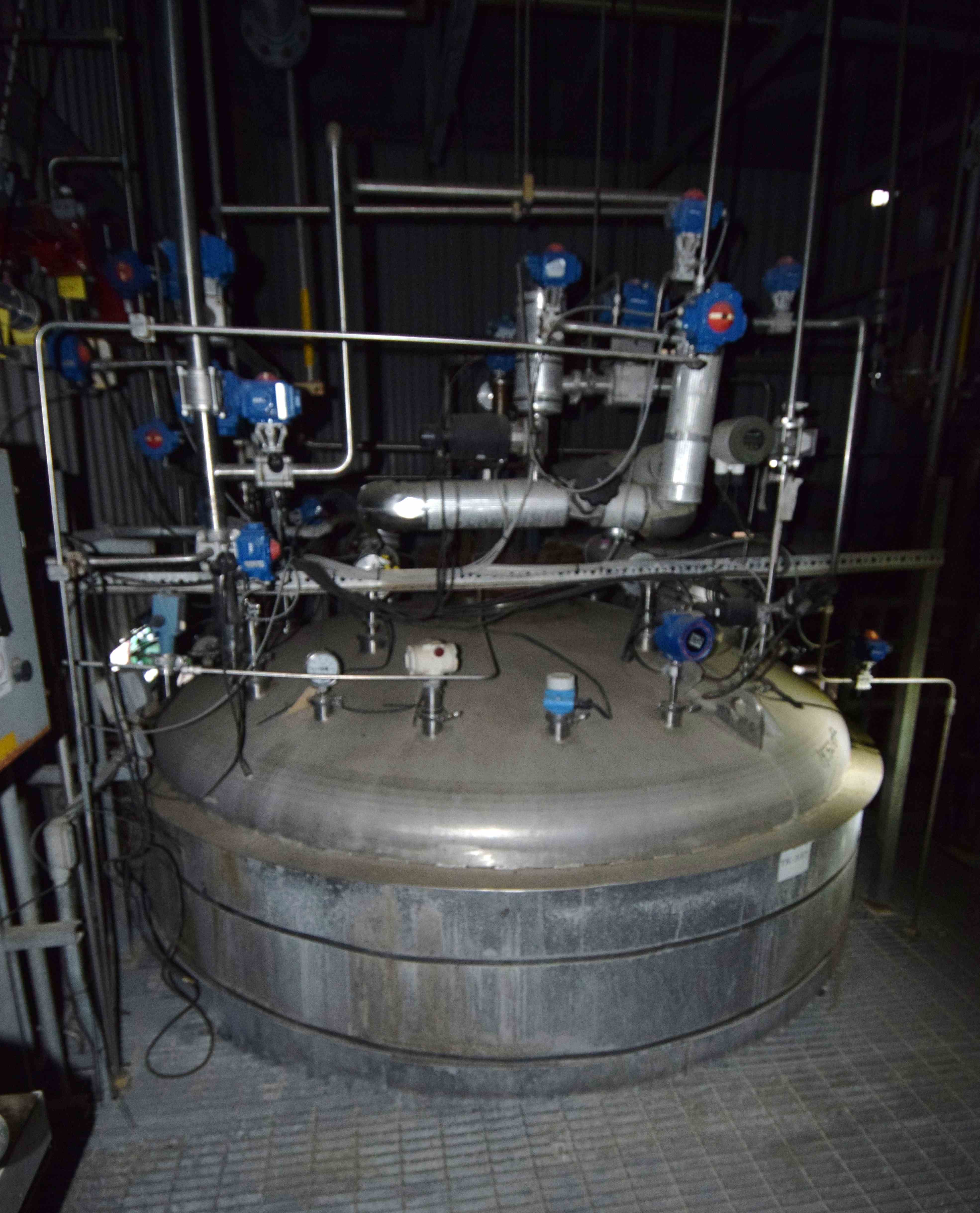 Used Walker Stainless Reactor, 4778 Gallon, 304L Stainless Steel, Vertical. Approximate 102” diameter x 114” straight side, dished top and bottom. Internal rated 45/-15 psi at -20 to 300 degrees F., 304 stainless steel dimple jacket rated 75 psi at -20 to 300 degrees F. Approximate 3” diameter shaft with multiple turbines, no agitator motor. Side wall baffles, 20" top man way, 3" center bottom outlet. Mounted on 4 carbon steel legs. National Board# 5859, serial# WEP-62804-2, built 2007.