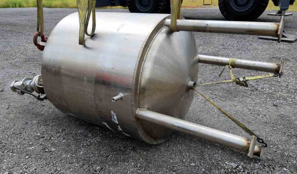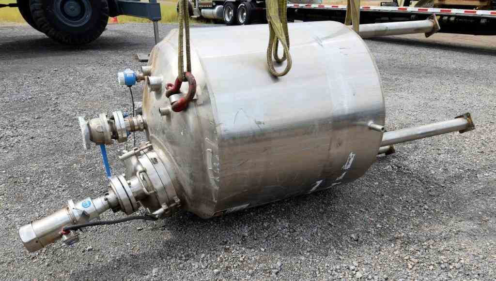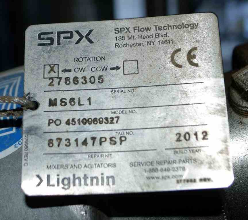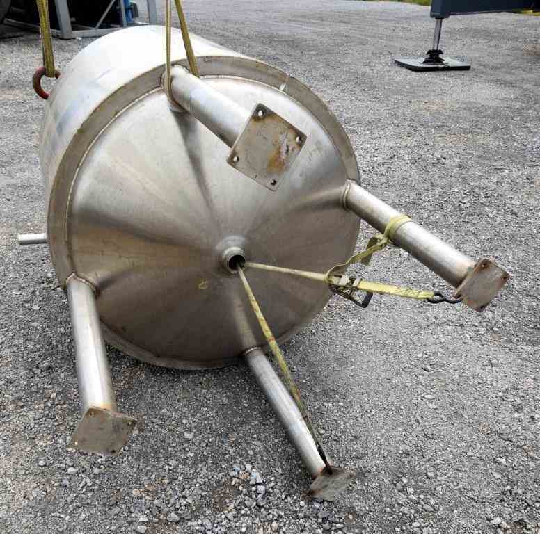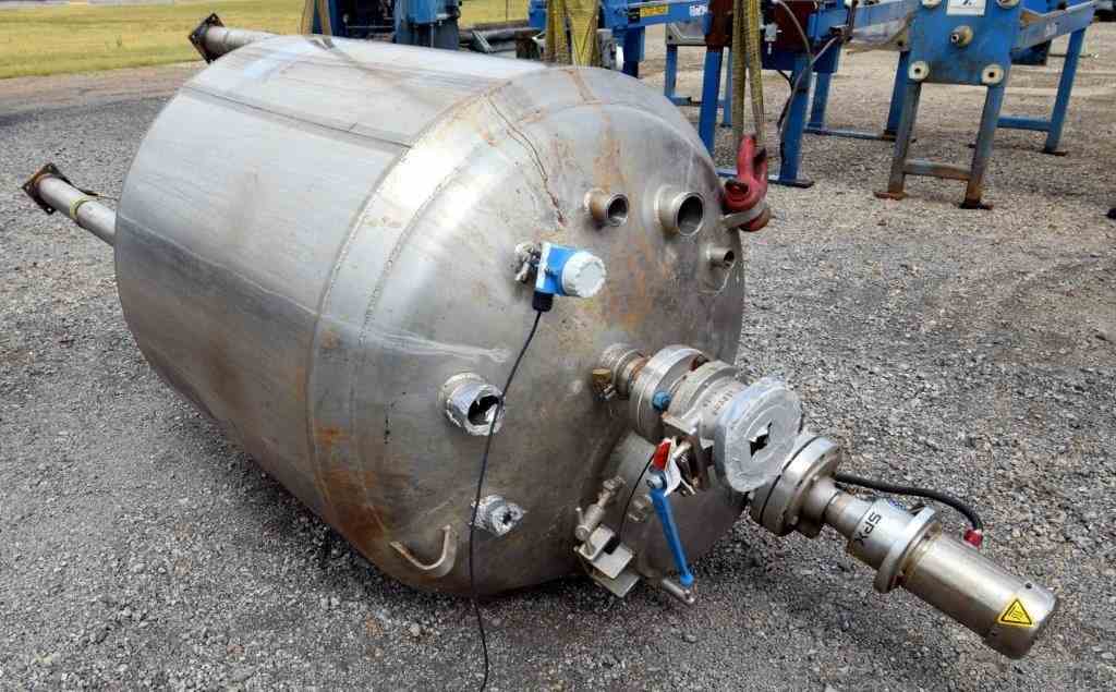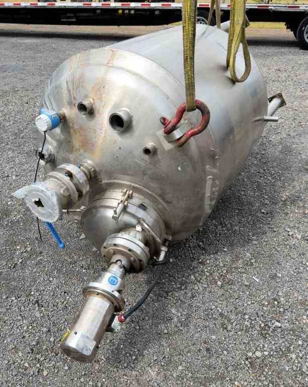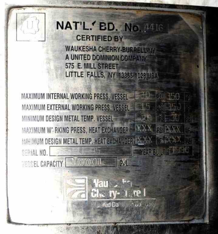 Used Waukesha Cherry-Burrell Pressure Tank, 264 Gallon, 316L Stainless Steel, Vertical. 42" Diameter x 42" straight side, dished top and bottom. Internal rated 30 psi at -20 to 350 degrees F. Off center top entering Lightnin agitator thru the manway cover model MS6L1, serial#2766305, approximate 1" diameter shaft with a 3 blade turbine, driven by a 1/2 HP, 3/60/230/460 volt, 1745 rpmm motor. Mounted on 4 stainless steel legs. National Board# 4416, serial# E-341-95, built 1996.