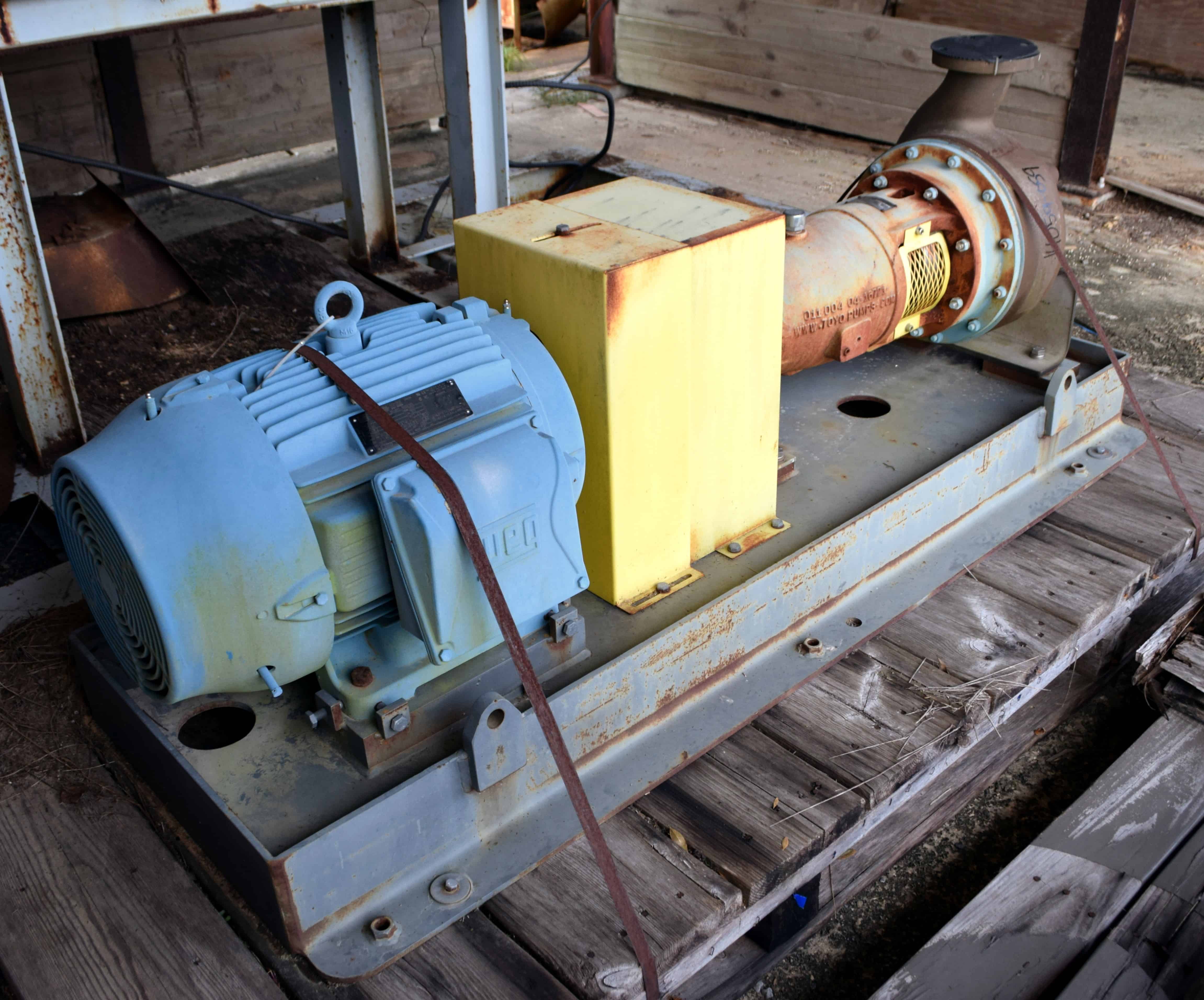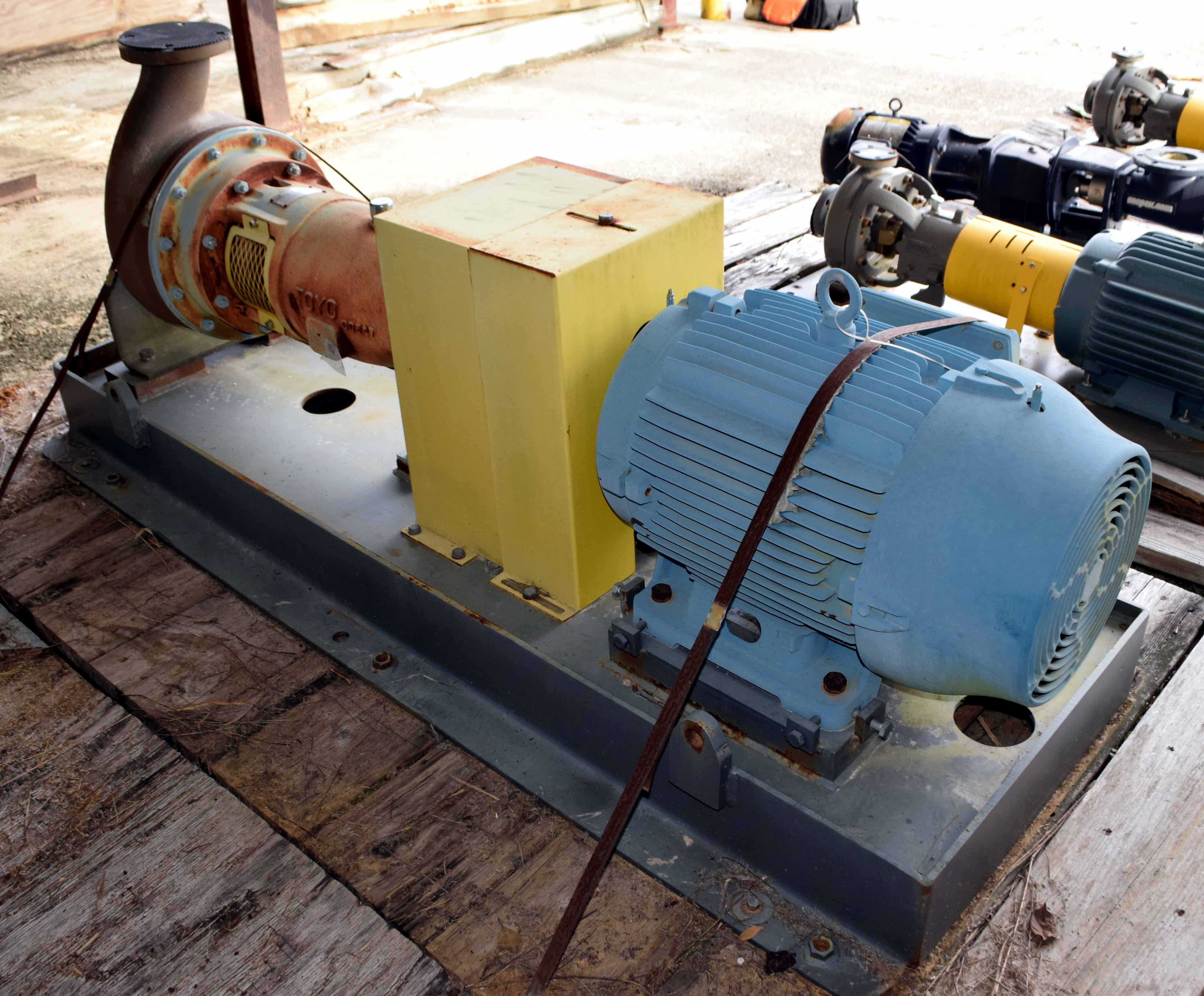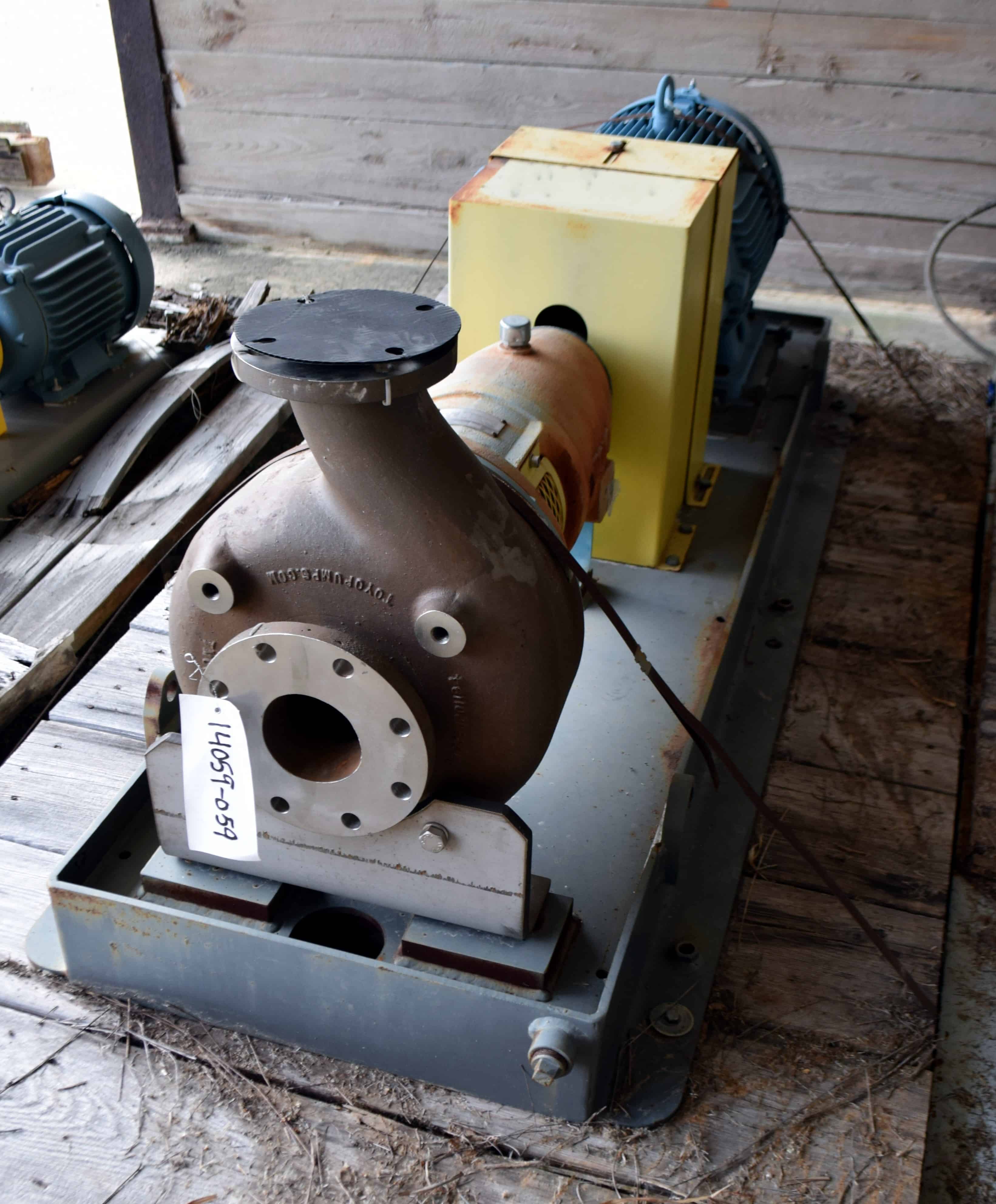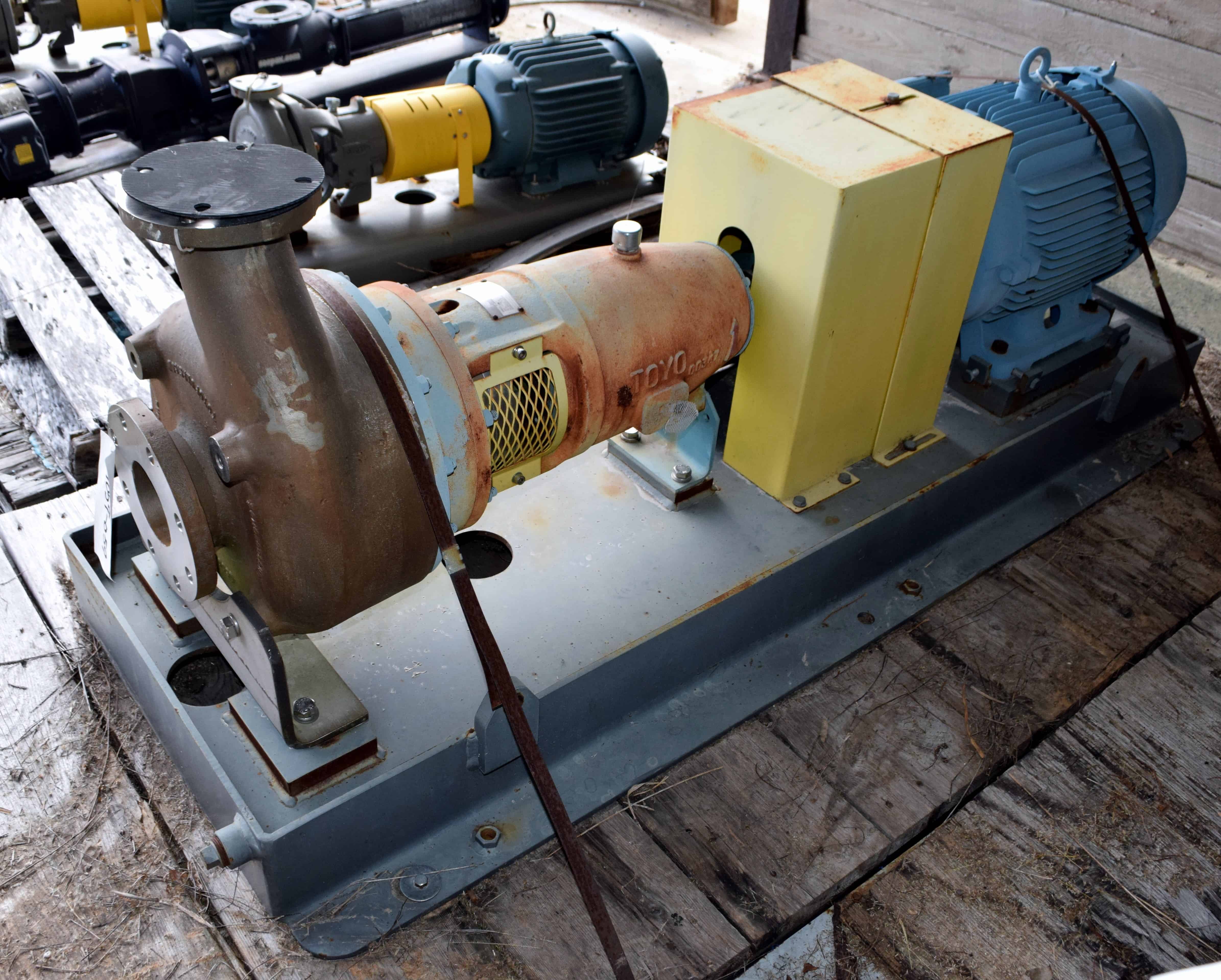 Unused Toyo Centrifugal Pump, Model DEH-72-80-PF4-CD4-D#, Stainless Steel. Rated 200 gallons per minute at 126’ head at 1660 rpm. 4” Inlet, 3” outlet, impeller diameter 11.1”, maximum solid size 1.2”. Driven by a 40hp, 3/60/460 volt, 1775 rpm XP motor. Base mounted. Serial# D-300094.