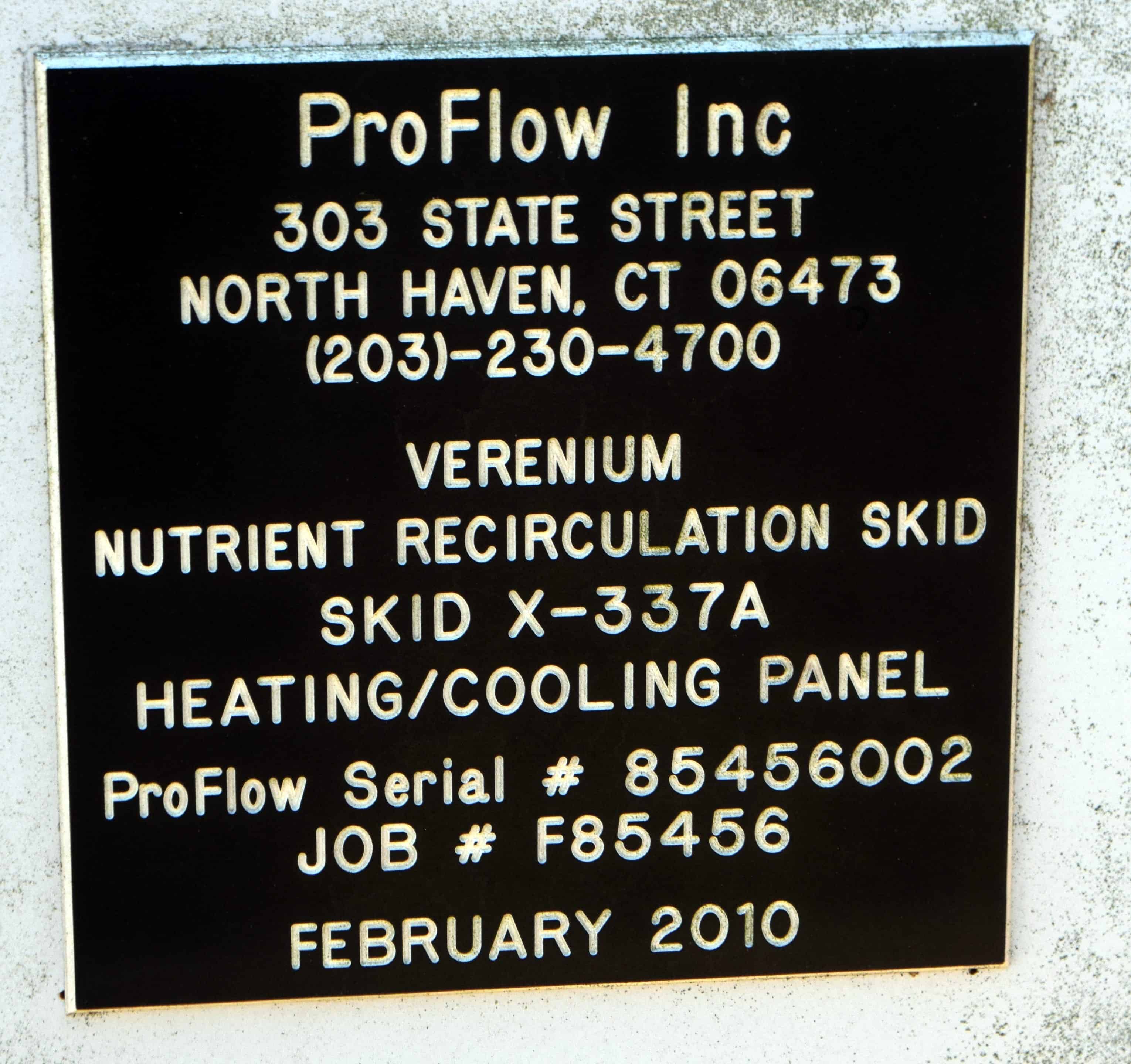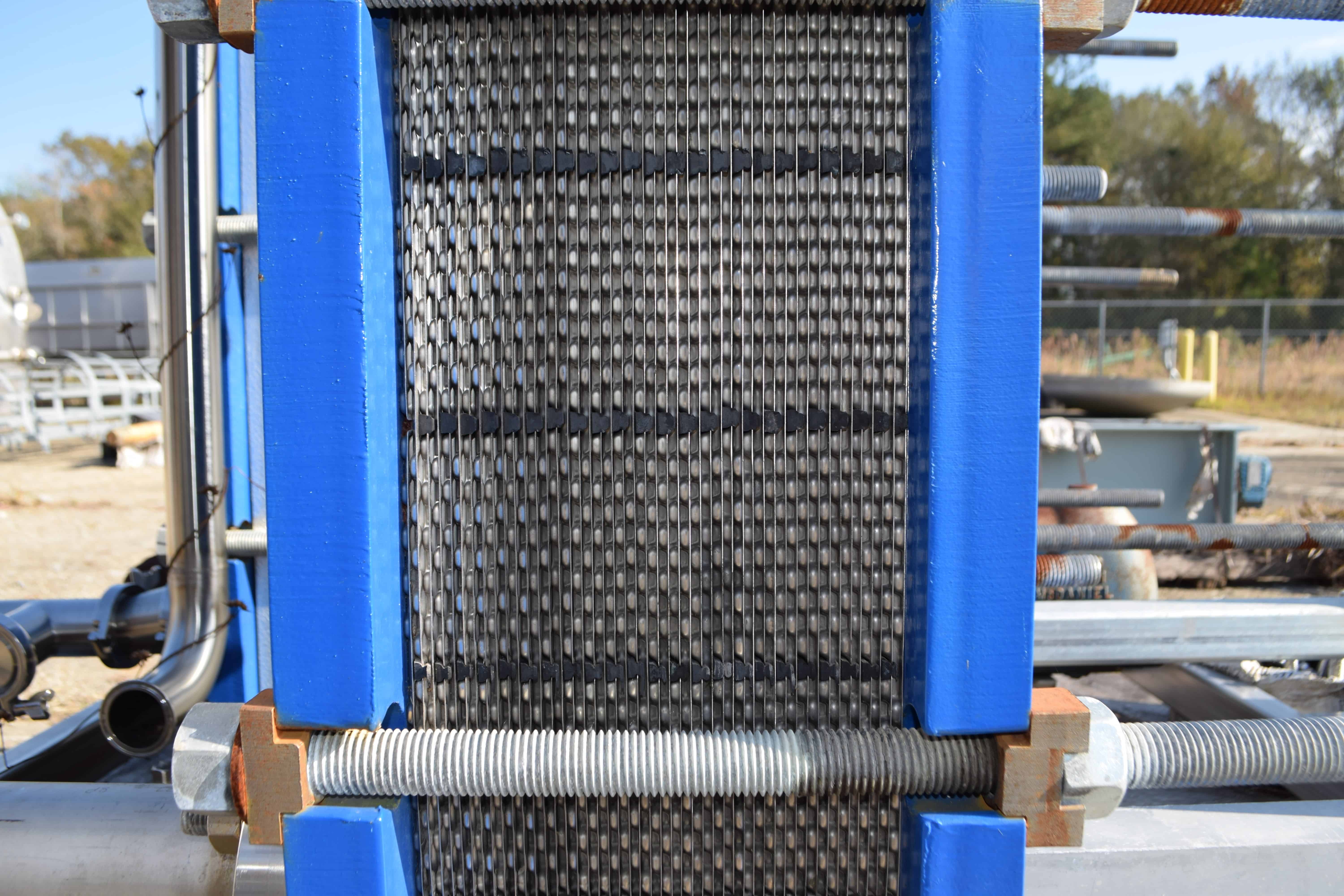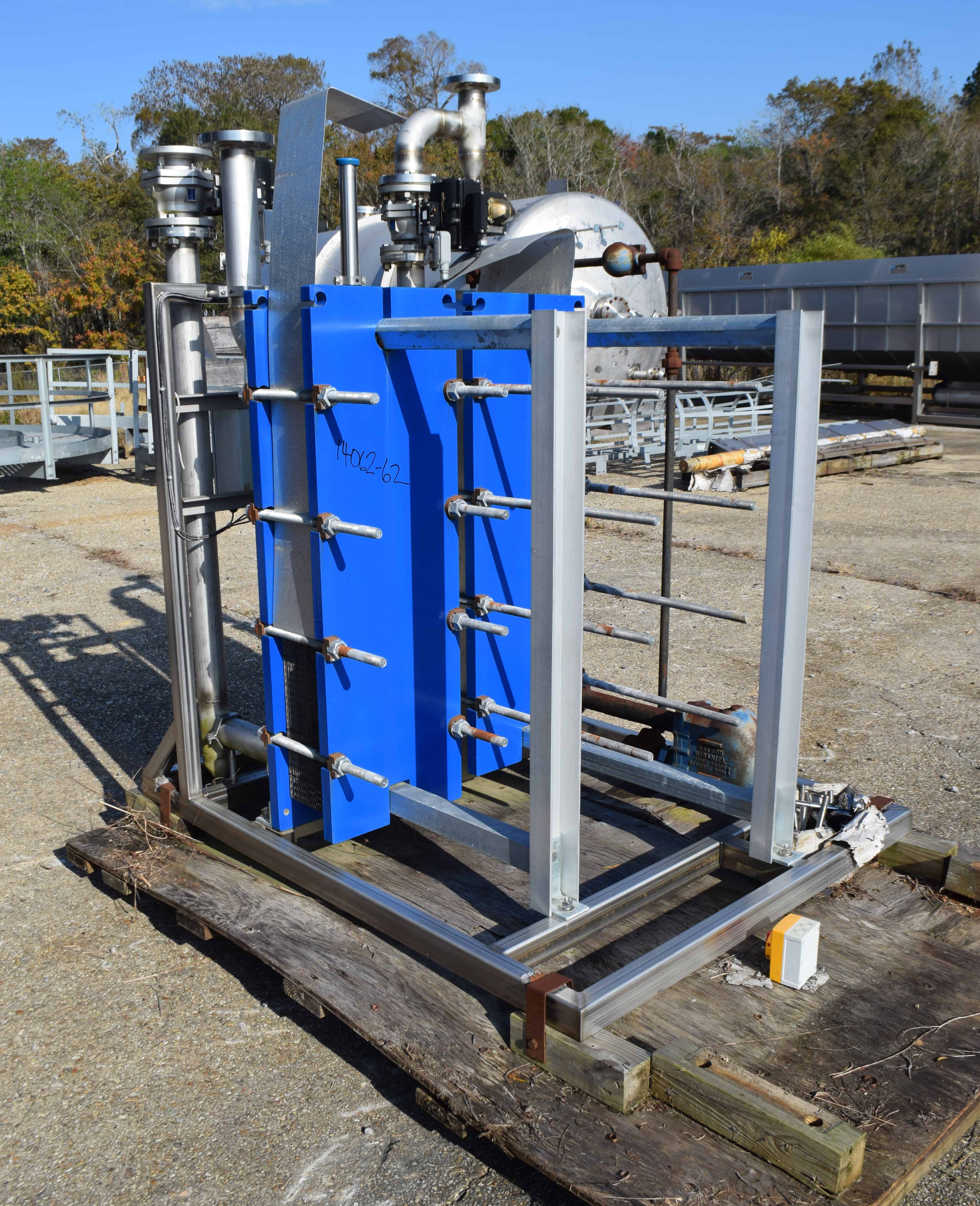 Unused ProFlow Heating & Cooling Skid, 544 Total Square Feet. Consisting of: (1) API Schmidt heating plate & frame heat exchanger, 372 square feet, model S36-1250-99, National Board# 8002, serial# NP091066-102, built 2010. Hot & cold side rated 150 psi at 32 to 300 degrees F., carbon steel frame, 316L stainless steel plates, 3” flange & sanitary connections. (1) API Schmidt cooling plate & frame heat exchanger, 172 square feet, model S36-750-47, National Board# 8035, serial# NP091066-202, built 2010. Hot & cold side rated 150 psi at 32 to 300 degrees F., carbon steel frame, 316L stainless steel plates, 3” flange & sanitary connections. Mounted on a stainless steel frame.