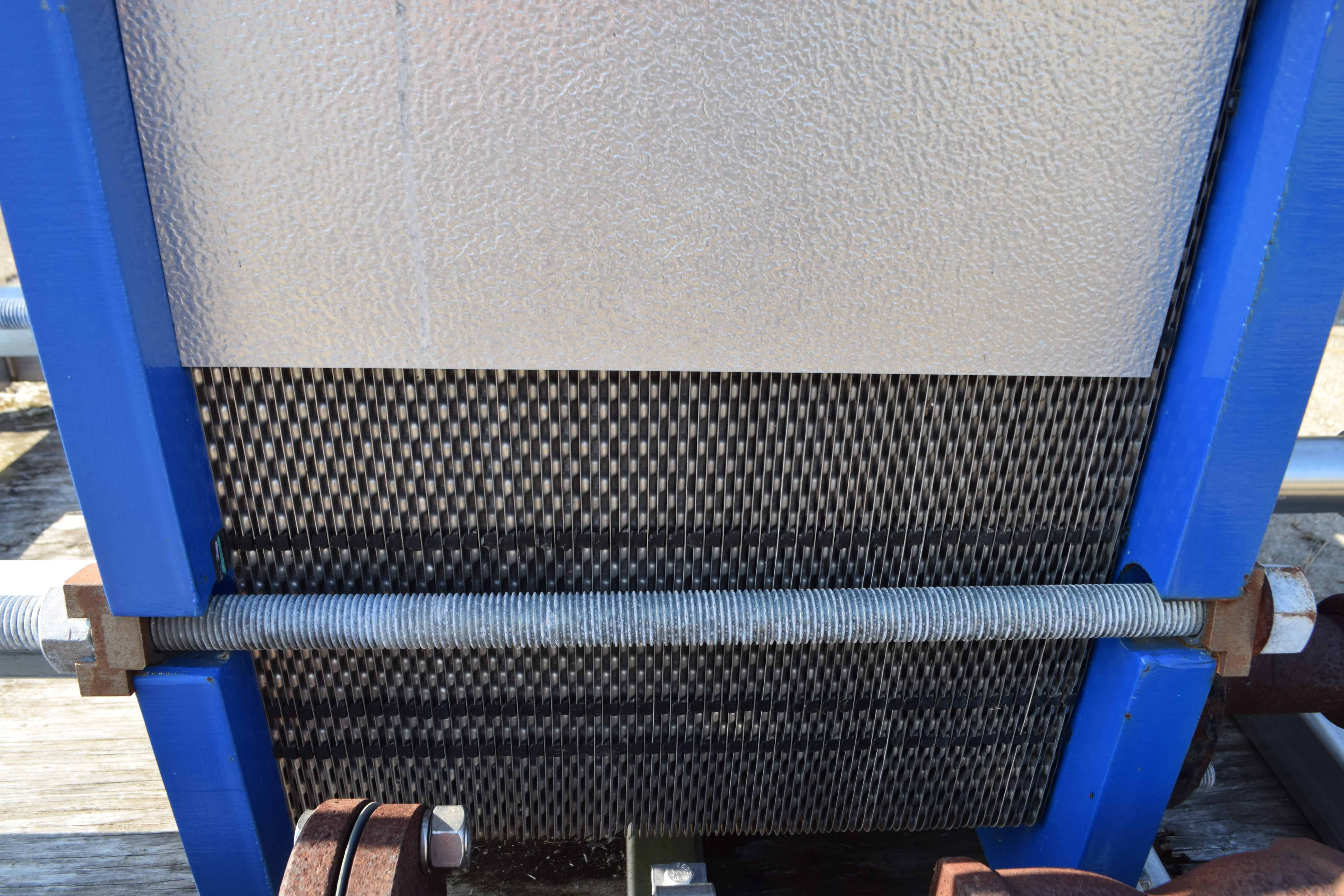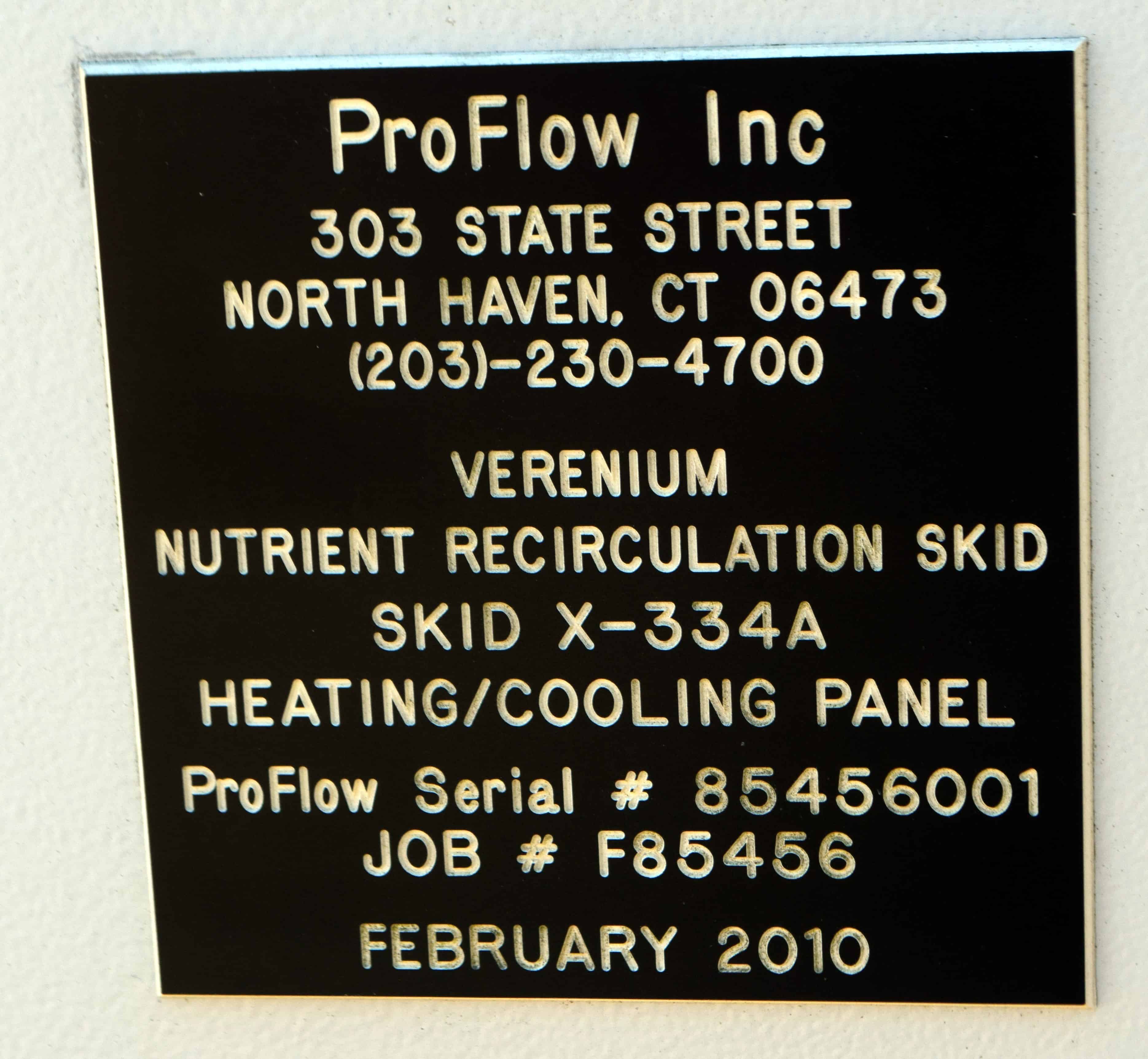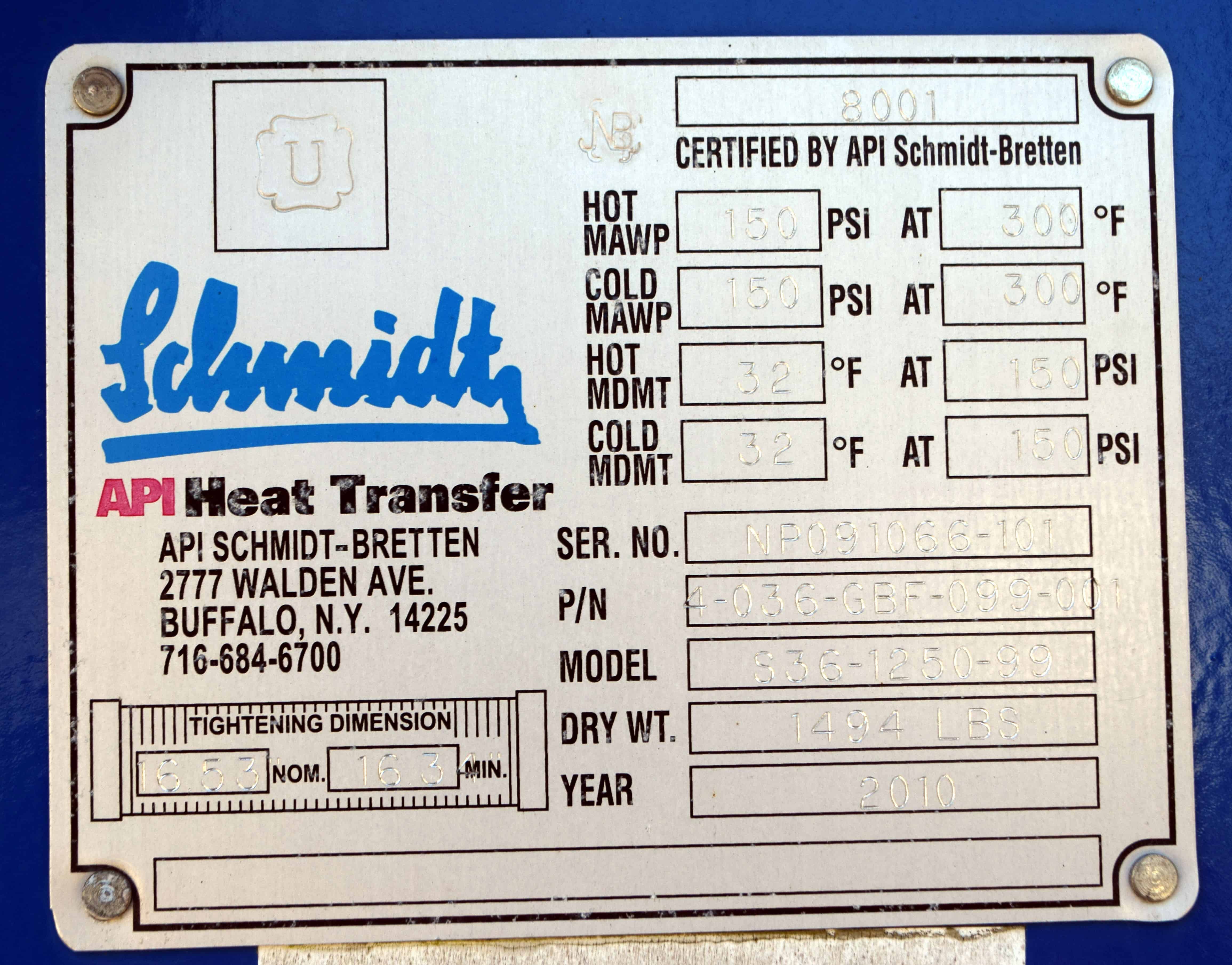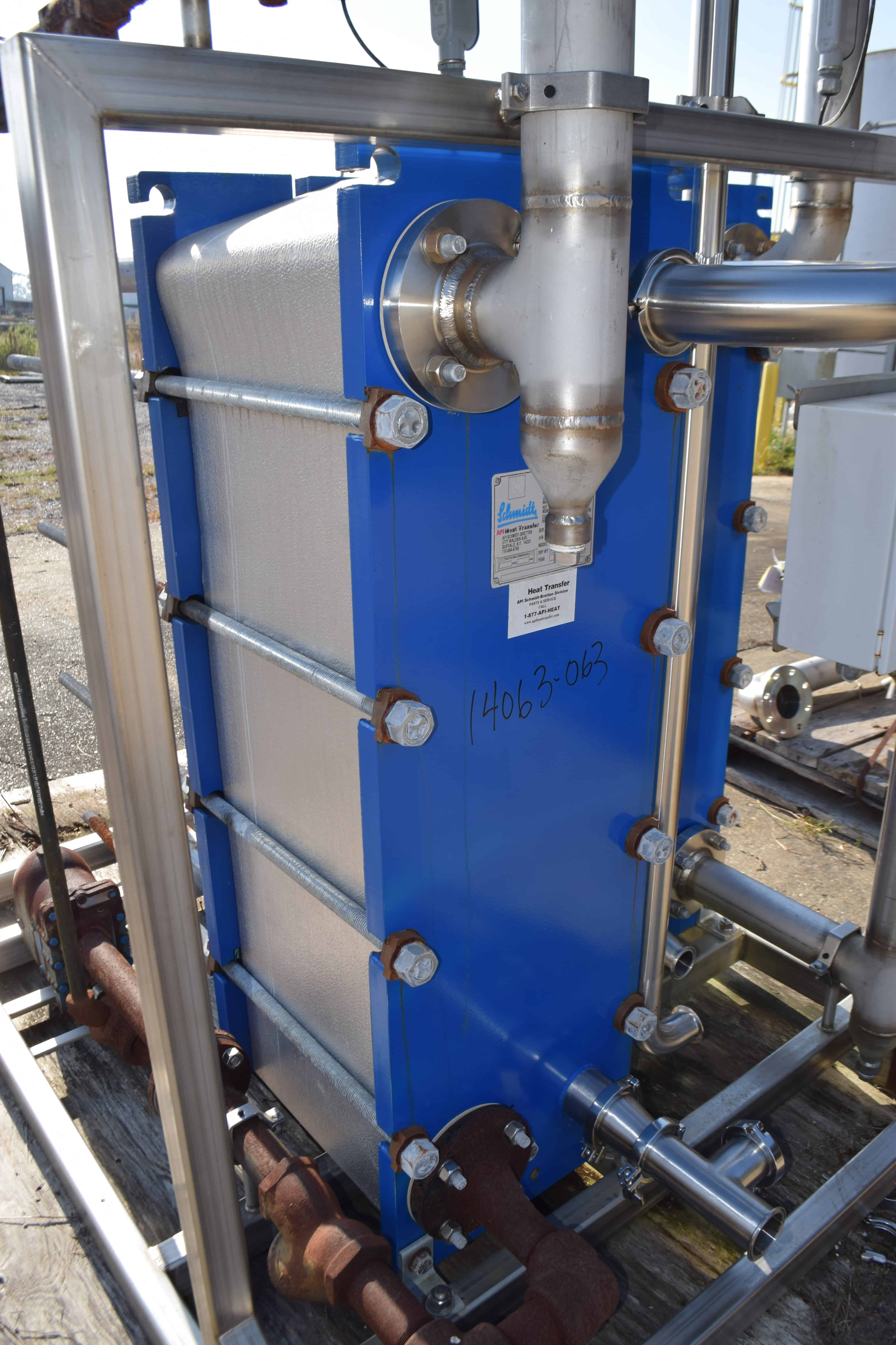 Unused ProFlow Heating & Cooling Skid, 544 Total Square Feet. Consisting of: (1) API Schmidt heating plate & frame heat exchanger, 372 square feet, model S36-1250-99, National Board# 8001, serial# NP091066-101, built 2010. Hot & cold side rated 150 psi at 32 to 300 degrees F., carbon steel frame, 316L stainless steel plates, 3” flange & sanitary connections. (1) API Schmidt cooling plate & frame heat exchanger, 172 square feet, model S36-750-47, National Board# 8034, serial# NP091066-201, built 2010. Hot & cold side rated 150 psi at 32 to 300 degrees F., carbon steel frame, 316L stainless steel plates, 3” flange & sanitary connections. Mounted on a stainless steel frame.