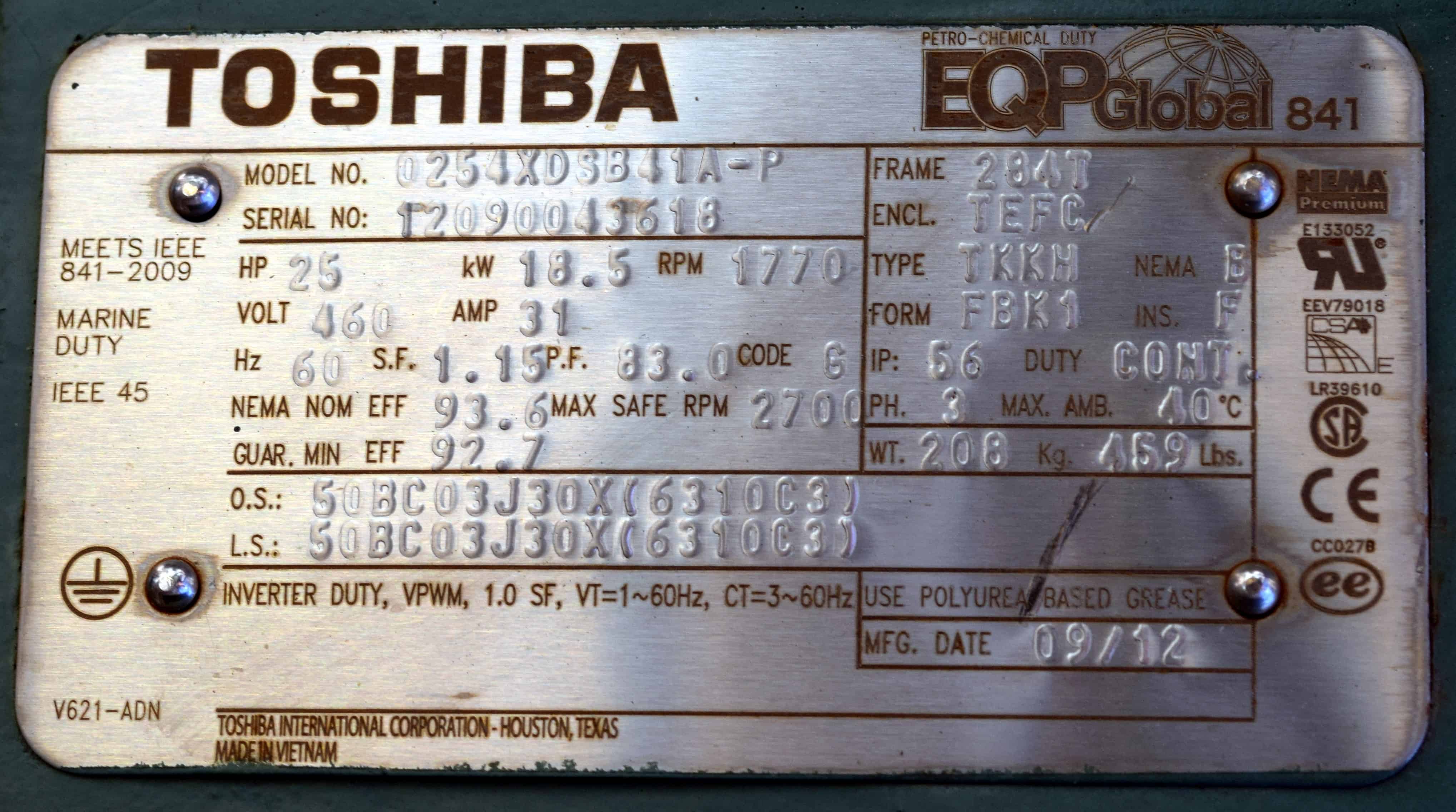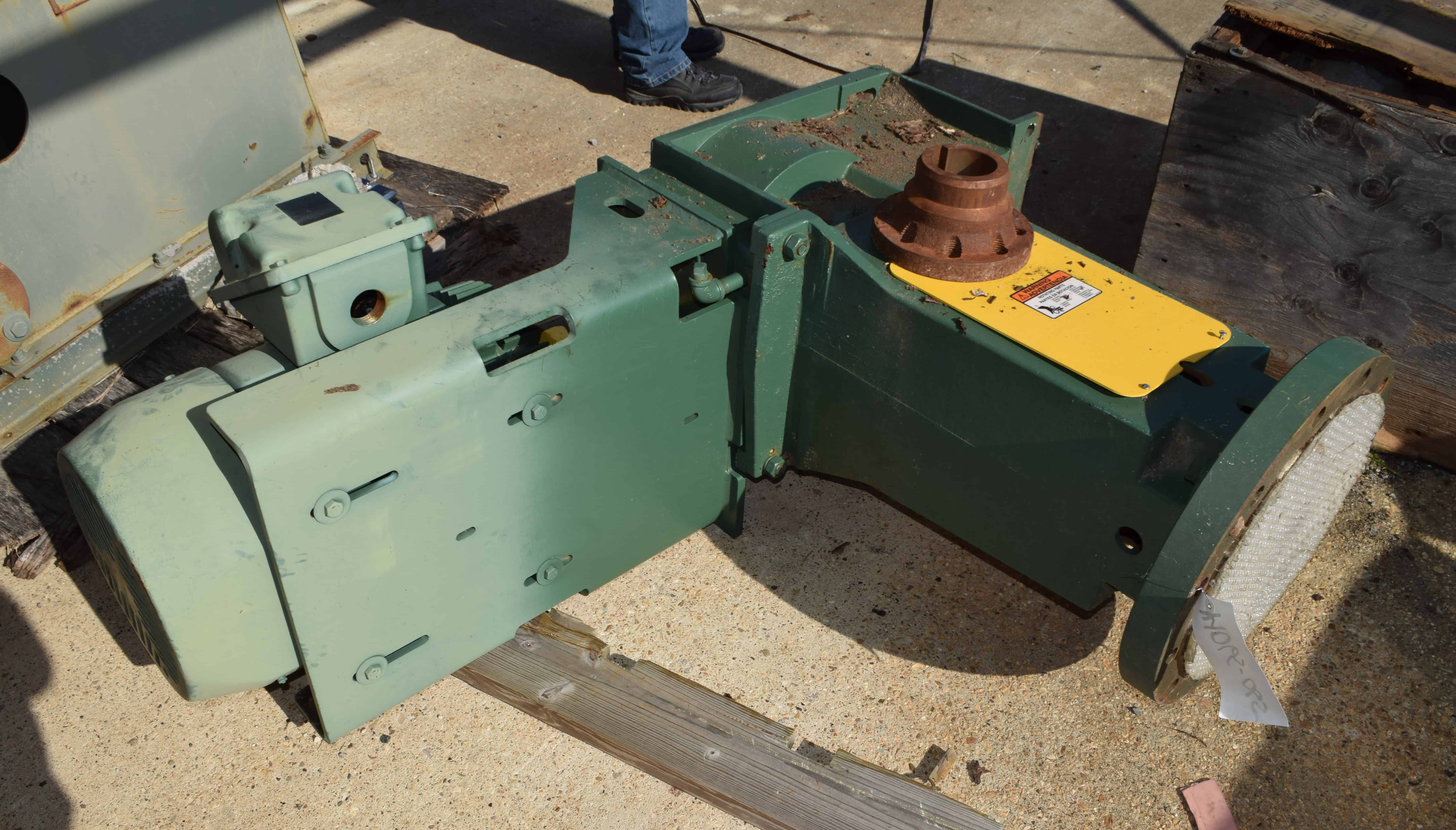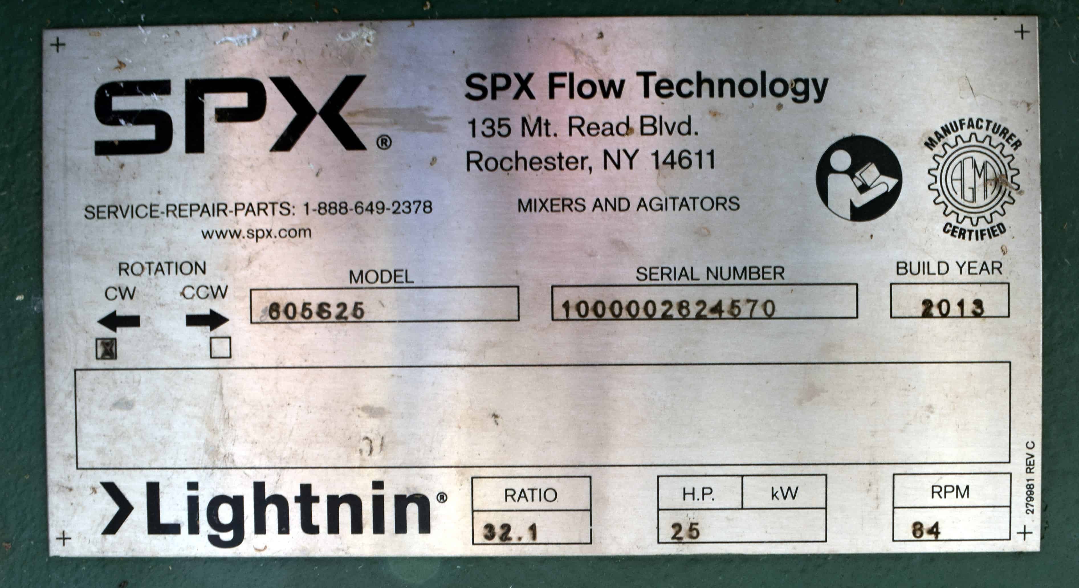 Unused Lightnin Top Entering Agitator, Model 605S25. Ratio 32.1 to 1, output rpm 84. Approximate 19-18” O.D. mounting flange with (12) bolt holes on approximate 4-1/2” centers. Serial# 1000002824570, built 2013. Includes an approximate 3-1/2” diameter x 124” long bolt together stainless steel shaft with (6) bolt on turbine blades. Driven by a 25hp, 3/60/460 volt, 1770 rpm motor
