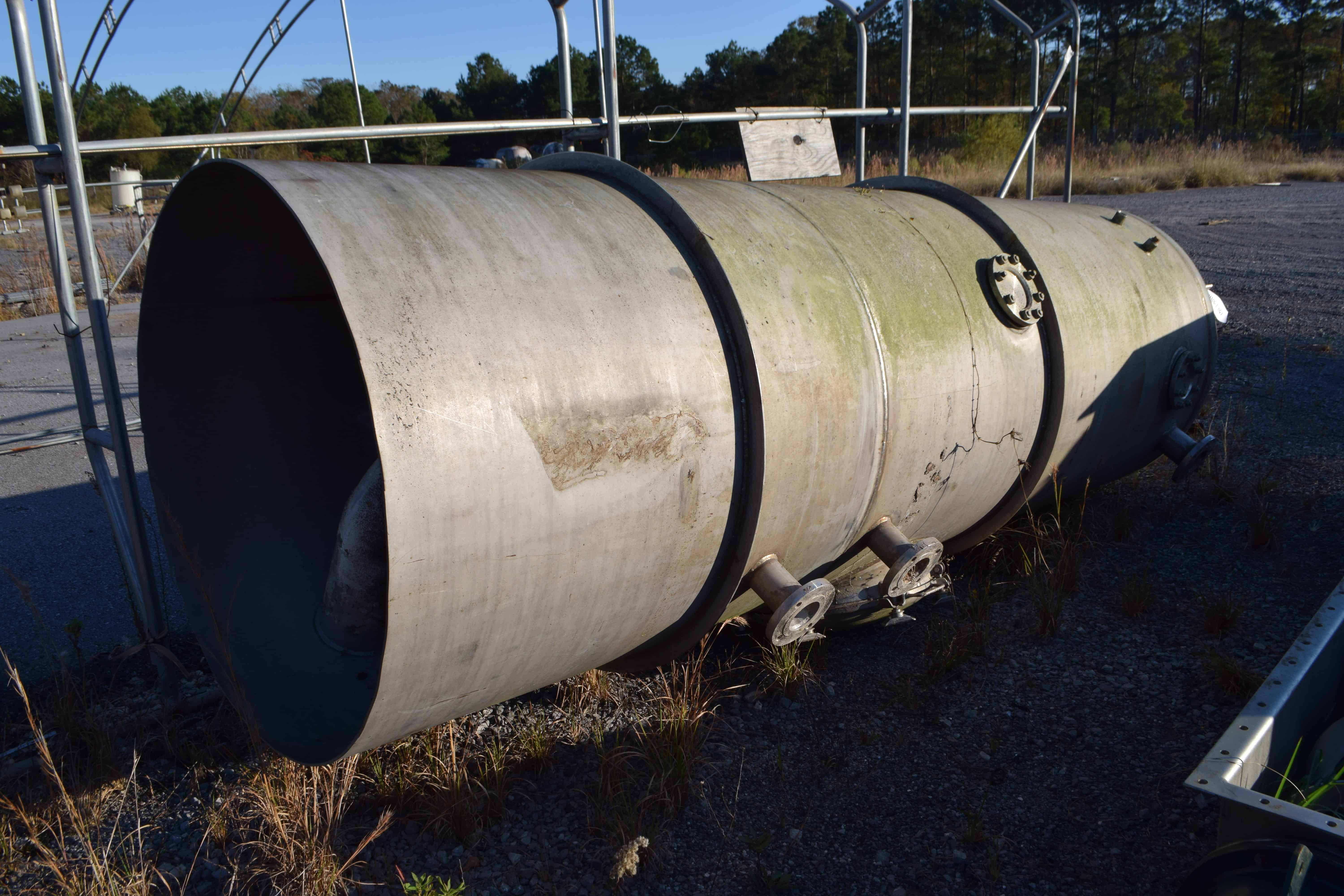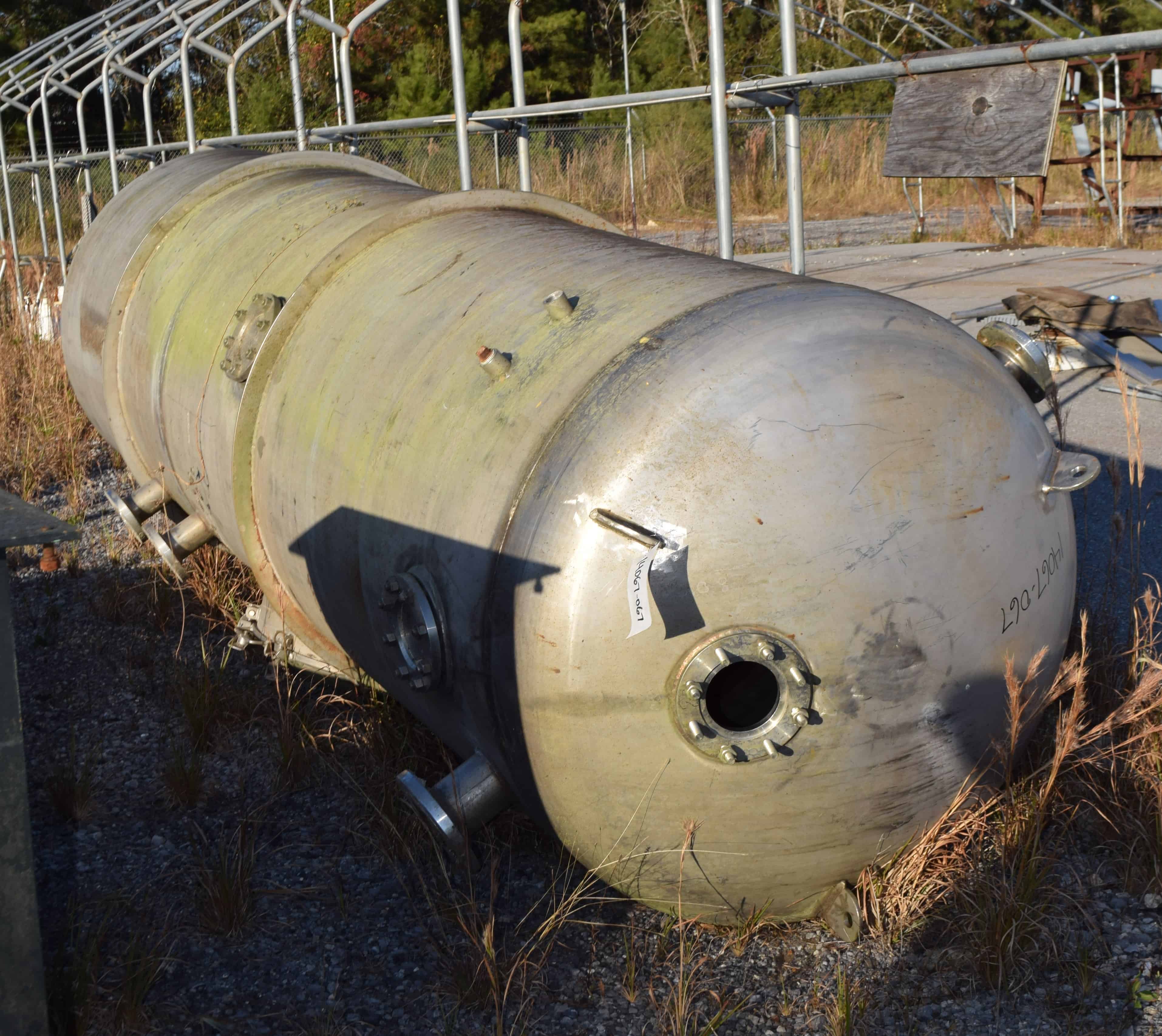 Used Tank, Approximate 700 Gallon, Stainless Steel, Vertical. Approximate 48” diameter x 90” straight side, dished top, flat bottom. Side man way, bottom outlet. Skirt mounted. No manufacturers tag.