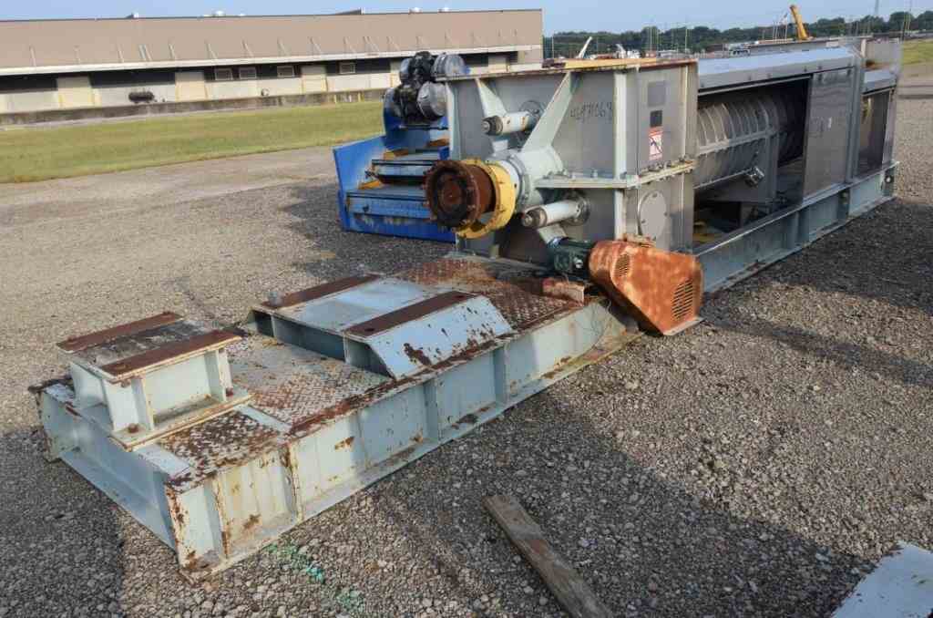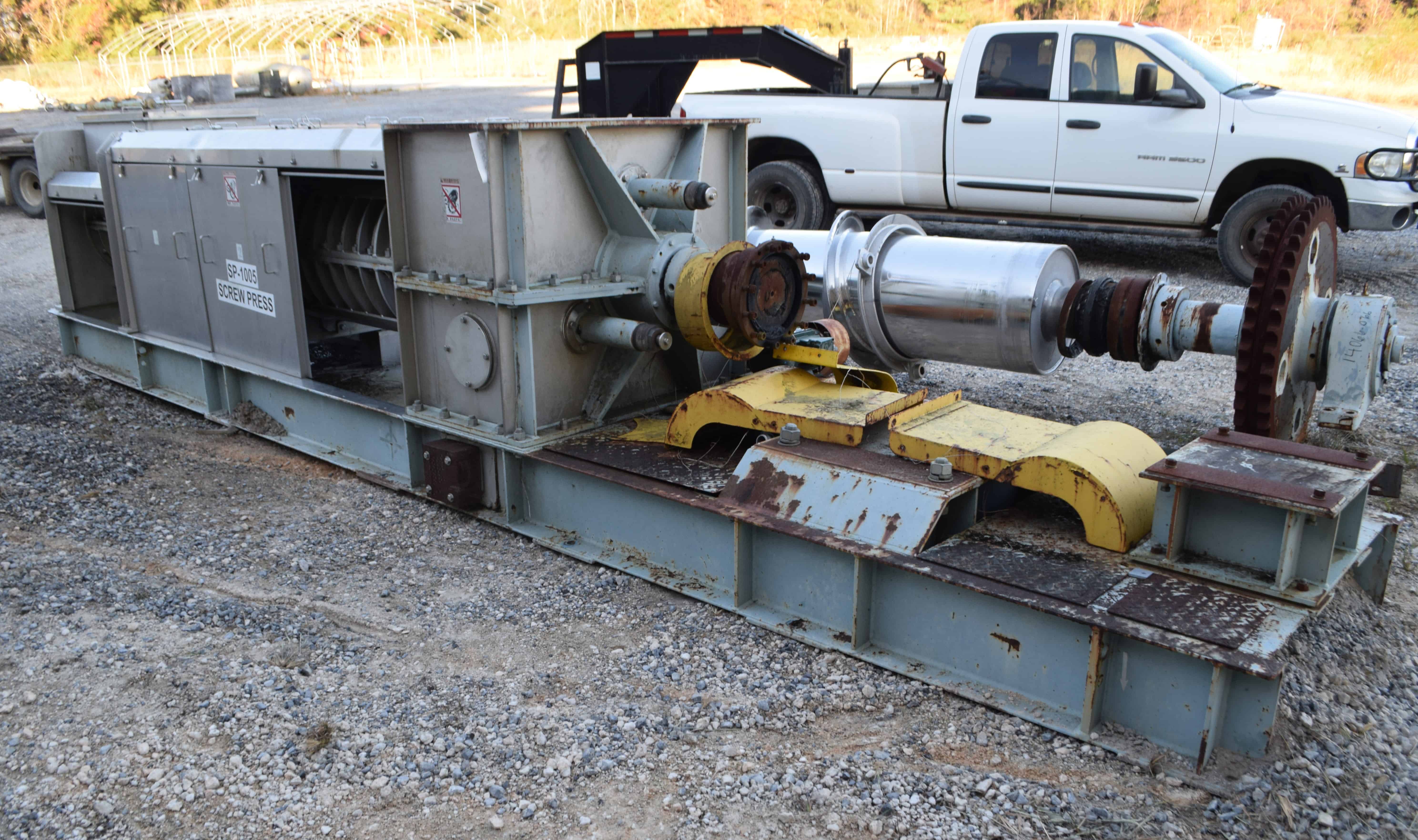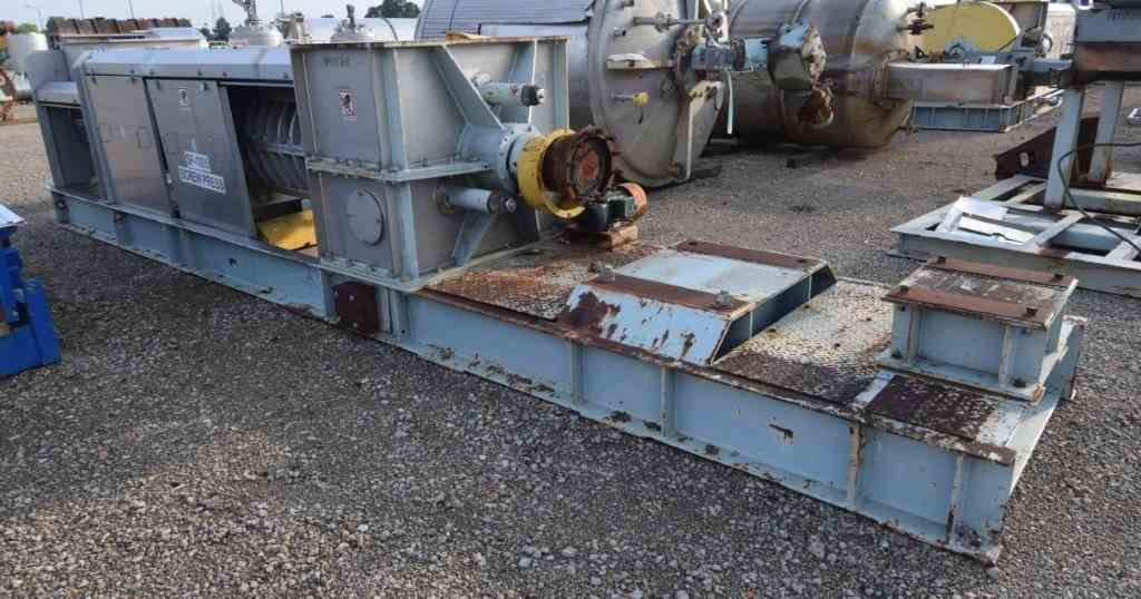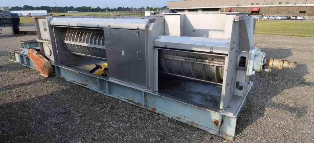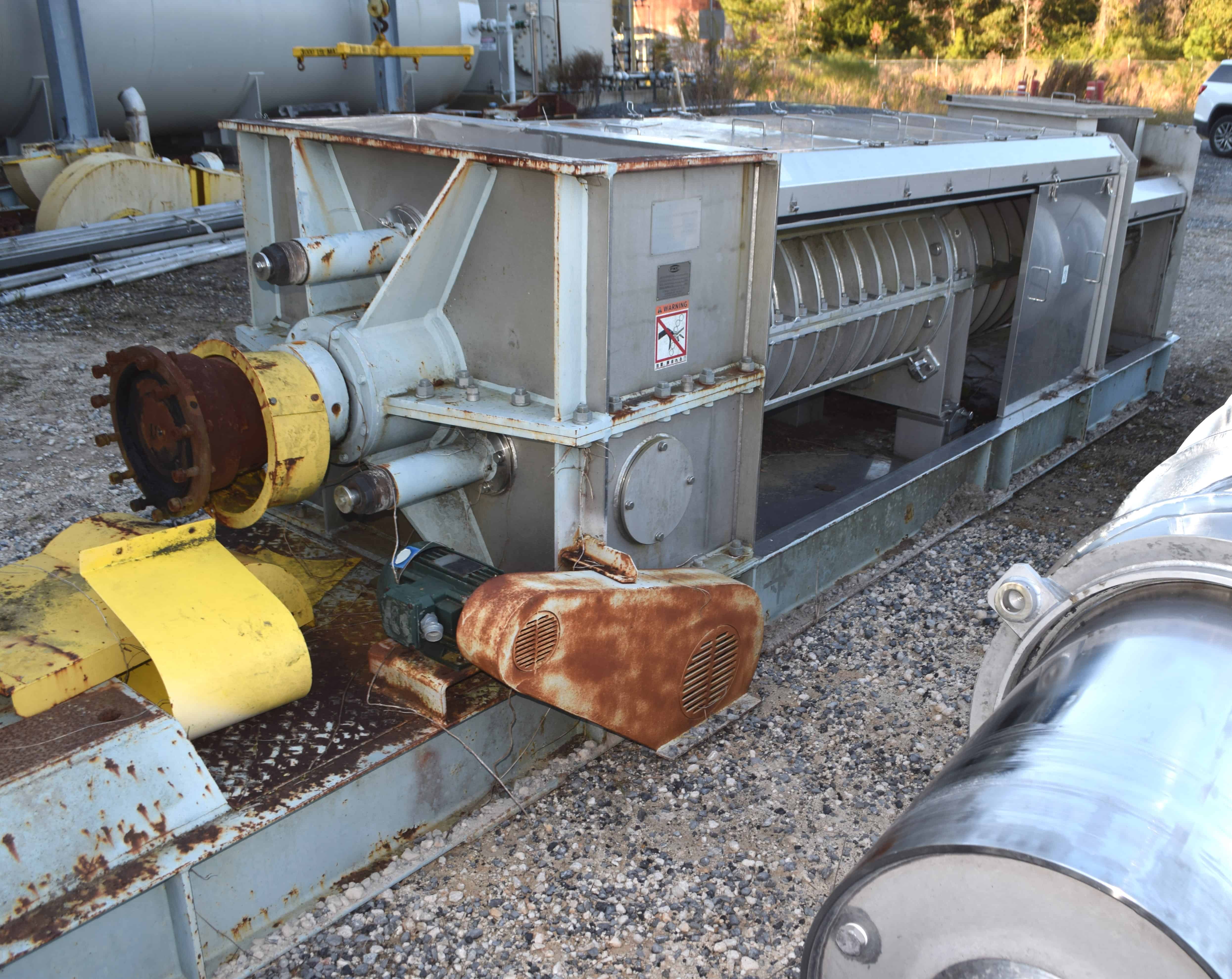 Used- FKC Screw Press, Model SHX-600X3500L, 304 Stainless Steel. Approximate capacity 35-90 kg/hr, depending on product, maximum pressure 0.7 MPa. Approximate 600mm diameter x 3500mm long screw. Top end feed, bottom end discharge, bottom drip pan. Requires drive and reducer.
