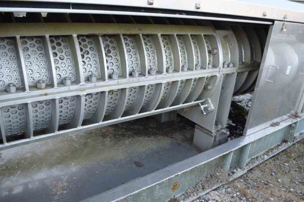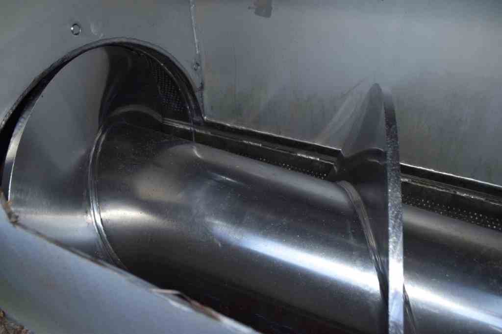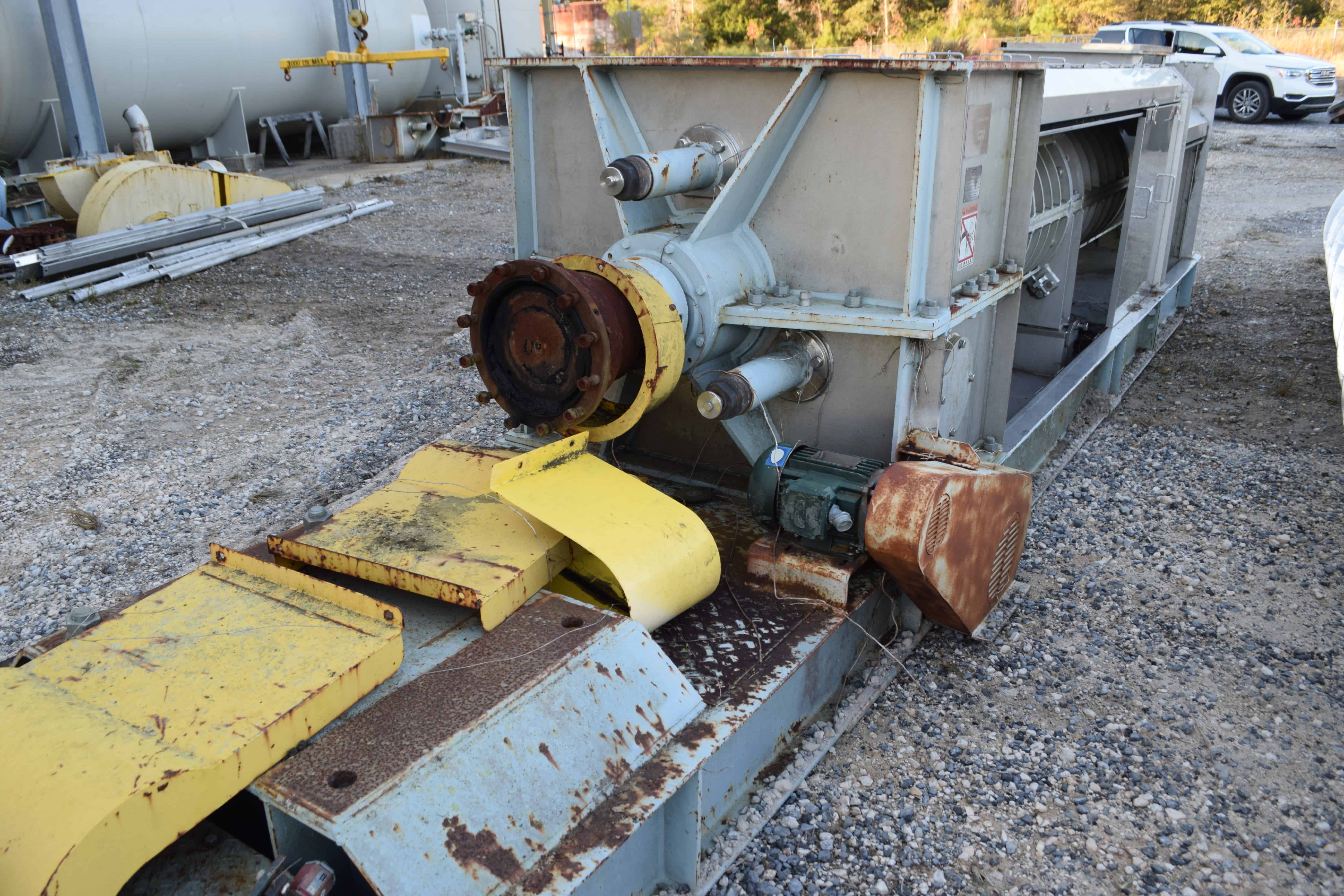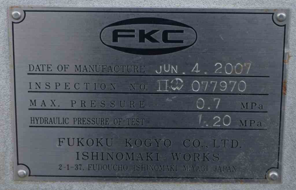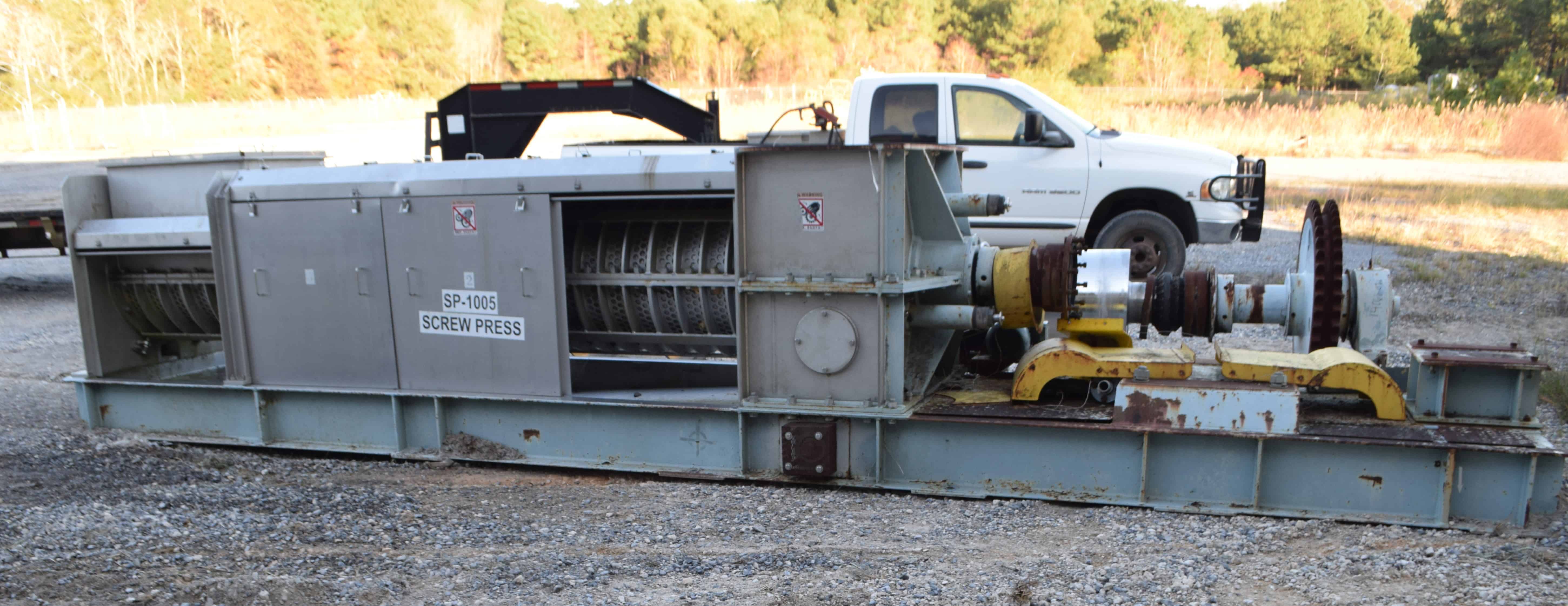 Used- FKC Screw Press, Model SHX-600X3500L, 304 Stainless Steel. Approximate capacity 35-90 kg/hr, depending on product, maximum pressure 0.7 MPa. Approximate 600mm diameter x 3500mm long screw. Top end feed, bottom end discharge, bottom drip pan. Requires drive and reducer.
