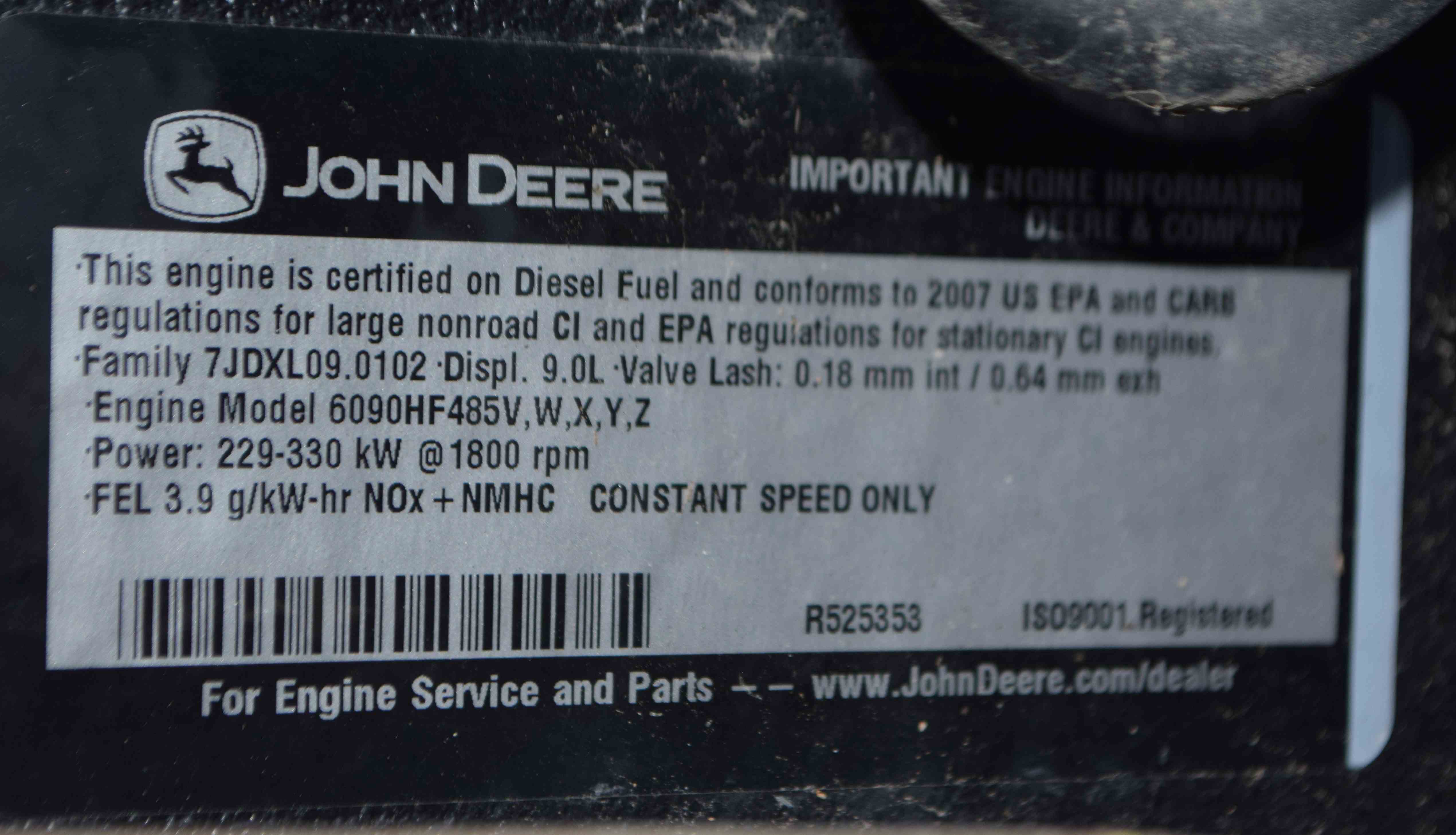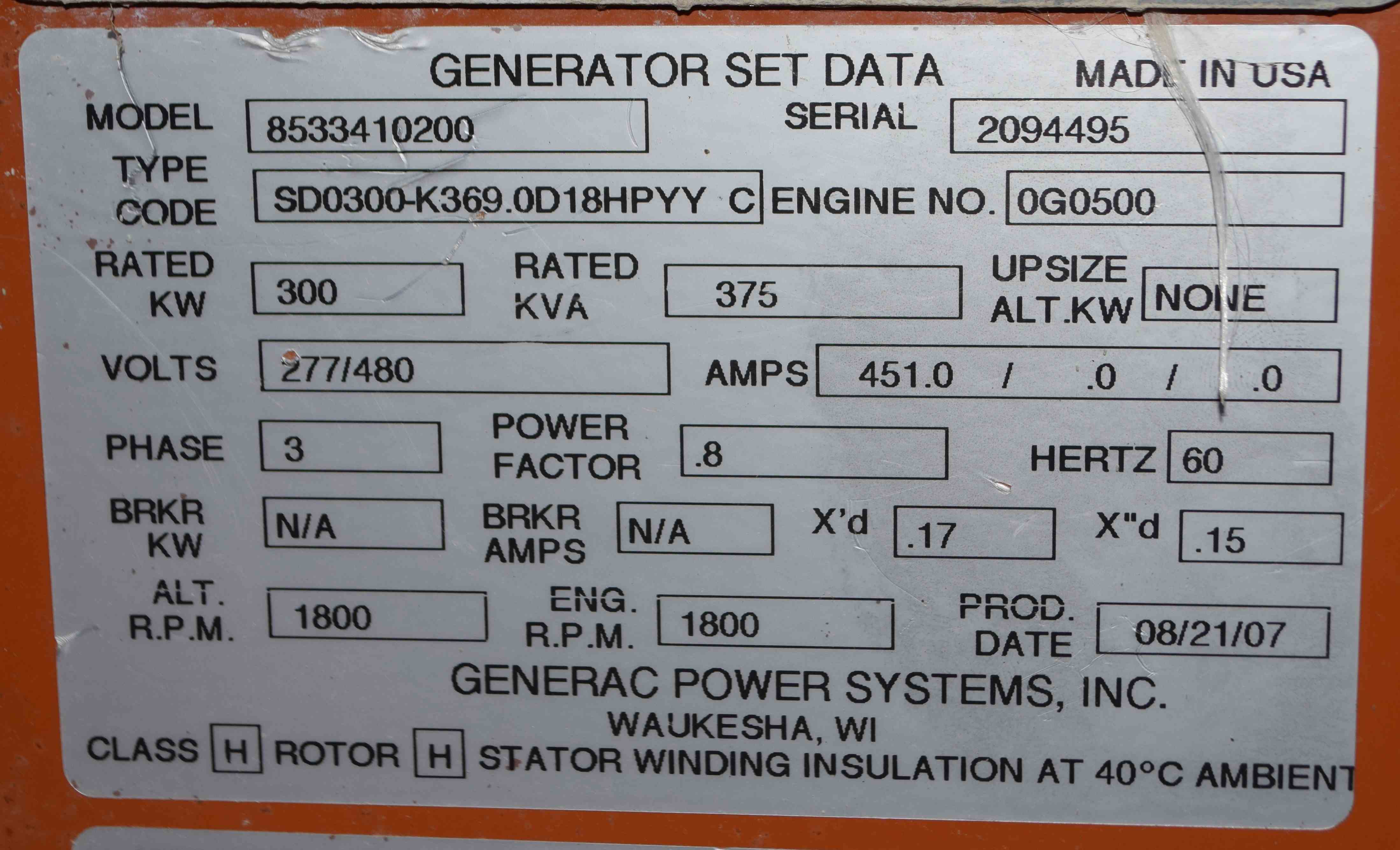 Used- Generac Power Systems 300 KW Diesel Generator Set. Model 8533410200, type code SD0300-K369.0D18HPYY C, serial# 2094495, built 2007. John Deere 9.0 liter 6 cylinder engine, model 6090HF485, serial# RG6090L020761. 3/60/277/480 Volts, weather enclosure. Includes a Generac 600 amp transfer switch, model 8533410100, type code GTS060N-3K2LDNCY, serial# 94414.