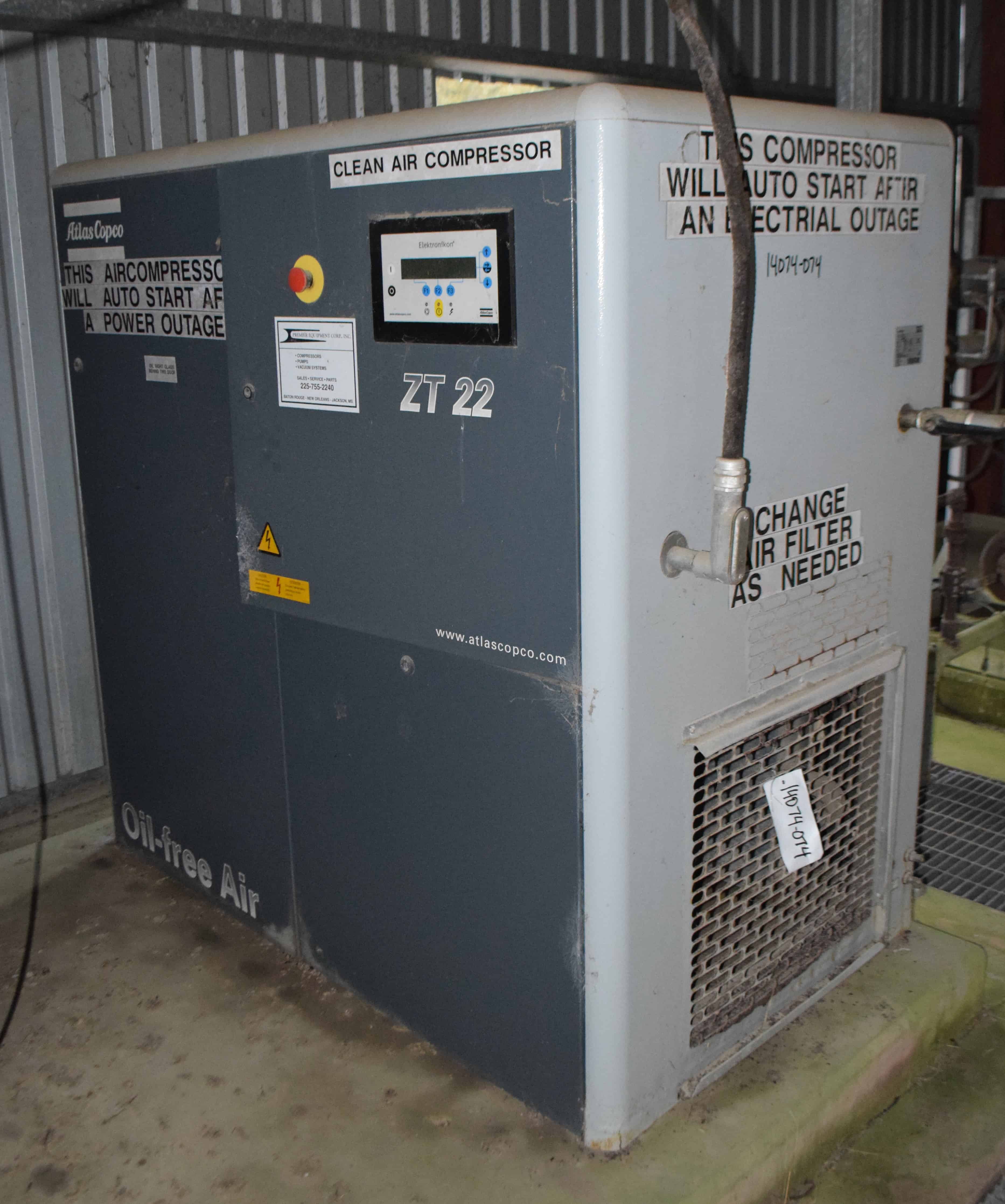 Used Atlas Copco Oil Free Rotary Screw Compressor, Model ZT 22. Air cooled, 117.2 CFM at 124 psi. Driven by a 30hp motor. Includes an Elektronikon controller. Serial# AII705773, built 2006.