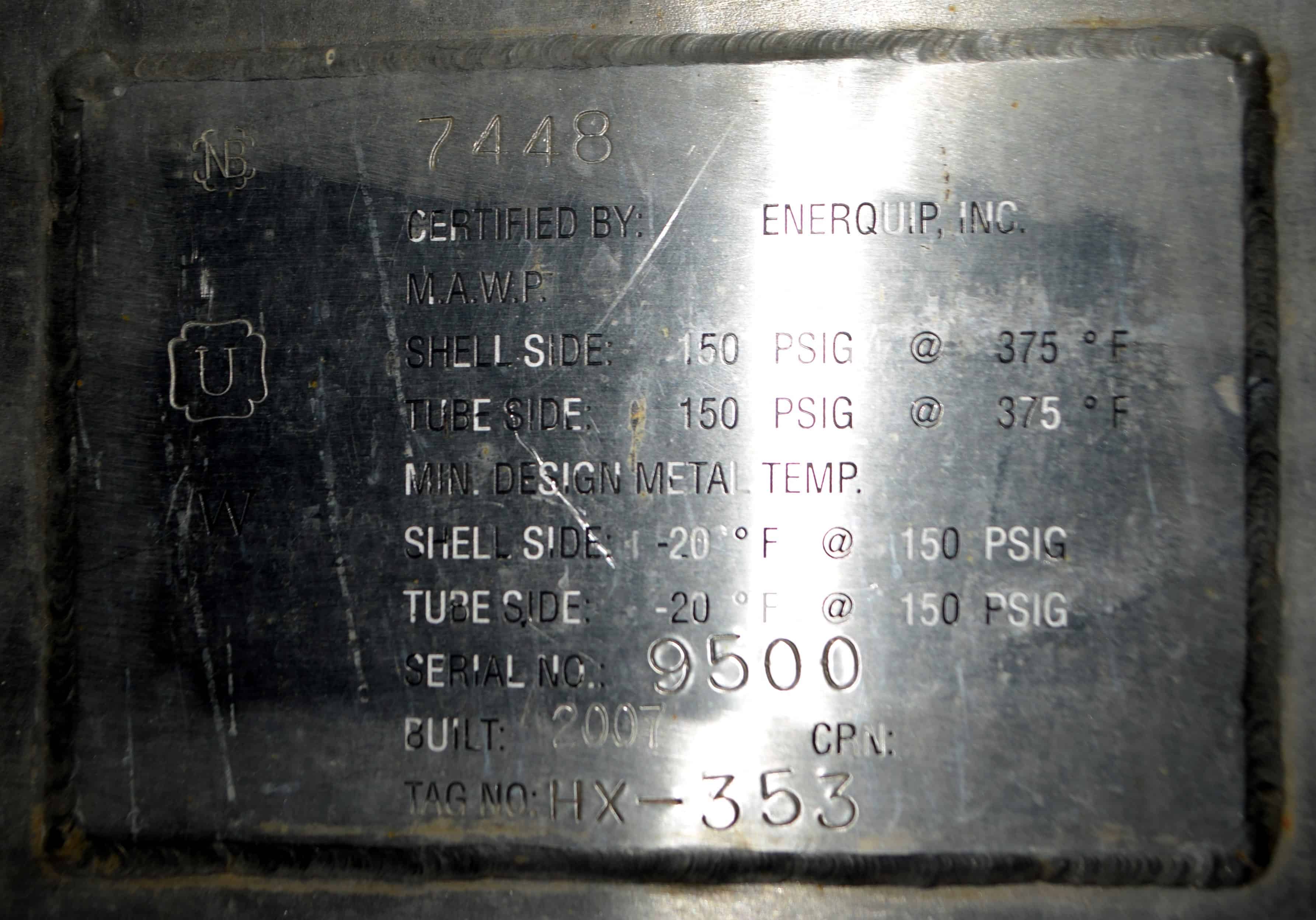 Used Enerquip Single Shell & Tube Heat Exchanger, 573 Square Feet, Model BEMV, 304L Stainless Steel, Vertical. 304L Stainless steel shell rated 150 psi at -20 to 375 degrees F. (394) 3/8" diameter x 174” long 304L stainless steel tubes rated 150 psi at -20 to 375 degrees F. 304L Stainless steel tubeshett and heads. Openings for tubes (2) 3", openings for shell (2) 6". National Board# 7448, serial# 9500, built 2007.