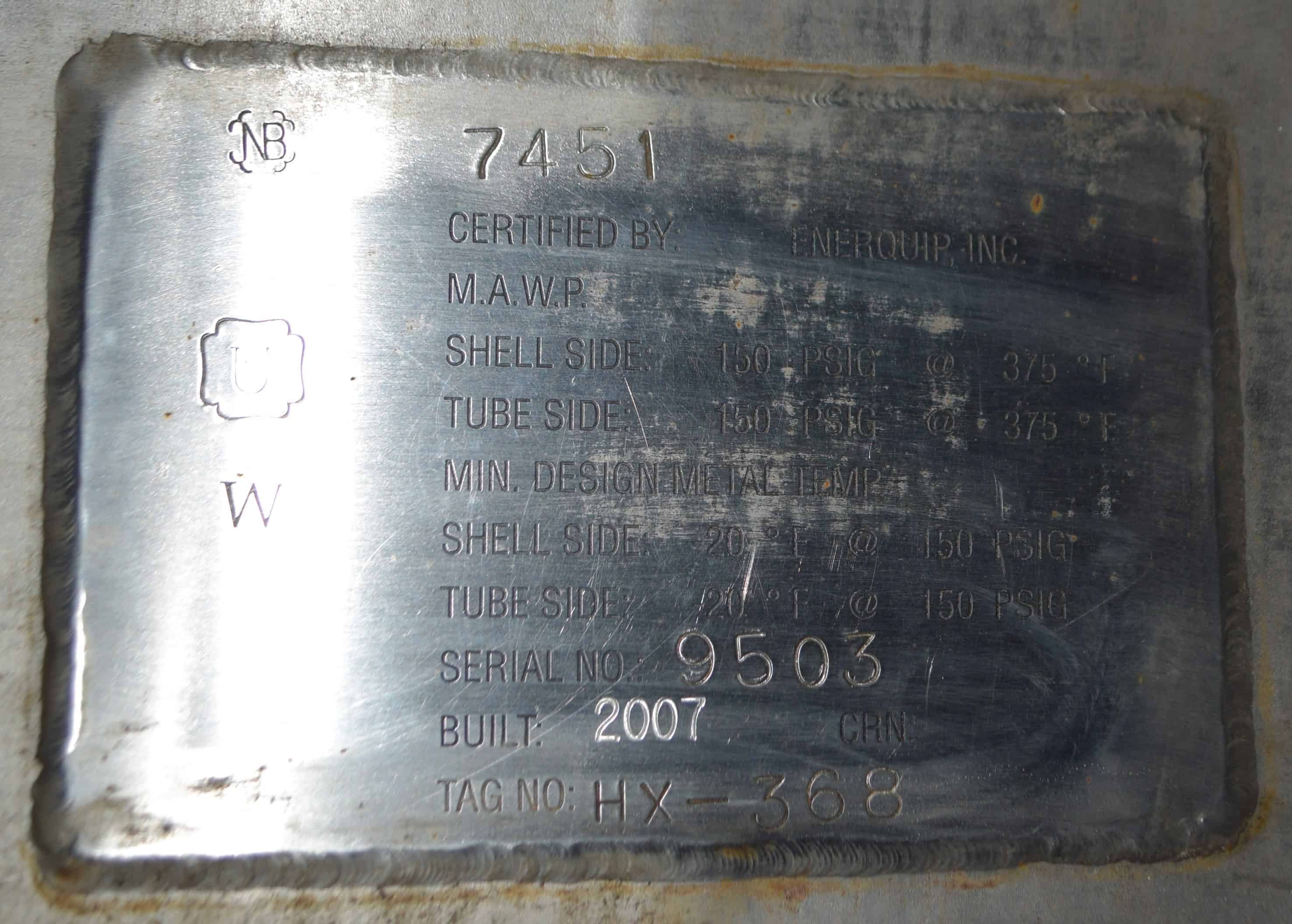 Used Enerquip Single Shell & Tube Heat Exchanger, 573 Square Feet, Model BEMV, 304L Stainless Steel, Vertical. 304L Stainless steel shell rated 150 psi at -20 to 375 degrees F. (394) 3/8" diameter x 174” long 304L stainless steel tubes rated 150 psi at -20 to 375 degrees F. 304L Stainless steel tubeshett and heads. Openings for tubes (2) 3", openings for shell (2) 6". National Board# 7451, serial# 9503, built 2007.