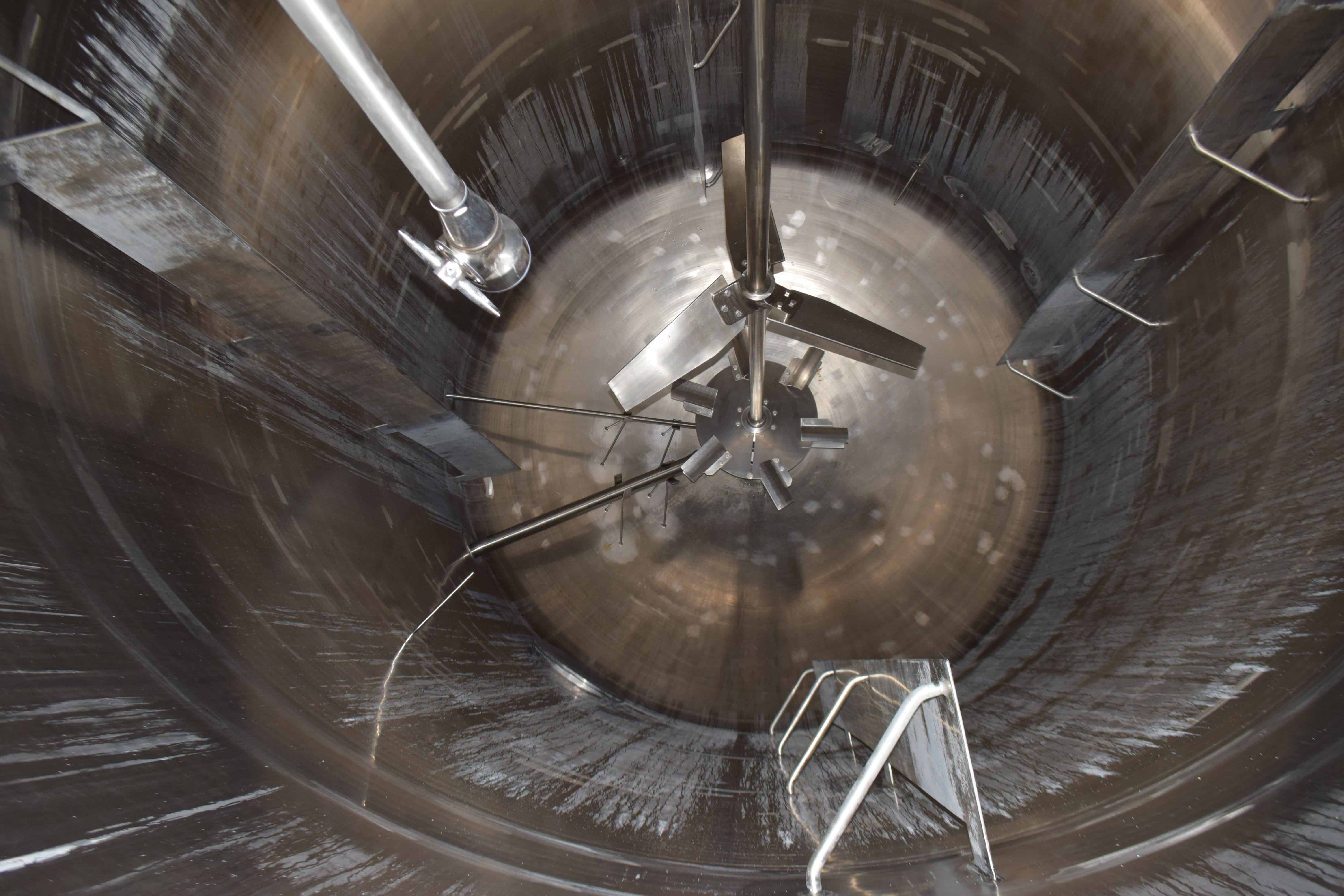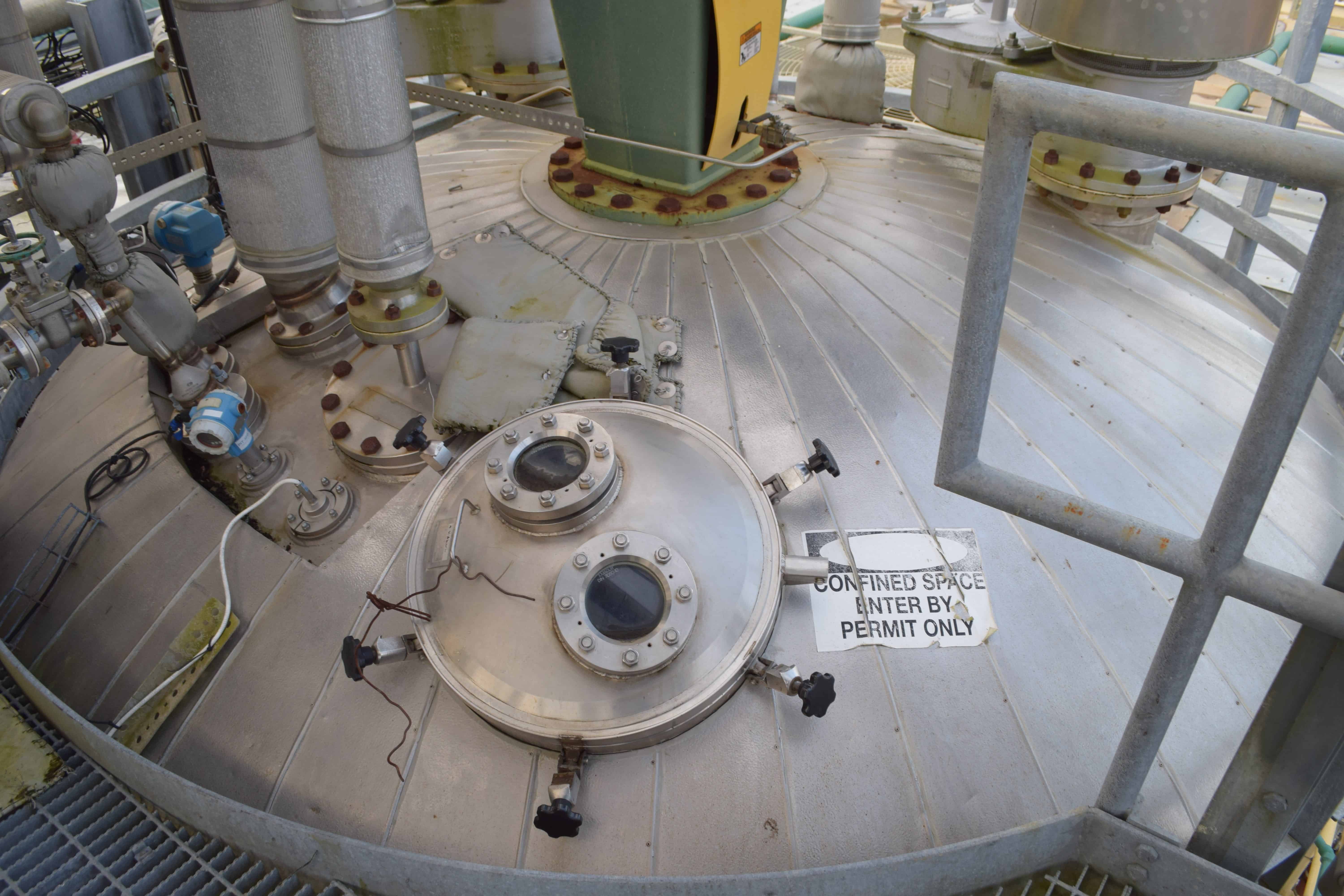 Used- Enerfab Reactor, Approximate 18,459 Gallon, 304L Stainless Steel, Vertical. Approximate 144" diameter x 225" straight side, dished top and bottom. Internal rated 10 psi, design vacuum 20" W.C., 304L stainless steel 1/2 pipe coil jacket on approximate 12' bottom sidewall & bottom head rated 150 psi at 300 degrees F. Top entering Lightnin agitator, model 75S20, serial# 1000002508602, ratio 25.53 to 1, output rpm 69. Approximate 3" diameter shaft with turbines, driven by a 20hp, 3/60/208-230/460 volt, 1755 rpm XP motor. Sidewall baffles, top and side bottom man ways, 12" center bottom outlet. Mounted on stainless steel legs. Contract# 101608-1, built 2010.