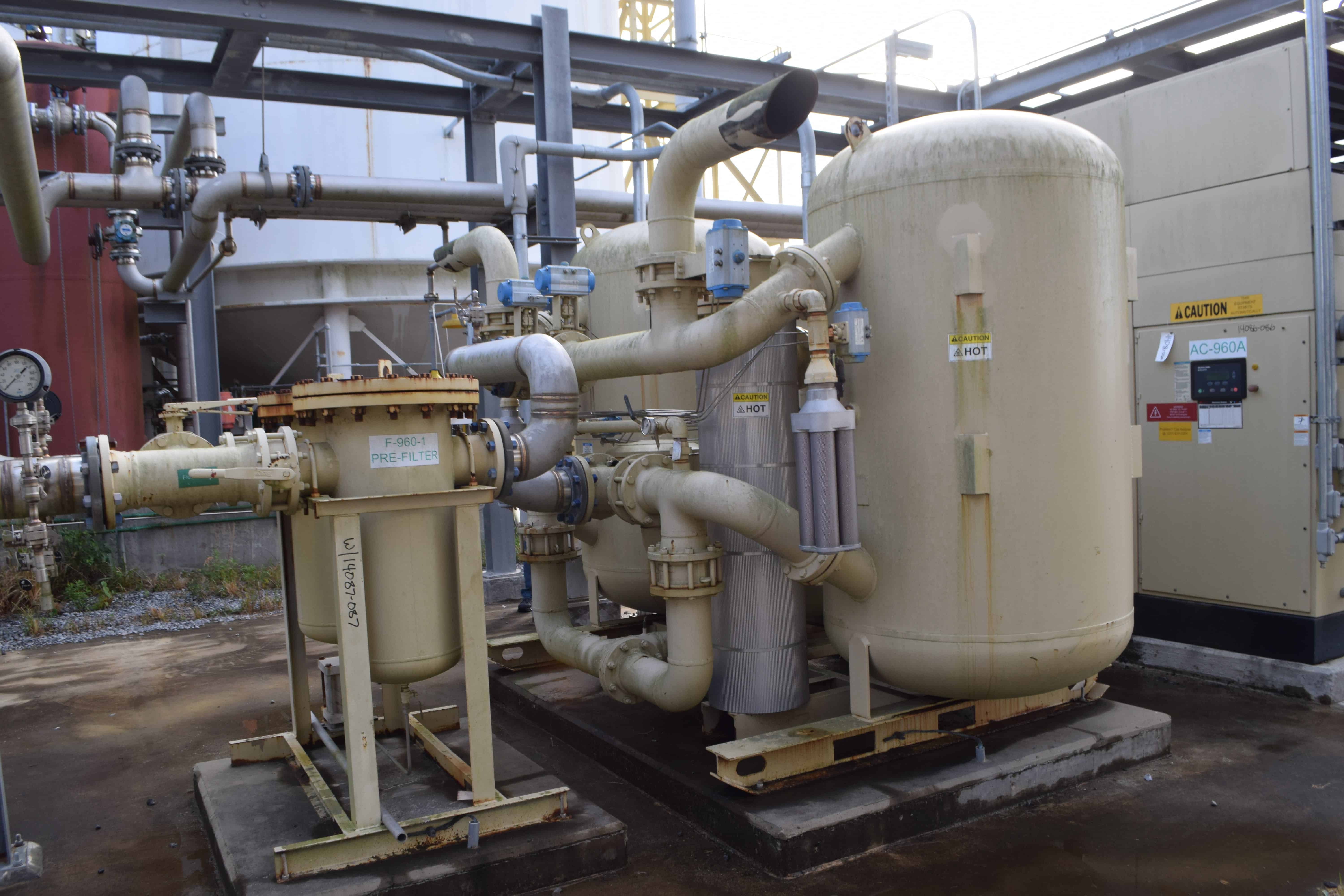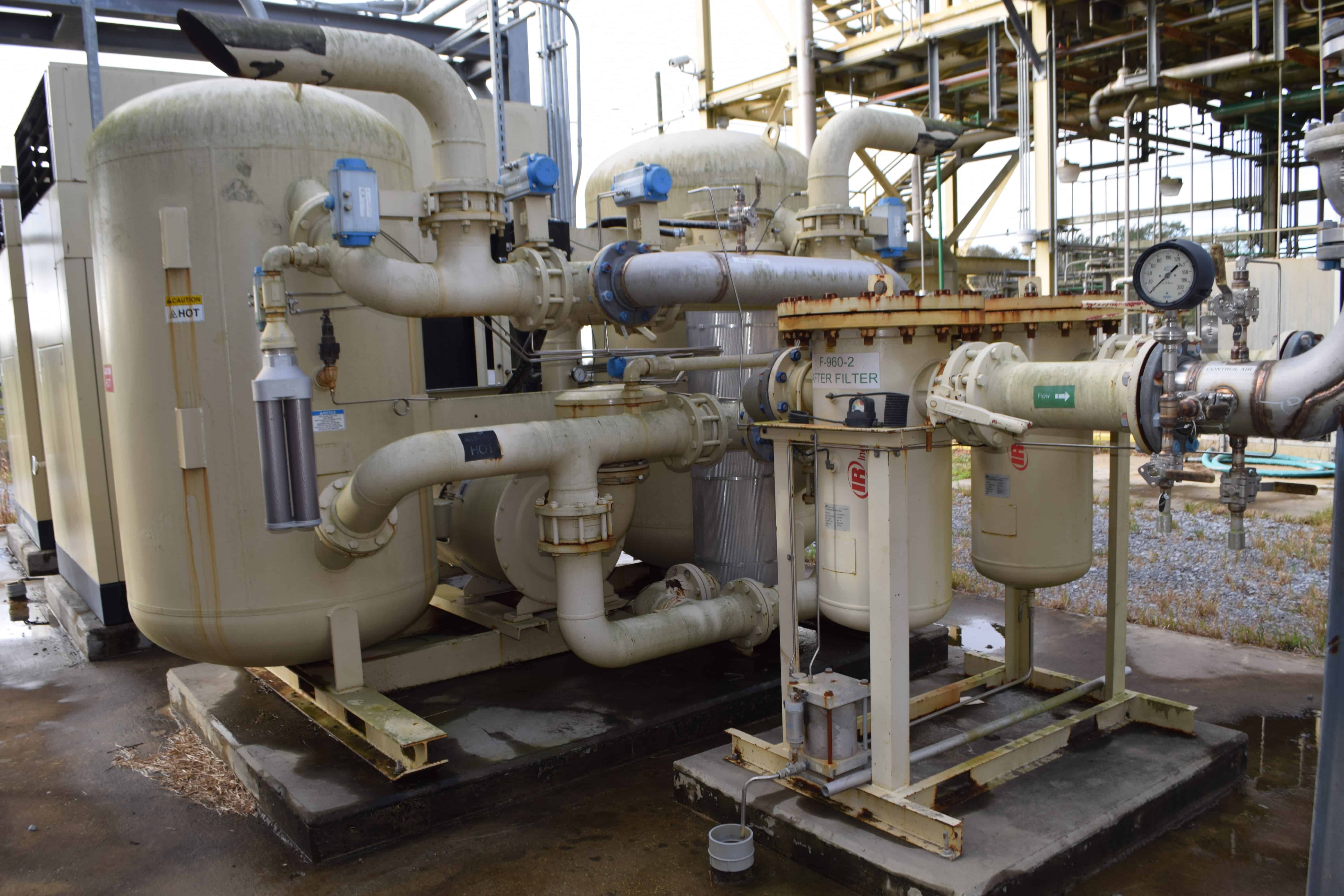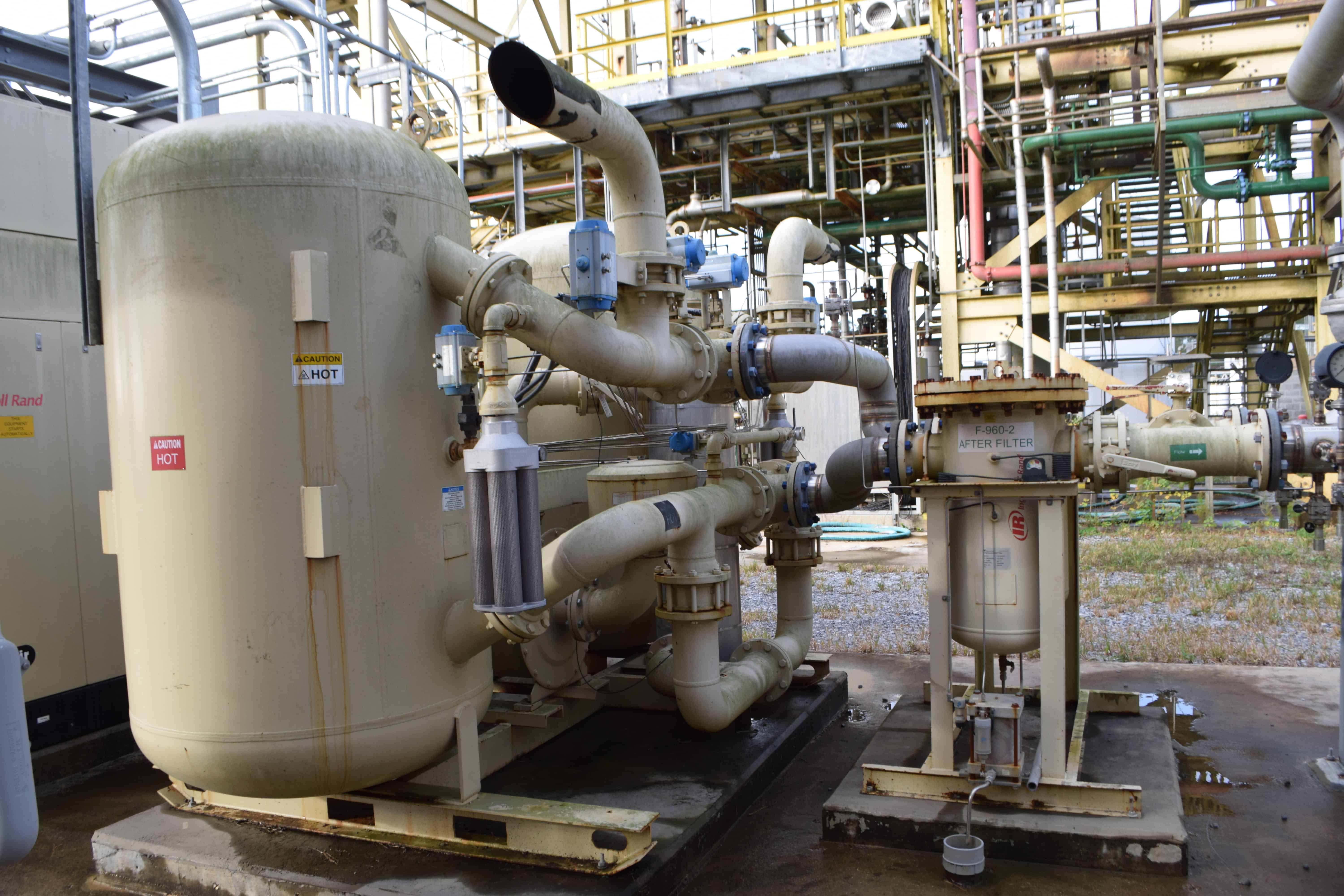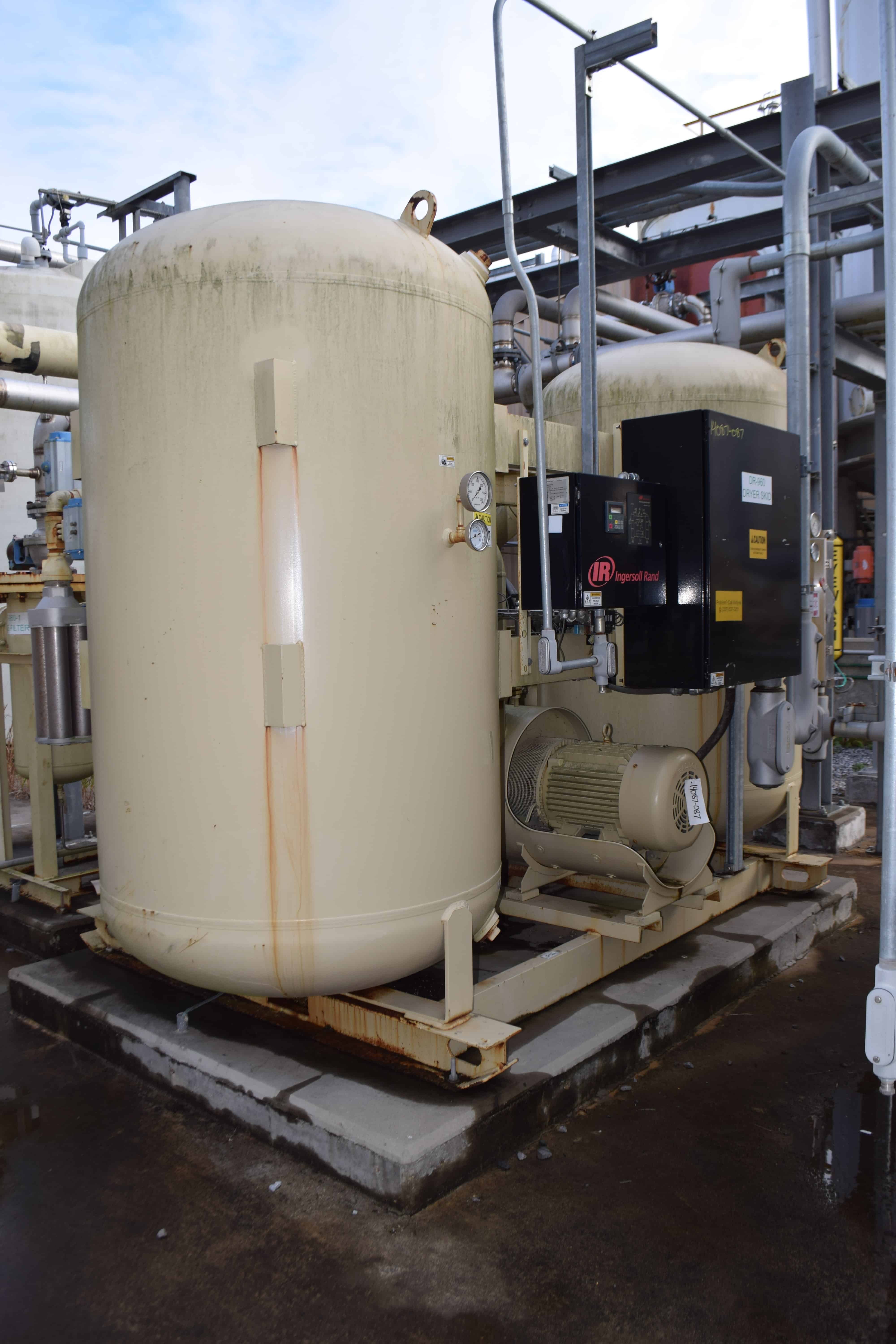 Used Ingersoll-Rand Heated Blower Desiccant Dryer, Model HB50004HN49S, Inlet Capacity 5000 SCFM. Desiccant 1633 kg per tower, 3/60/460 volt, maximum inlet air 150 psi at 120 degrees F. Serial# 525722. Includes a Spencer S24104C centrifugal blower, serial# 815071 L11, driven by a 30hp motor, (1) Ingersoll-Rand F10100IH compressed air filter, serial# 525722, (1) Ingersoll-Rand F10100IGHT compressed air filter, serial# 525722, and a control panel.