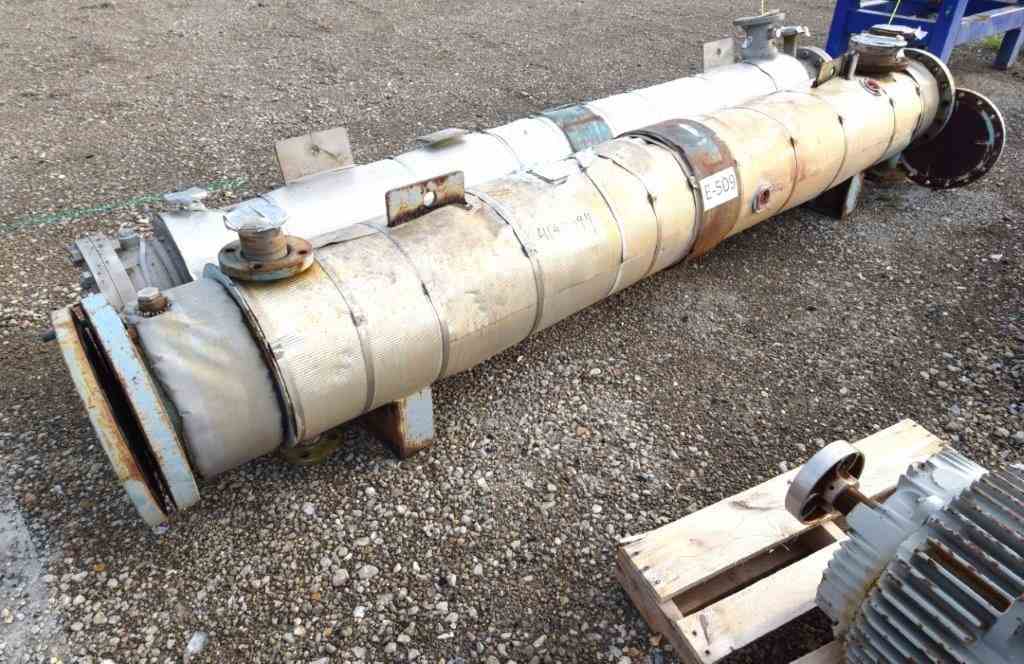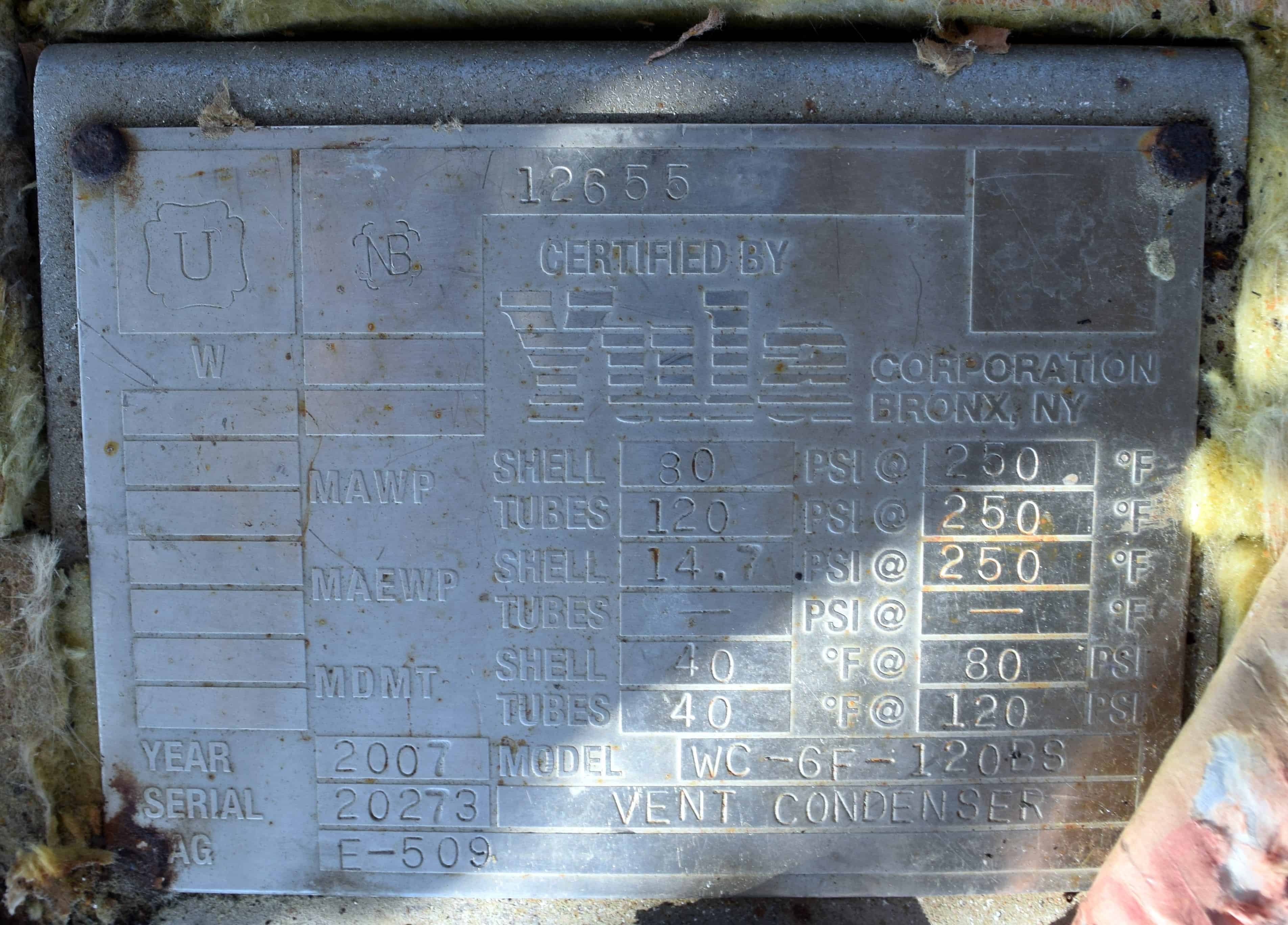 Used- Yula 6 Pass Shell & Tube Heat Exchanger, 196 Square Feet, Model WC-6F-120BS, 304L Stainless Steel, Horizontal. 304L Stainless steel shell rated 80 psi at 40 to 250 degrees F. (102) 3/4" diameter x 120" long 304L stainless steel tubes rated 120 psi at 40 to 250 degrees F. 304L Stainless steel tubesheet, carbon steel heads. Openings for tubes (2) 3", openings for shell 6", 2". National Board# 12655, serial# 20273, built 2007.