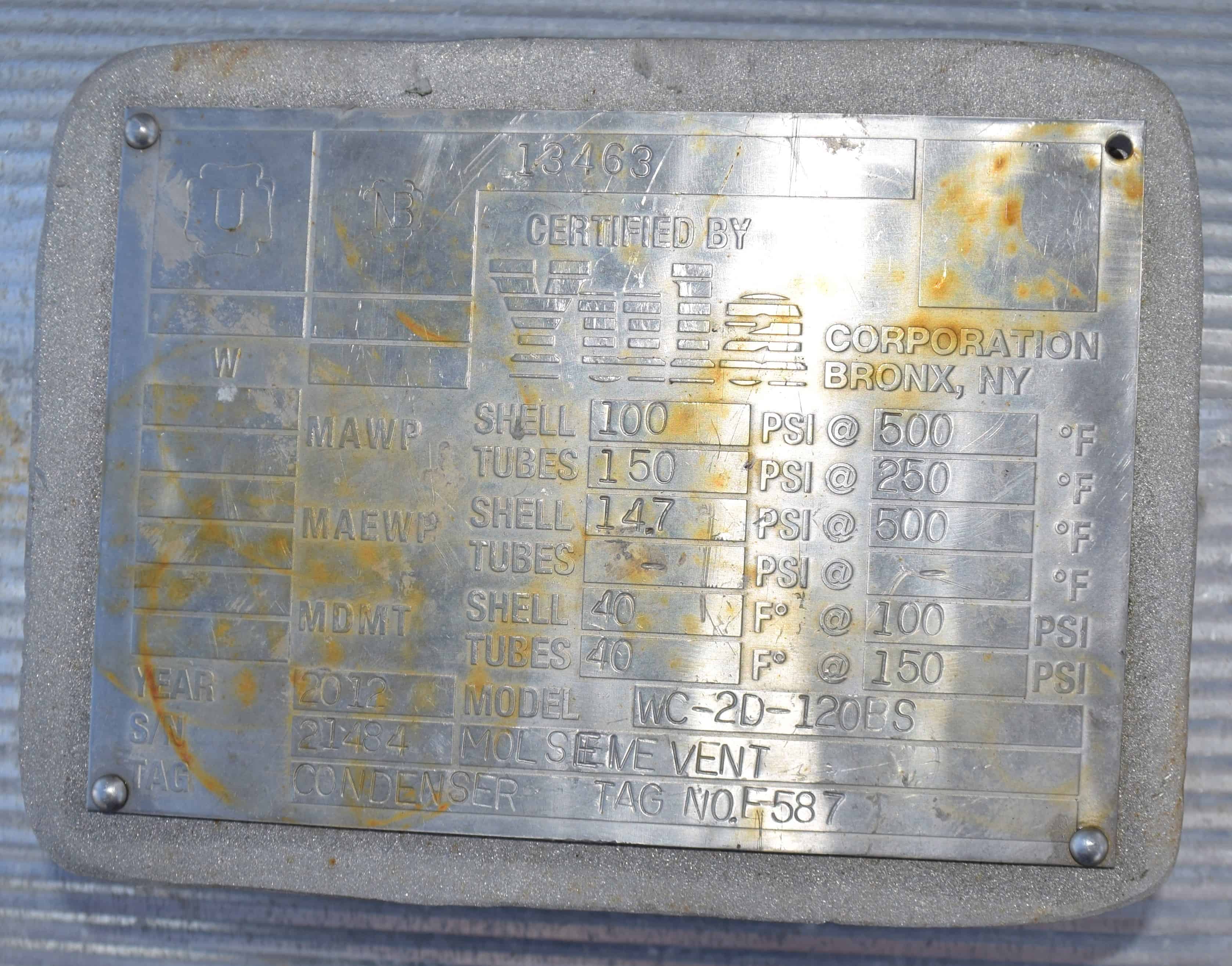 Used- Yula 2 Pass Shell & Tube Heat Exchanger, 58 Square Feet, Model WC-2D-120BS, 316L Stainless Steel, Horizontal. 316L Stainless steel shell rated 100 psi at 40 to 500 degrees F. (36) 3/4" diameter x 120" long 316L stainless steel tubes rated 150 psi at 40 to 250 degrees F. 316L Stainless steel tubesheet and head. Openings for tubes (2) 2", openings for shell 4", 1-1/2". National Board# 13463, serial# 21484, built 2012.
