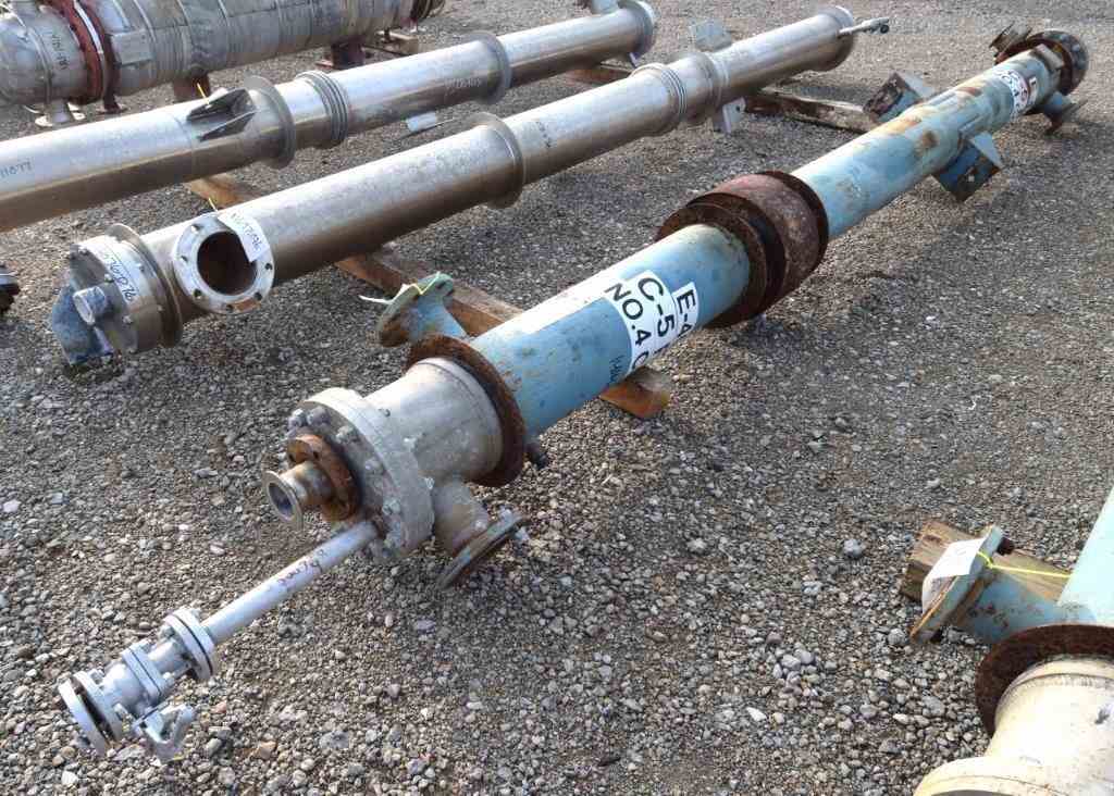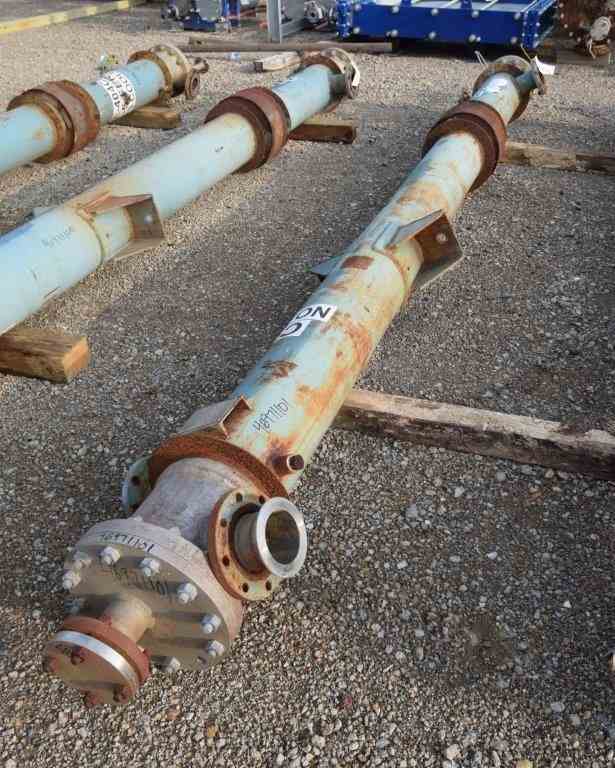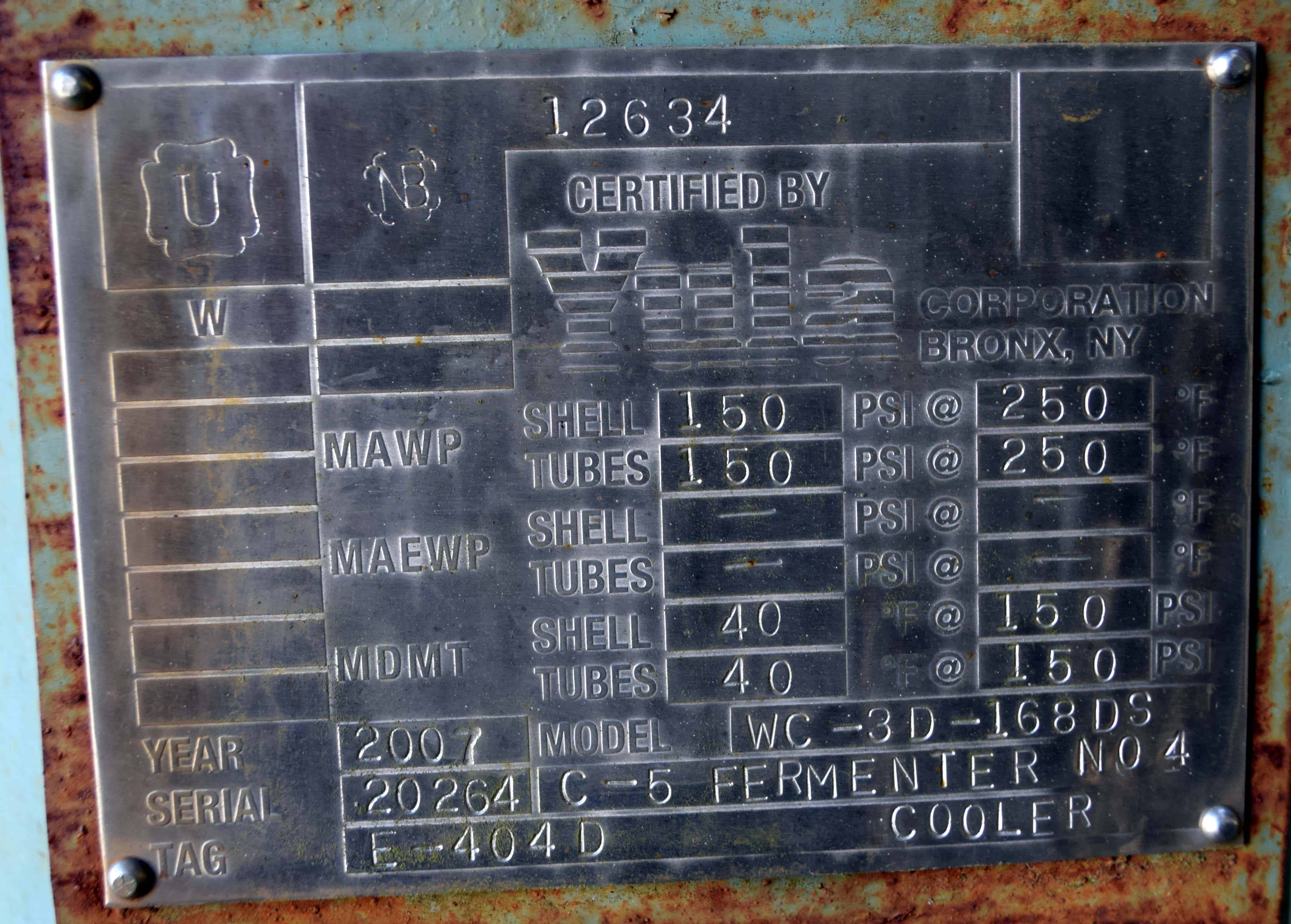 Used Yula 3 Pass Shell & Tube Heat Exchanger, Approximately 90 Square Feet, Model WC-3D-168DS, horizontal. Carbon steel shell rated 150 psi at 40 to 250 degrees F. (21) 1-1/4” diameter x 168” long 304L stainless steel tubes rated 150 psi at 40 to 250 degrees F. 304L Stainless steel tubesheet and heads. Openings for tubes (2) 4", openings for shell (2) 4". National Board# 12634, serial# 20264, built 2007.