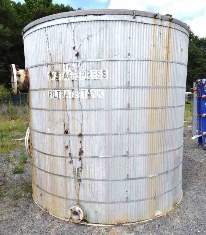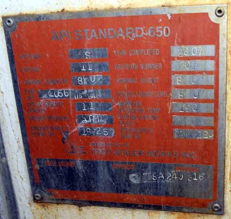 Used Troy Boiler Works API Standard 650 Tank, 3000 Gallon, 316 Stainless Steel, Vertical. Approximate 96” diameter x 96” straight side, coned top, flat bottom. Internal rated maximum operating temperature to 190 degrees F. Side bottom man way & bottom outlet. Serial# 18725, built 2007.