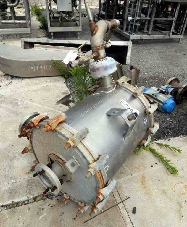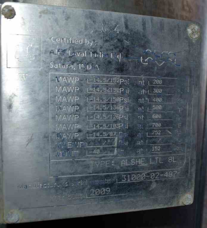 Used Alfa Laval Spiral Heat Exchanger, Type ALSHE-LTL-8L, Approximate 94 Square Feet, 316 Stainless Steel. Multiple ratings from -14.5/152 at -40 to 200 degrees F., -14.5/152 at 300 degrees F., -14.5/150 psi at 400 degrees F., -14.5/136 psi at 500 degrees F., -14.5/126 psi at 600 degrees F., -14.5/103 psi at 700 degrees F., -14.5/87 psi at 752 degrees F. National Board# 4, serial# 31000-02-487, built 2009.