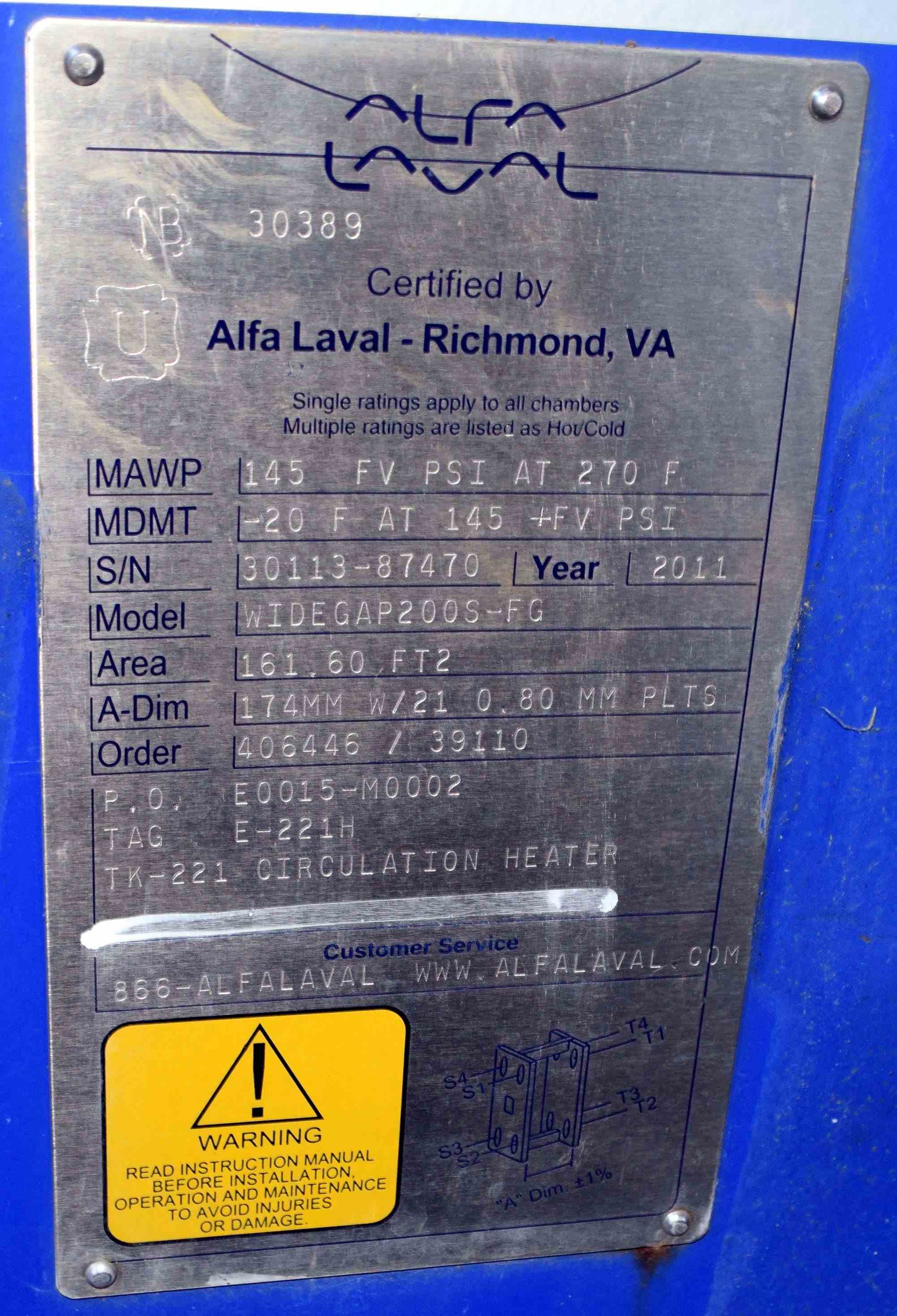 Used Alfa Laval Plate Heat Exchanger, 161.60 Square Feet, Model Widegap200S-FG. (21) 0.80mm 316 Stainless steel plates, rated 145 Full Vacuum psi at -20 to 270 degrees F. National Board# 30389, serial# 30113-87470, built 2011.