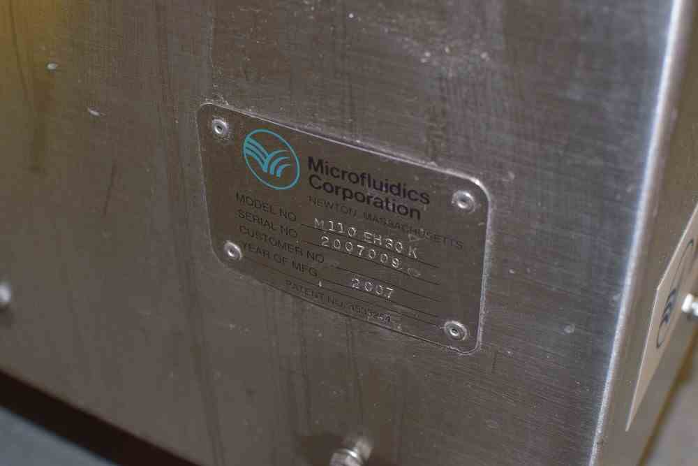 MicroFluidics M-110 EH 30K Microfluidizer has been designed to reliably achieve continuous operating pressures to 30,000 psi. The processor maximizes the energy-per-unit fluid volume, resulting in uniform submicron particle and droplet sizes. Built 2007. S/N: 2007009. (No interaction chamber)