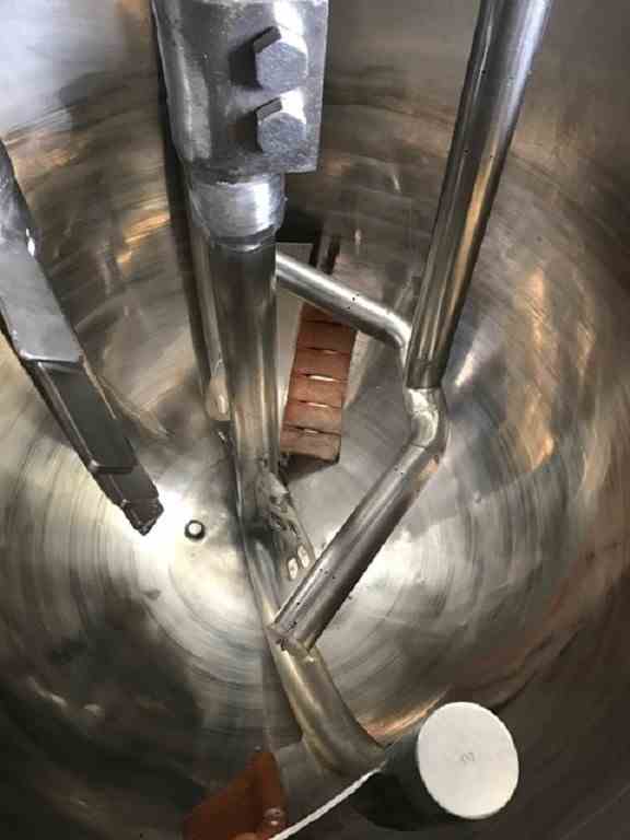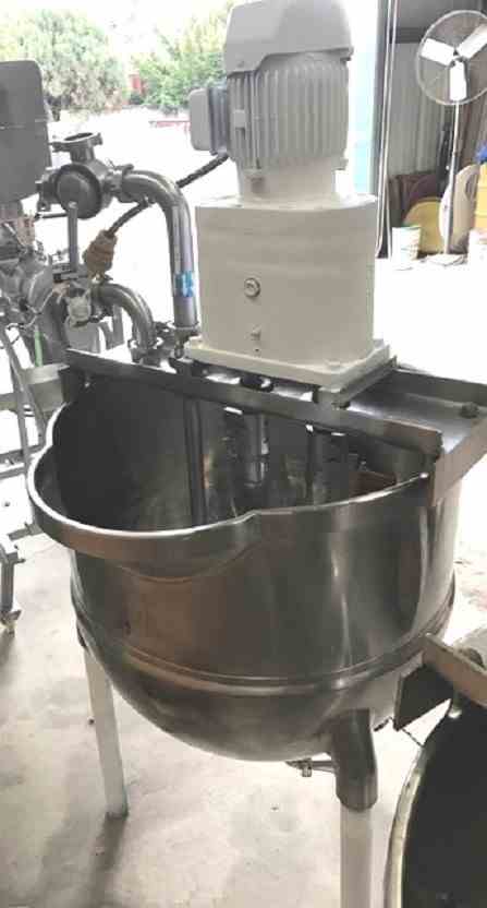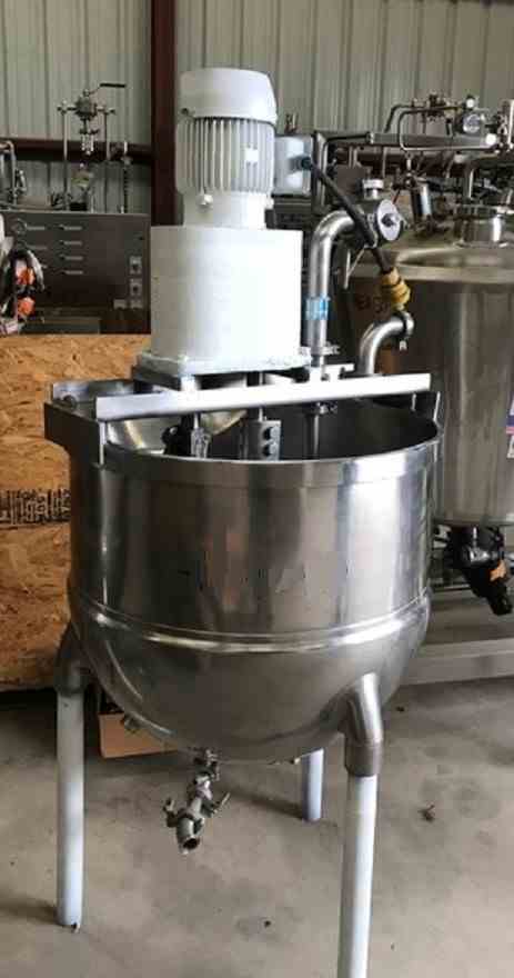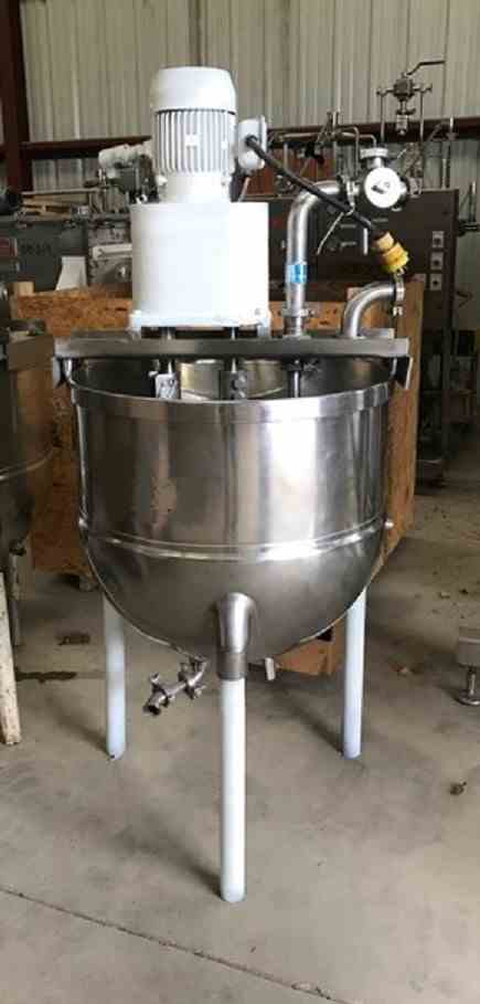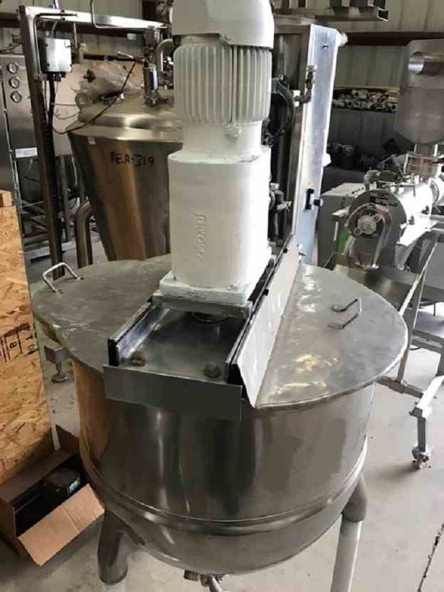Used 80 Gallon GROEN Jacketed Mix Kettle. Double Motion agitation with scraper blades and tree mixer. Model TA80SP. Driven by 2 HP, 1730 rpm, 230/460 volt motor. Includes lift off lids. Jacket rated 100 PSI.
