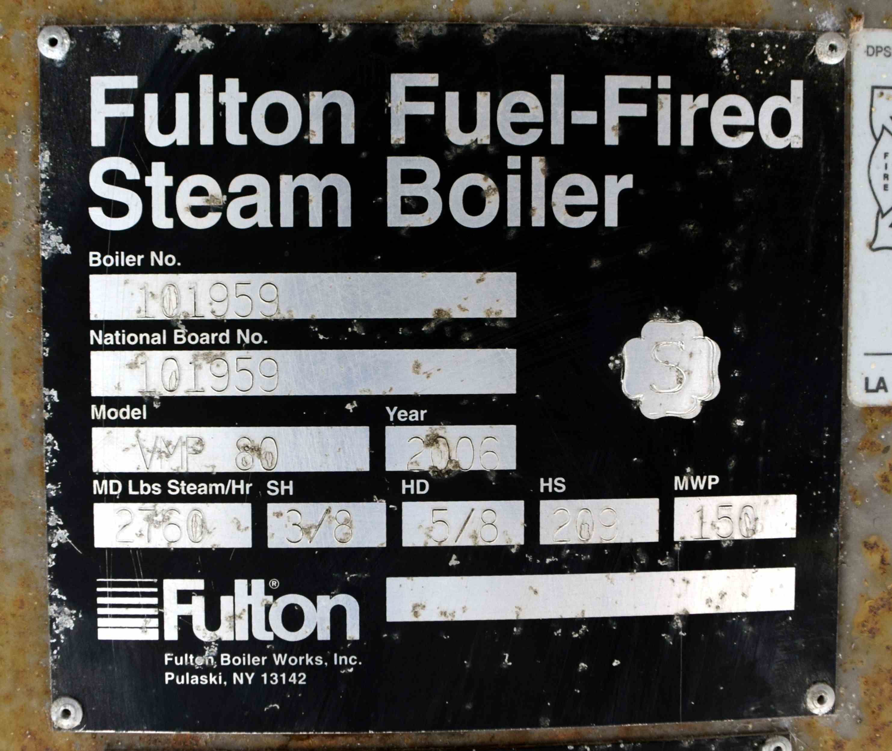 Used- Fulton VMP #2 Oil Vertical Multi-Port Boiler, Model VMP-80. Boiler hp 80, 150 psi, rated 2760 pound per hour, Includes control panel with burner controller, and a boiler return system with pump. Skid mounted. National Board# 101959, built 2006.