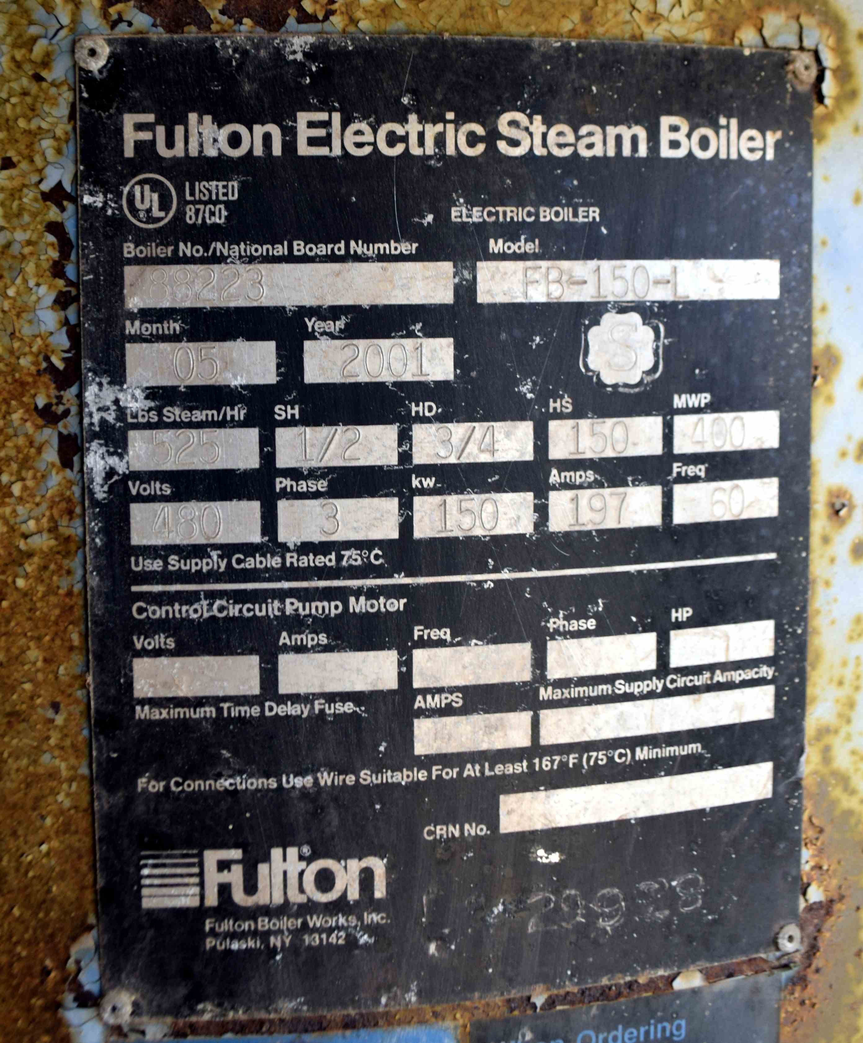 Used Fulton Electric Steam Boiler, Model FB-150-L. Boiler hp 6, 400 psi, rated 525 pound per hour, Includes control panel, and a boiler return system with pump. Skid mounted. National Board# 88223, built 2001.