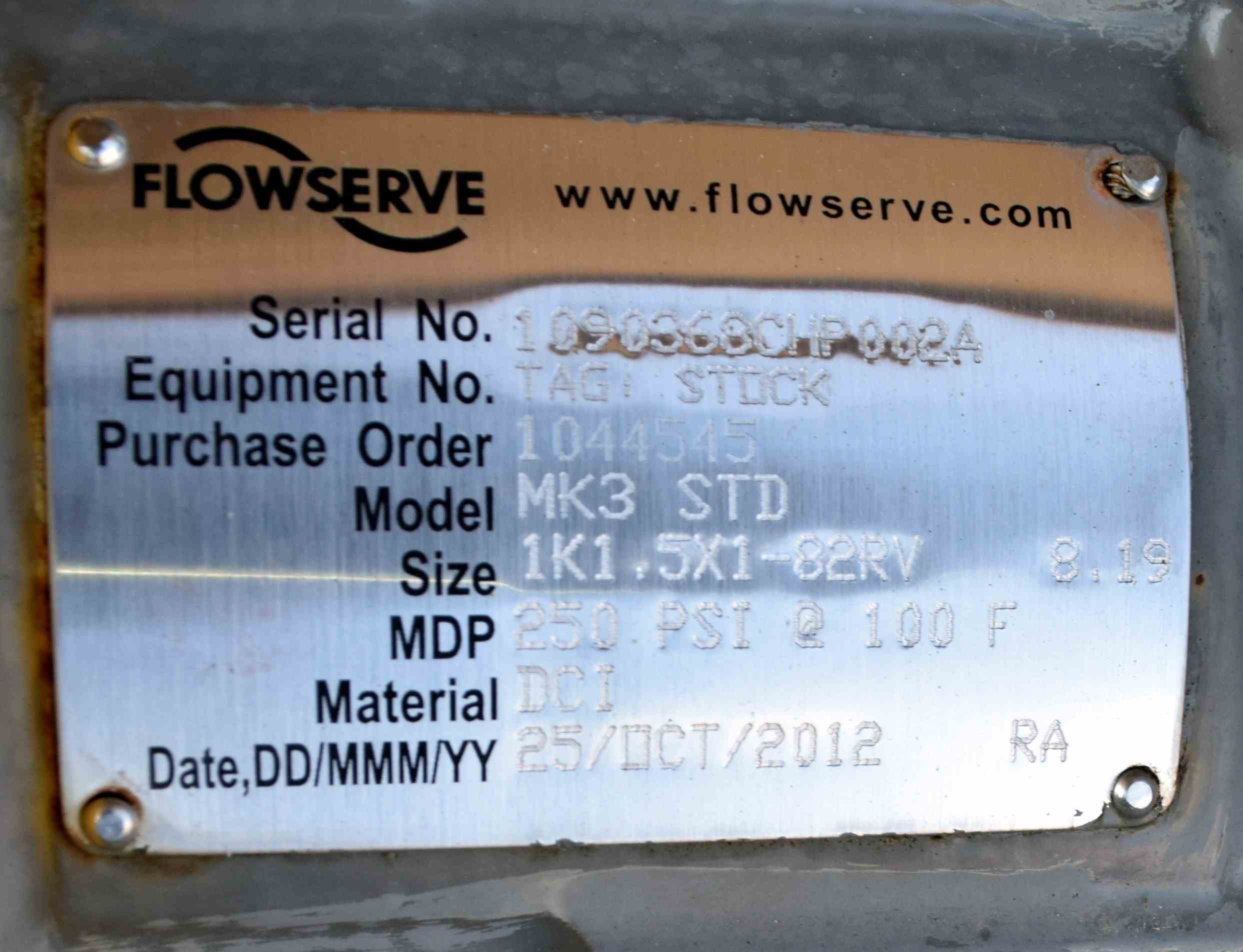 Unused- Flowserve MK3 STD. Centrifugal Pump, Carbon Steel. Size 1K1.5X1-82RV. Driven by a 15 HP, 3/60/460 volt, 3510 rpm motor. Serial# 1090368CHP002A, built 2012.