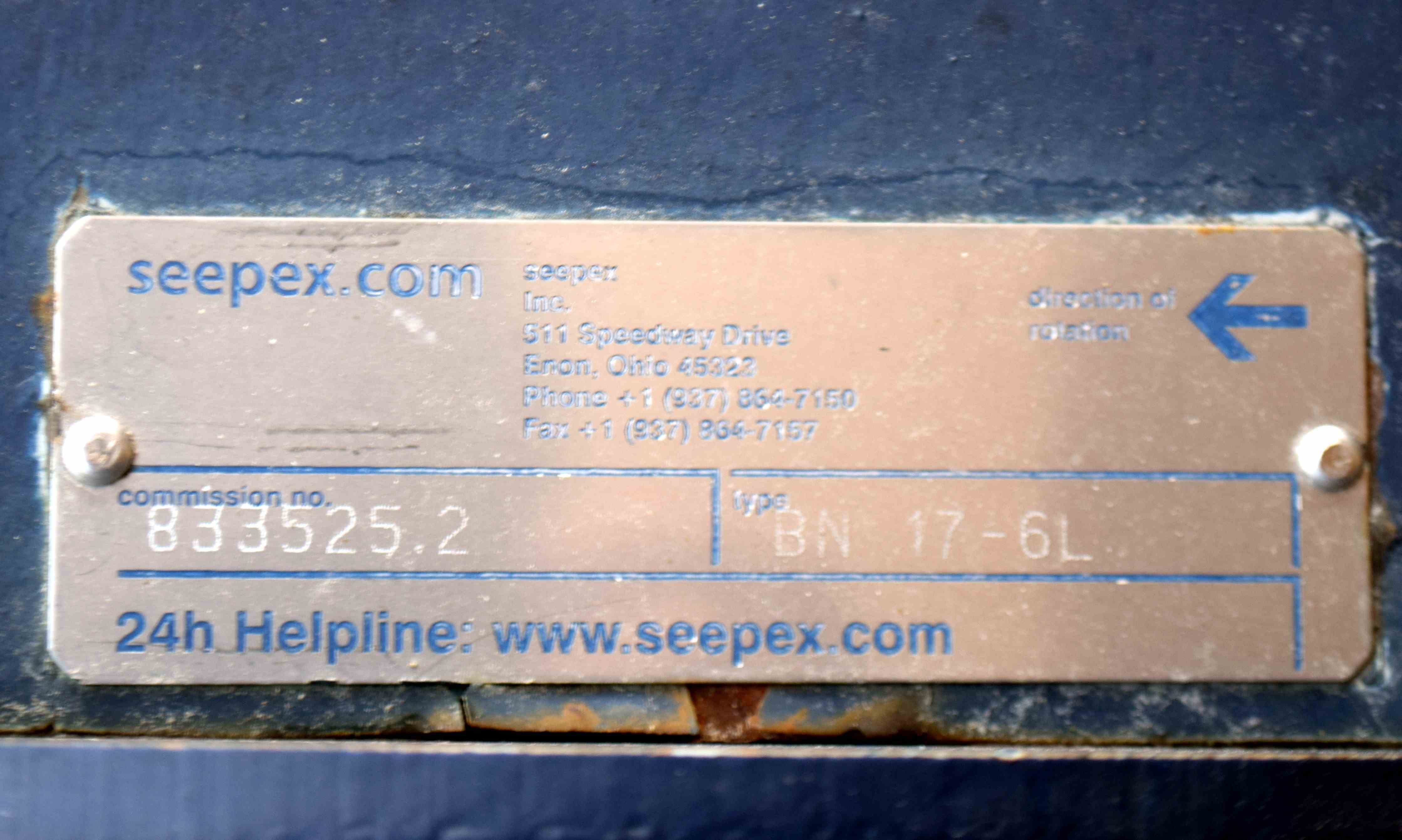 Unused- Seepex Progressive Cavity Pump, Model BN 17-6L. Driven by a 3hp, 460 volt, 1755 rpm gear motor, ratio 6.86 to 1. Serial# 833525.2.