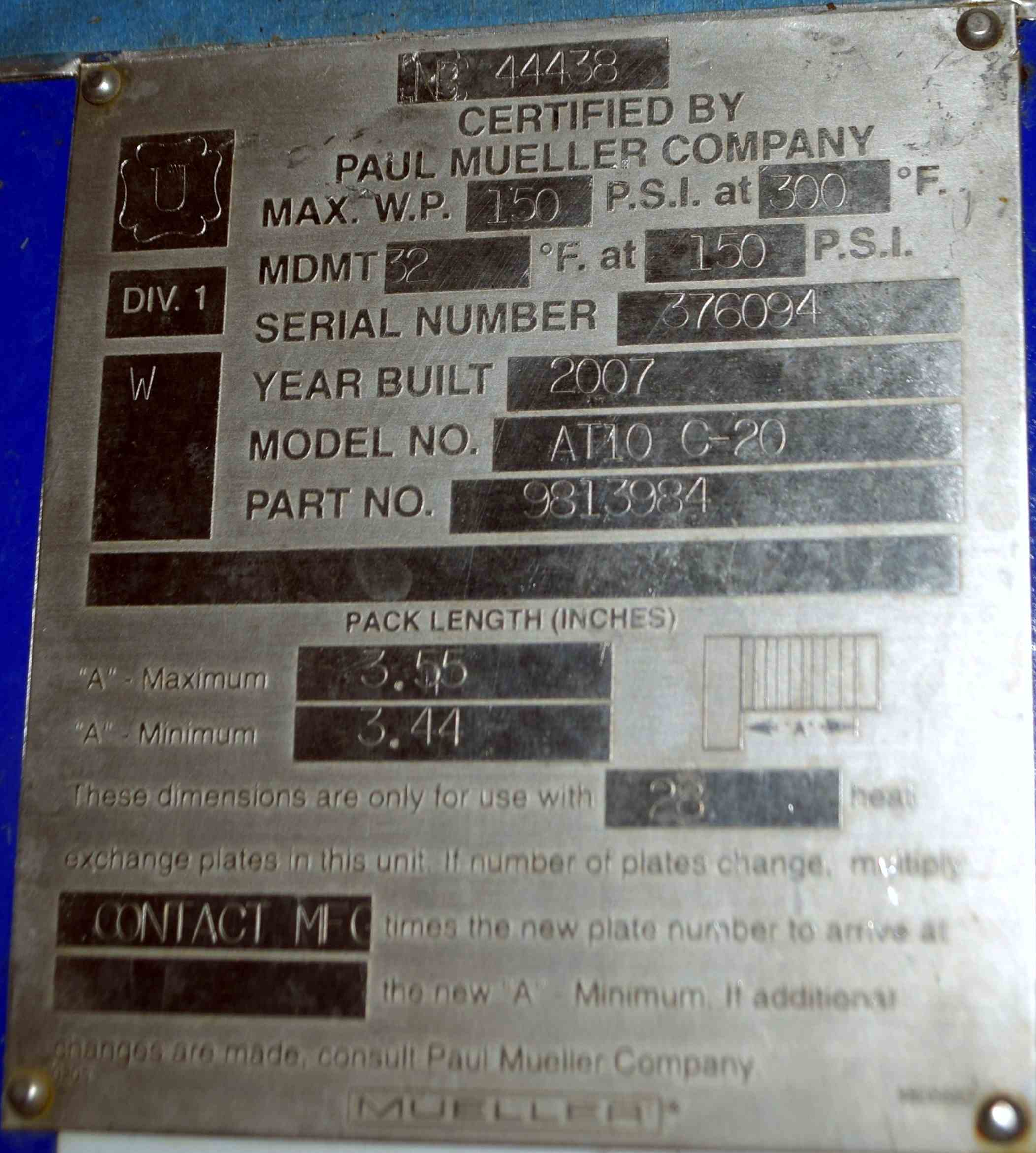 Used- Mueller Plate Heat Exchanger, 32.2 Square Feet, ModelAT10 C-20. (28) Approximate 9" wide x 30" long 316 stainless steel plate.