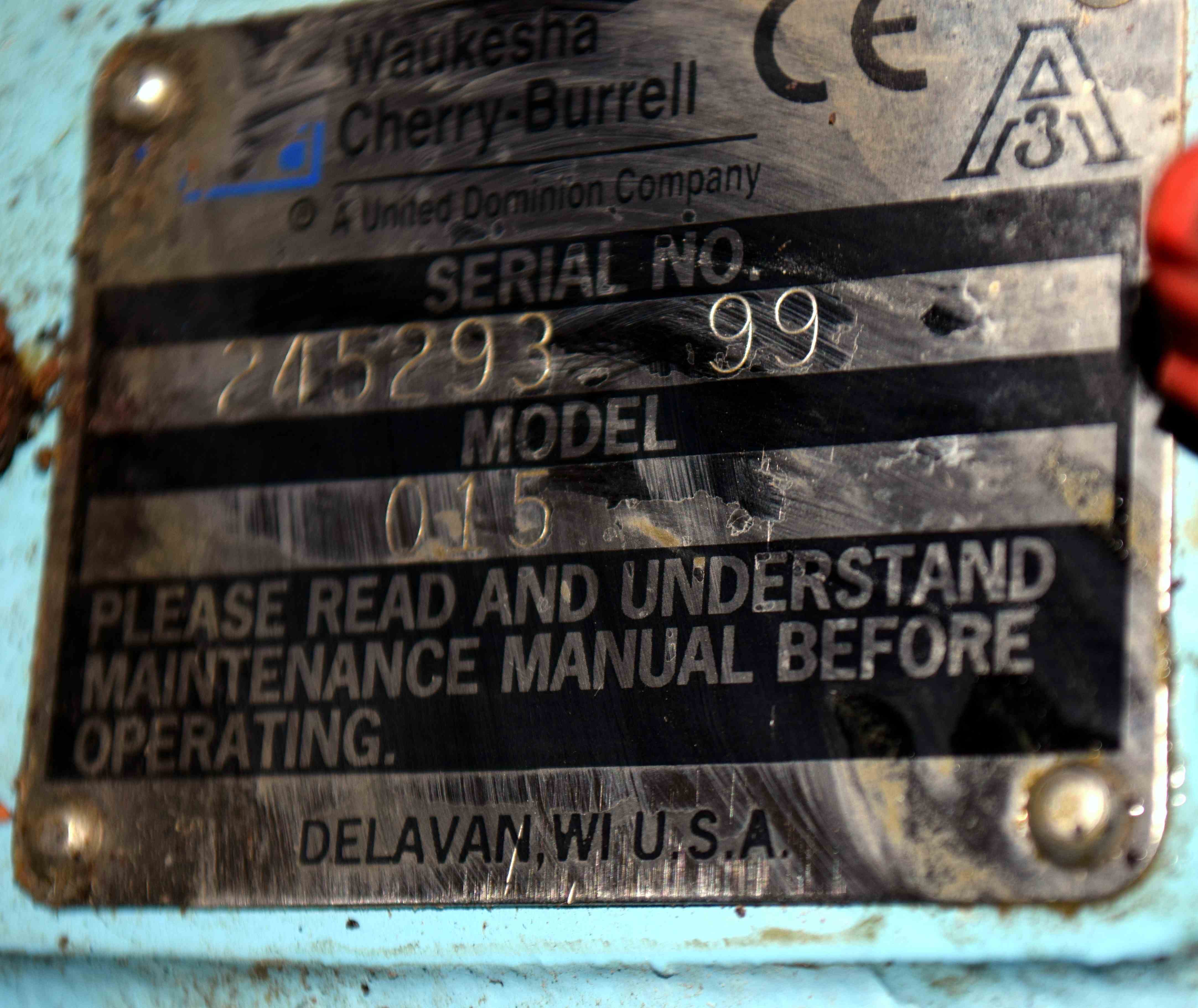 Used- Waukesha Positive Displacement Pump, Model 015, Stainless Steel. Approximate displacement 0.142 gallons per revolution, nominal capacity to 9 gallons per minute. Driven by a 2hp, 3/60/230/460 volt, 1720 rpm gear motor, ratio 3.41 to 1. Serial# 245293, built 1999.