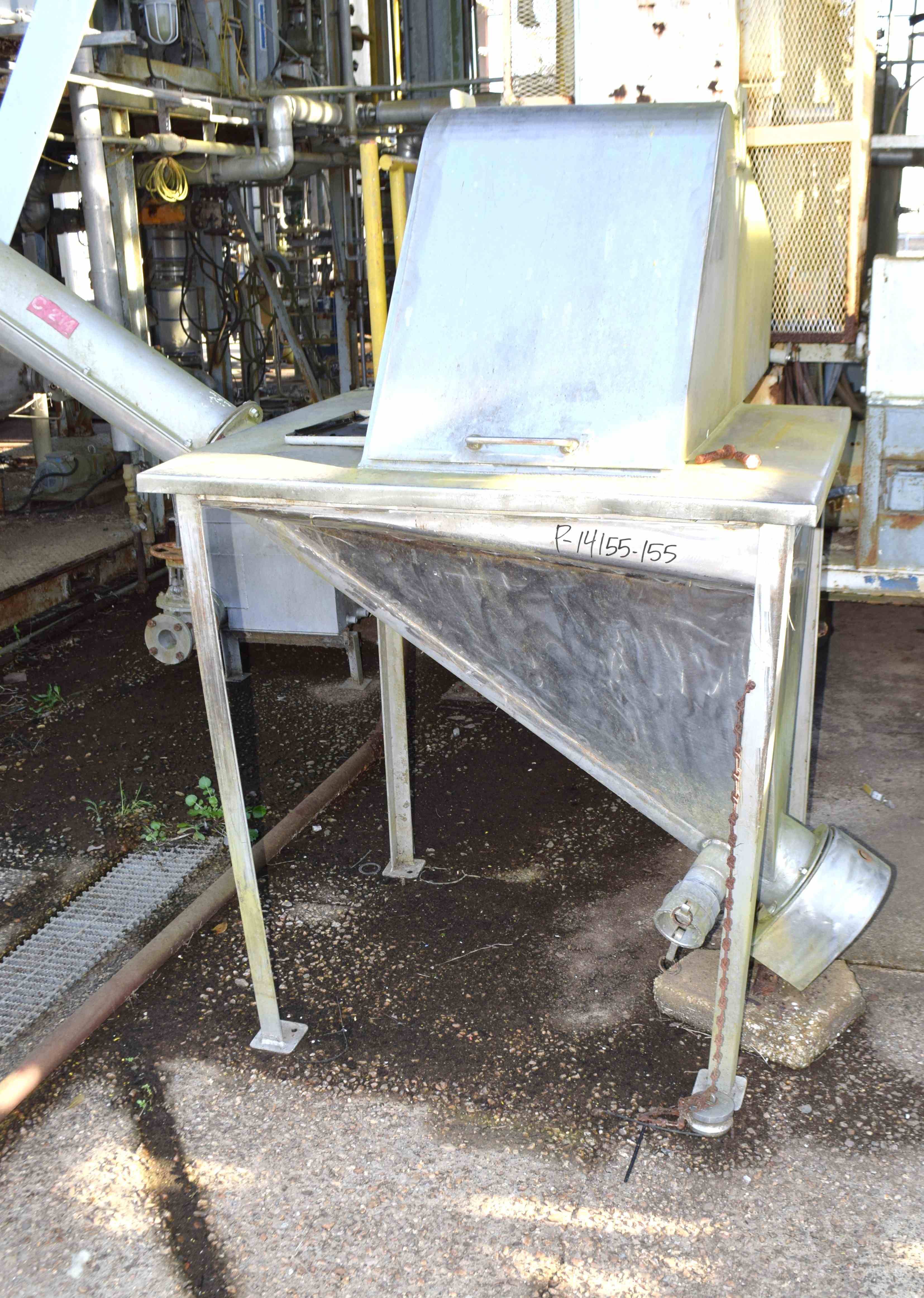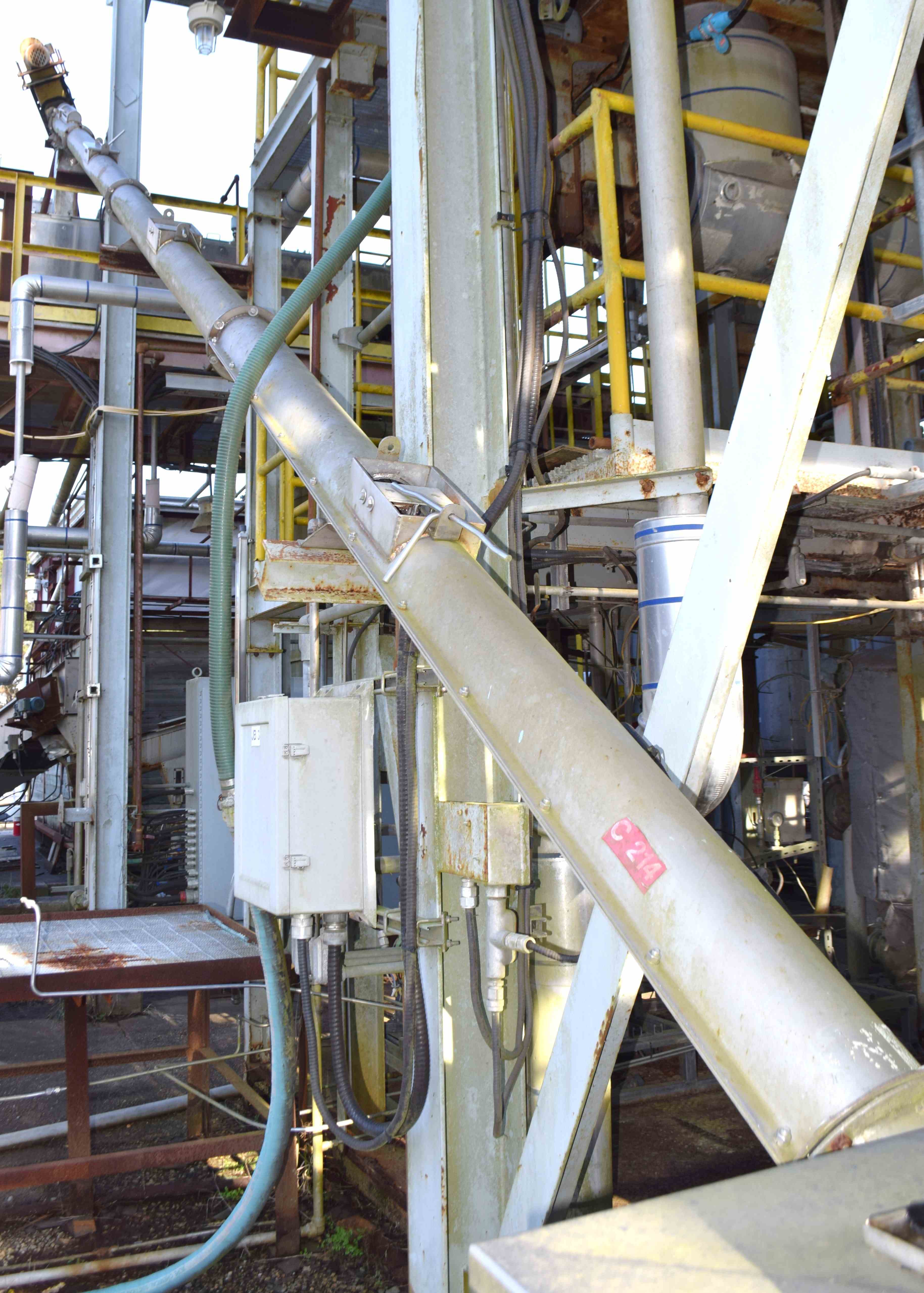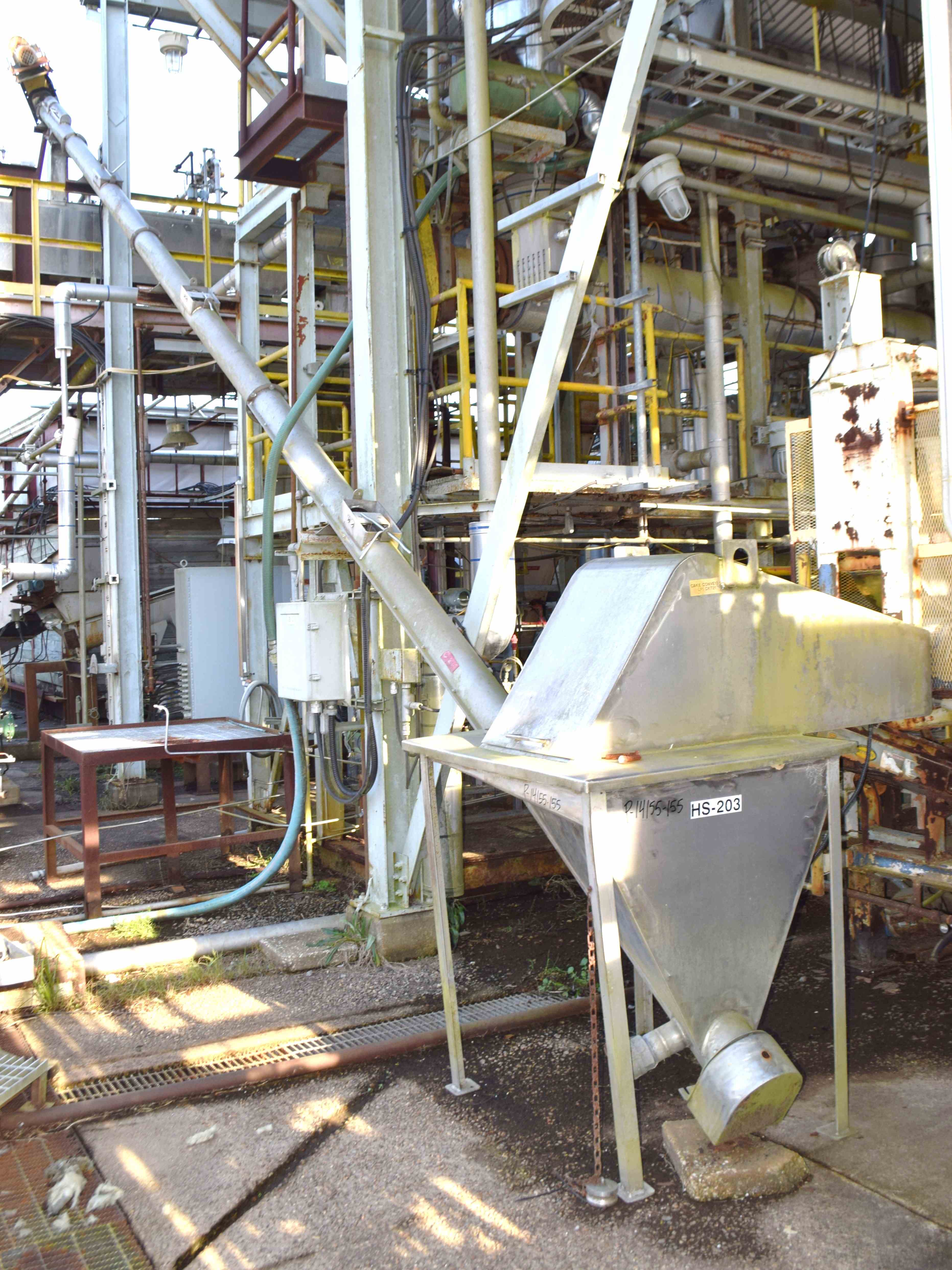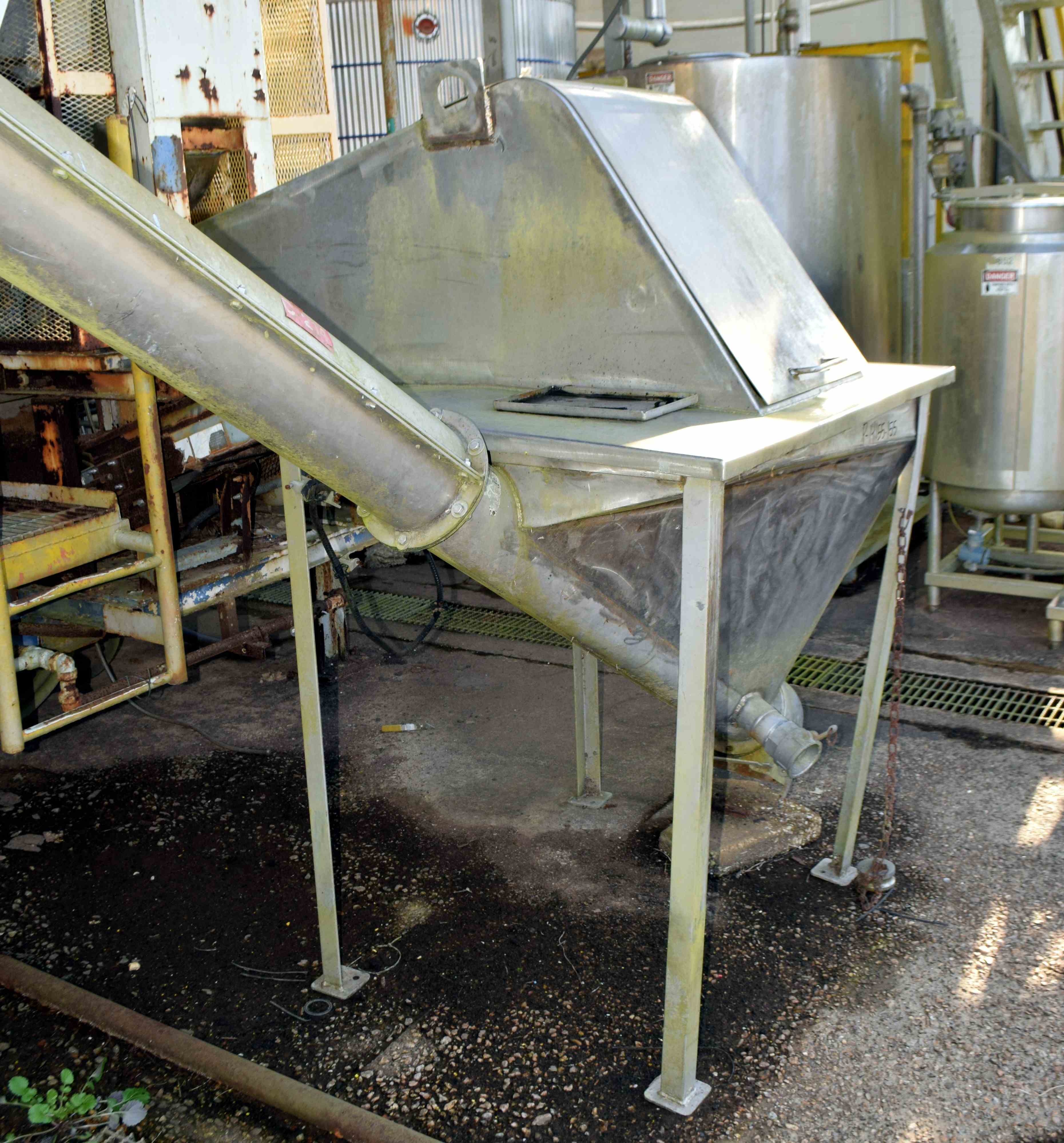 Used- Closed Tube Screw Conveyor, Stainless Steel. Approximate 6" diameter x 480" long screw, driven by a 2hp, 3/60/208-230/460 volt, 1735 rpm motor thru a reducer, ratio 34.94 to 1. Includes a bottom feed hopper.