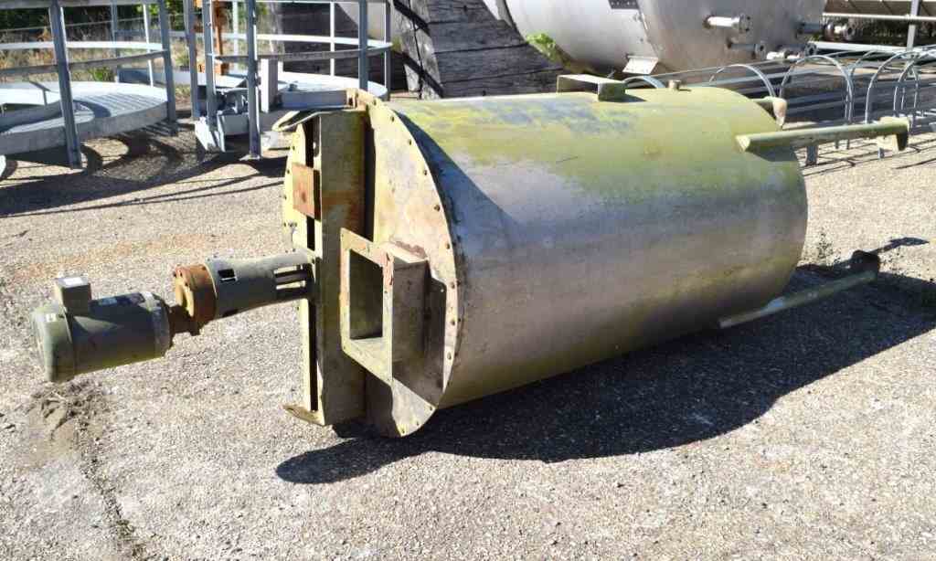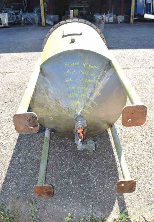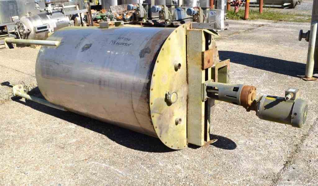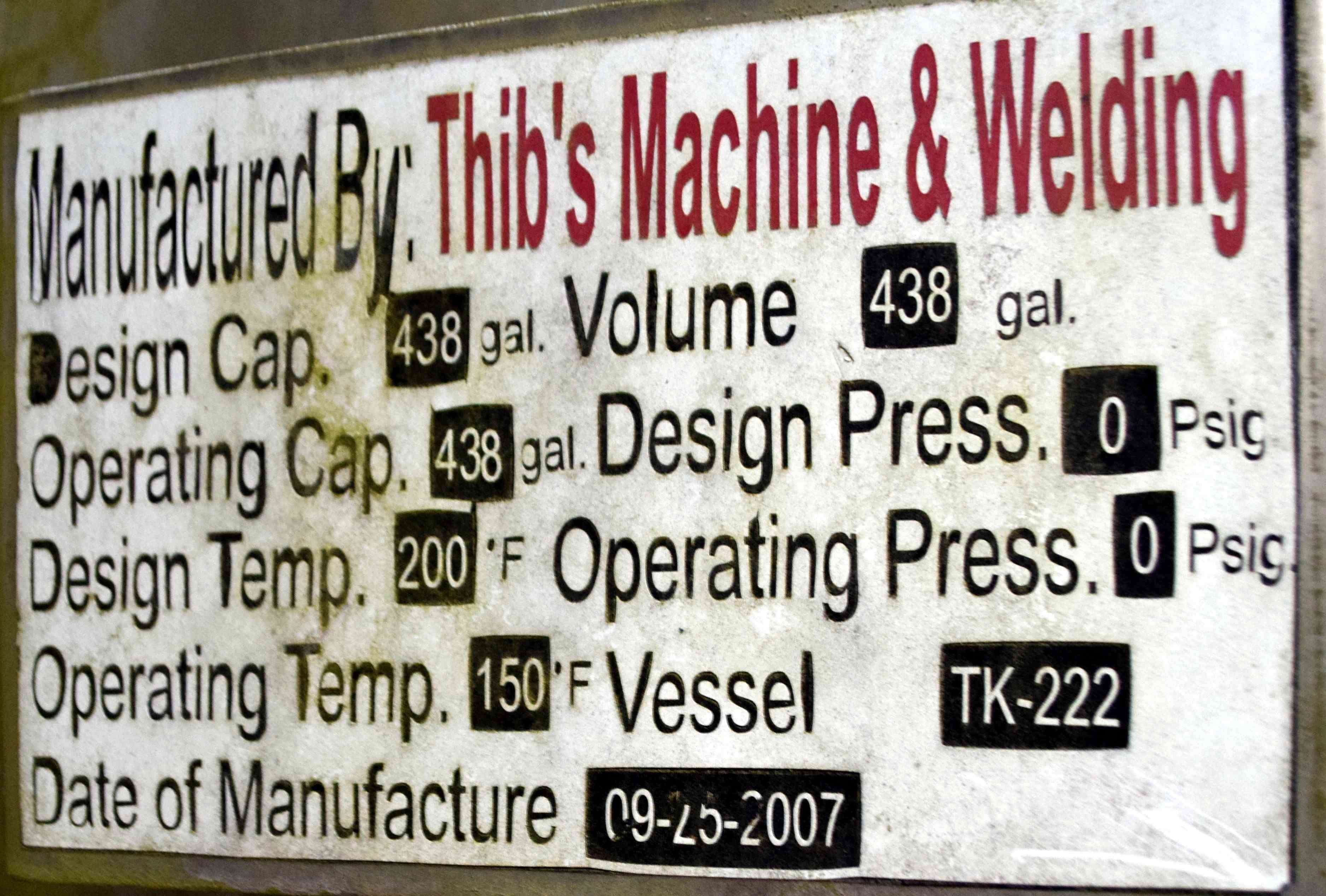 Used- Thibs Machine & Welding Tank, 438 Gallon, Stainless Steel, Vertical. Approximate 42" diameter x 69" straight side, flat bolt on top, coned bottom. Internal rated to 200 degrees F. Top entering UET agitator, model XCEL-2, serial# 10510-01, built 2007. Approximate 1-1/2" diameter shaft with turbines, driven by a 2hp, 3/60/208-230/460 volt, 1140 rpm motor. Mounted on 4 carbon steel legs. Built 2007.