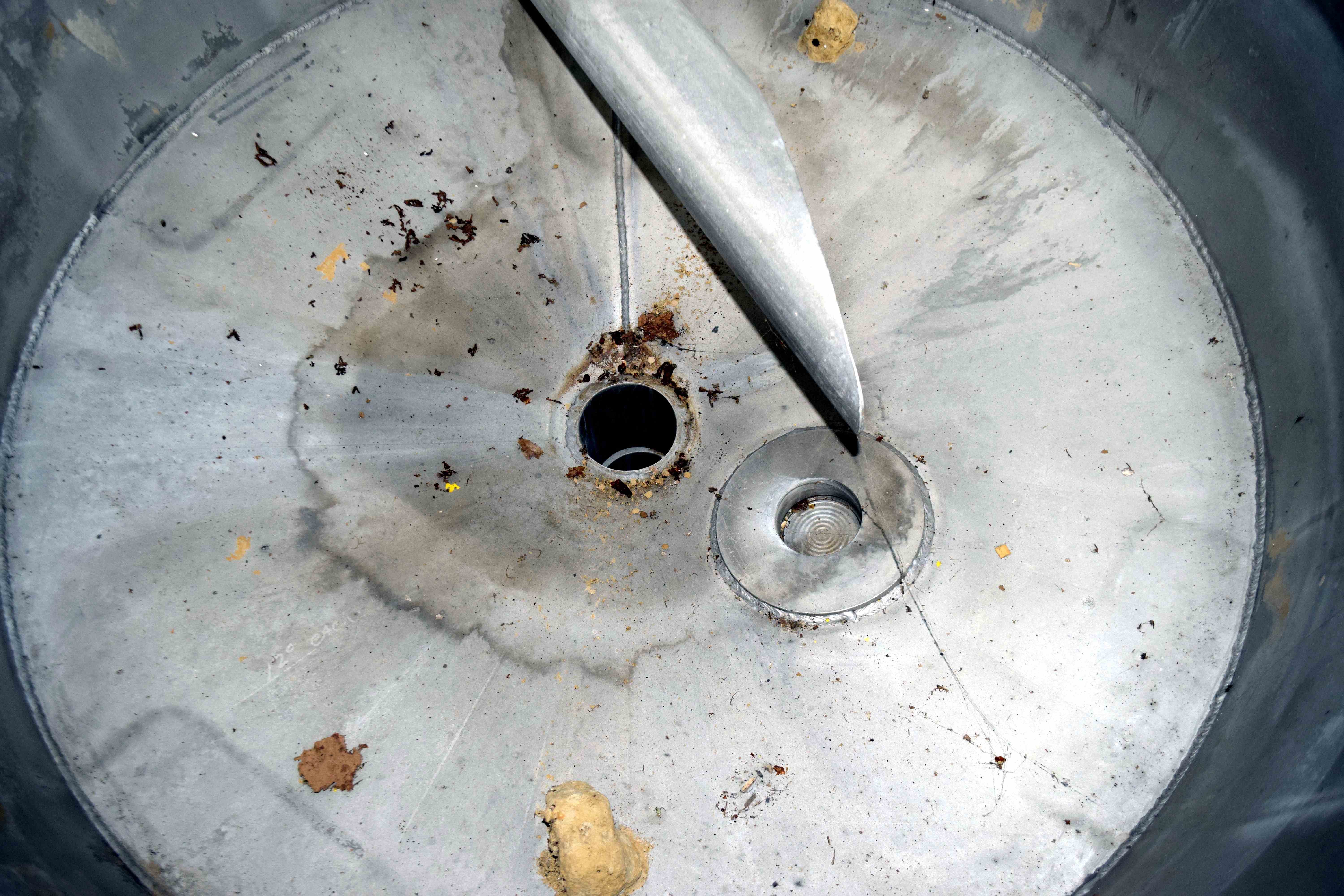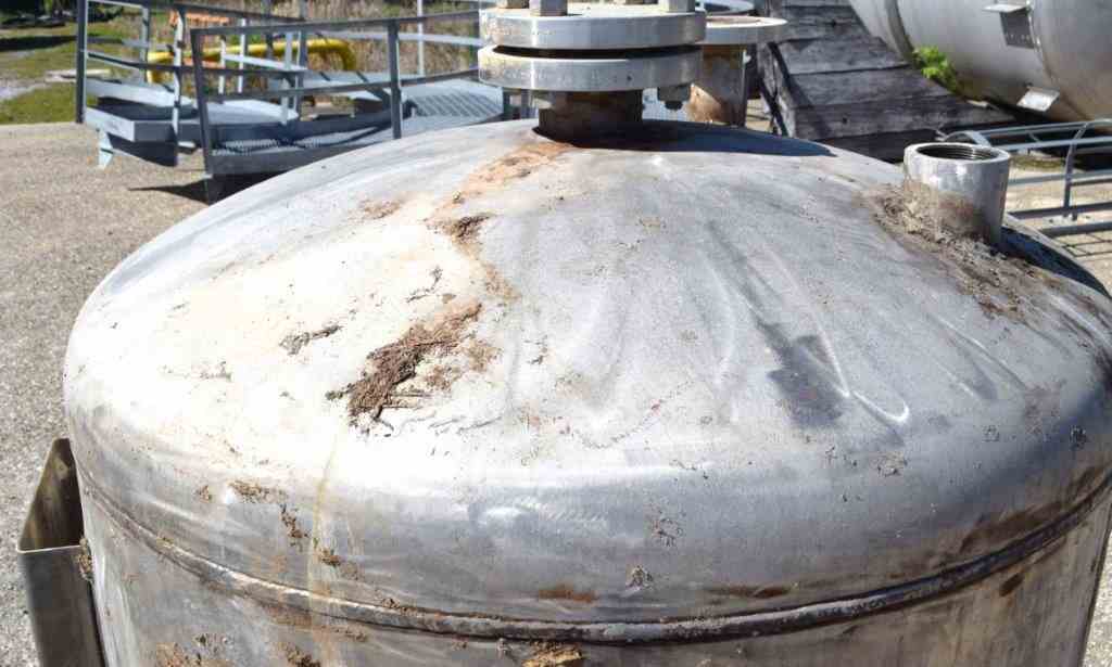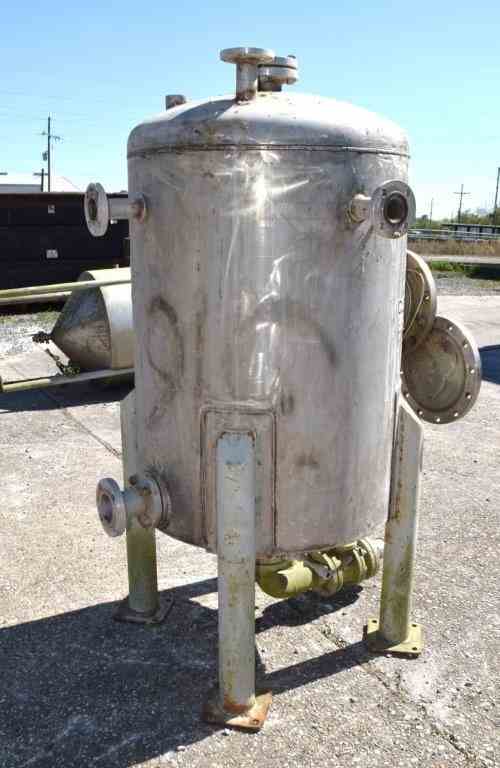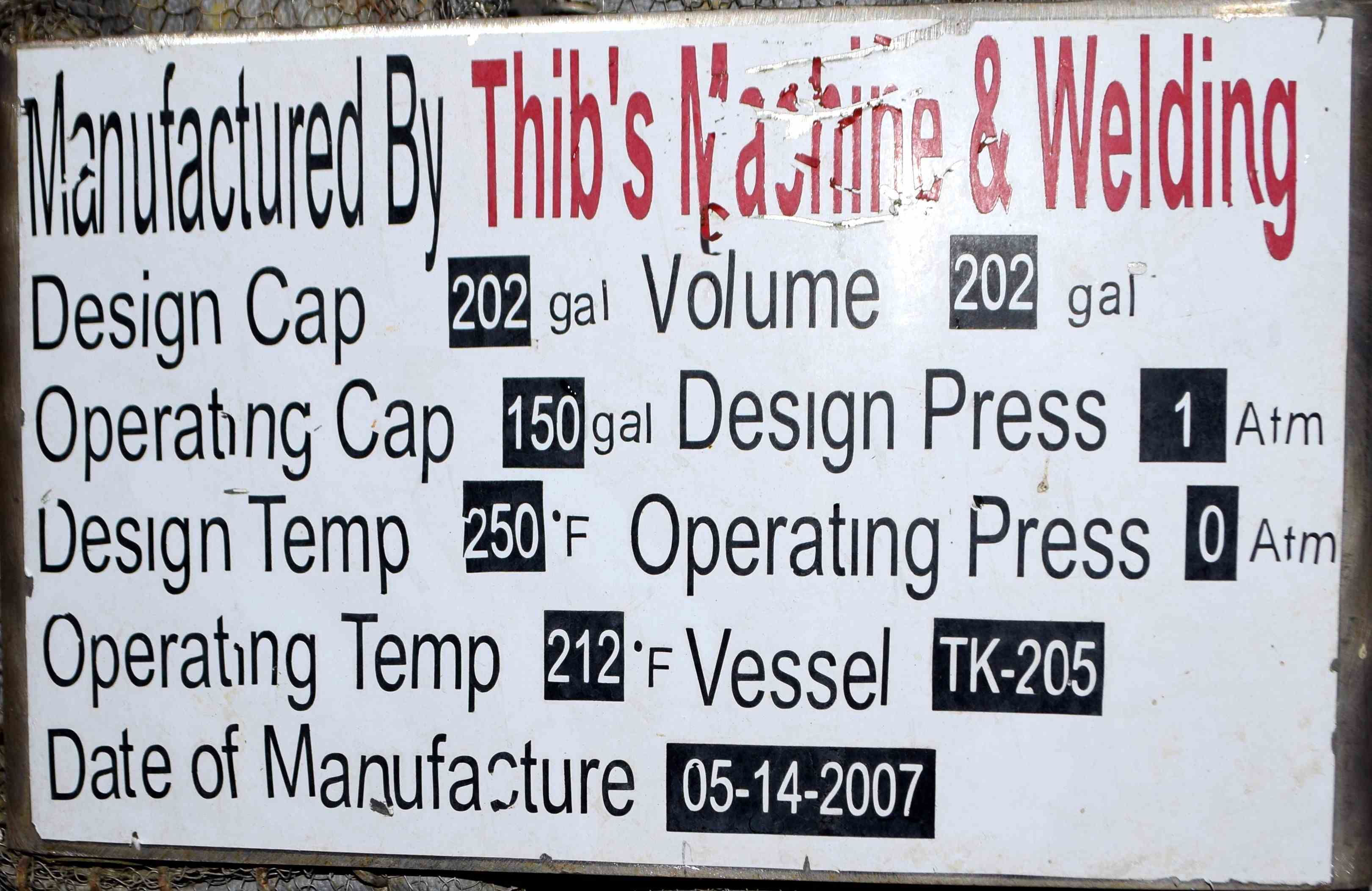 Used- Thibs Machine & Welding Tank, 202 Gallon, Stainless Steel, Vertical. Approximate 36” diameter x 48” straight side, dished top & bottom. Internal rated 1 psi at 250 degrees F. Side man way, center bottom outlet. Mounted on 4 carbon steel legs. Built 2007.