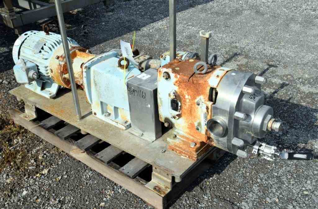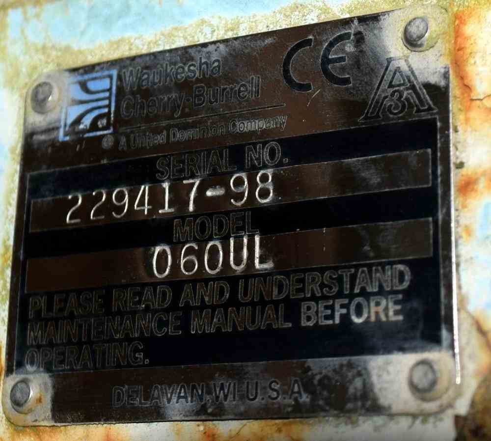 Used- Waukesha Positive Displacement Pump, Model 060UL, Stainless Steel. Approximate displacement 0.153 gallons per revolution, nominal capacity to 90 gallons per minute. Driven by a 15hp, 3/60/230/460 volt, 1760 rpm gear motor, ratio 3.89 to 1. Serial# 229417, built 1998.