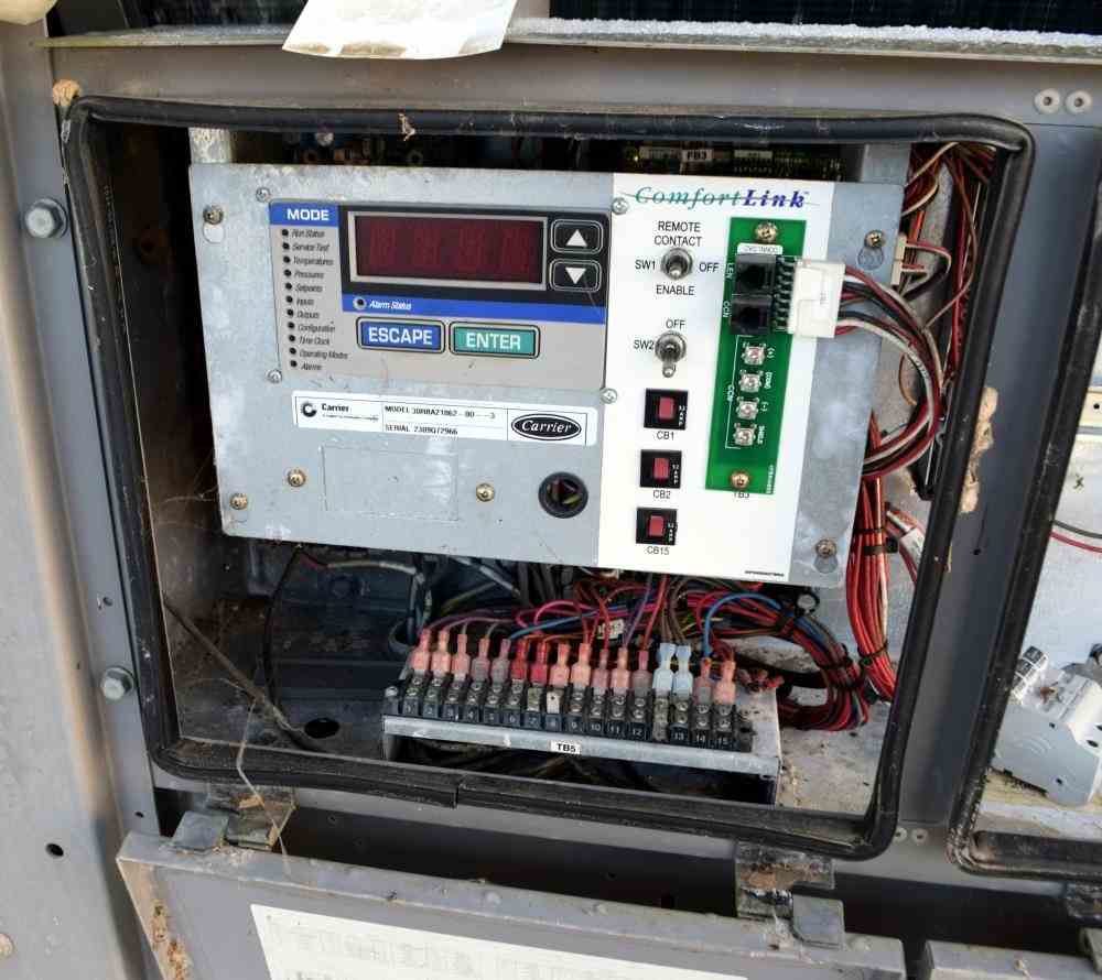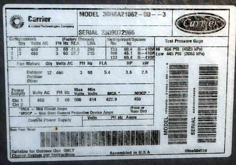 Used-Carrier AquaSnap Air Cooled Chiller, Model 30RBA21062-OD-3. Nominal capacity 210 tons, R-410A refrigerant, 460 volt, 3 phase, 60 hertz. Includes a Comfort Link panel. Serial# 2309Q72966.
