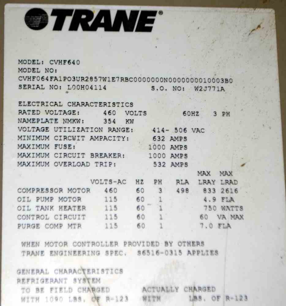 Used- Trane CVHF CenTraVac Water Cooled Chiller, Model CVHF640, Approximate 640 Tons. R-123 Refrigerant, 3/60/460 volts. Includes an Adaptive Control panel. Serial# L00H04114.