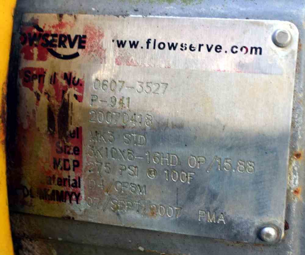 Used- Durco Flowserve MK3 STD Centrifugal Pump, Stainless Steel. Size 3K10X8-16HD-OP/15.88. Driven by a 350hp, 3/60/460 volt, 1785 rpm motor. Serial# 0607-3527, built 2007.