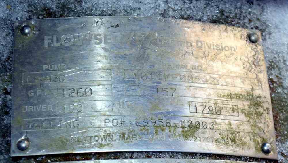 Used- Durco Flowserve Centrifugal Pump, Stainless Steel. Rated 1260 gallons per minute at 157' head. 8" inlet and 6" outlet. Driven by a 150hp, 3/60/230/460 volt, 1790 rpm motor. Serial# 1011MP005436-1.