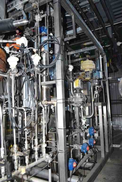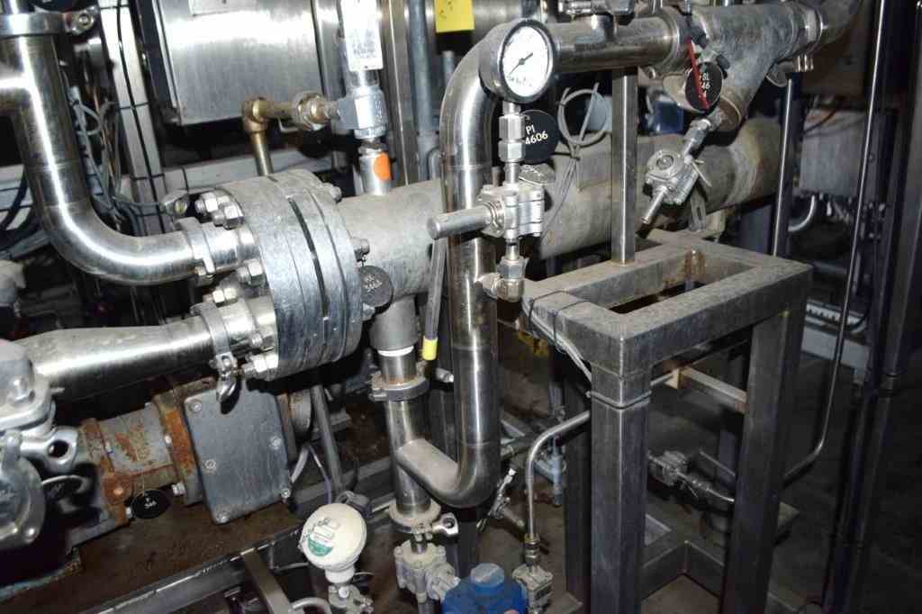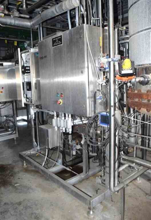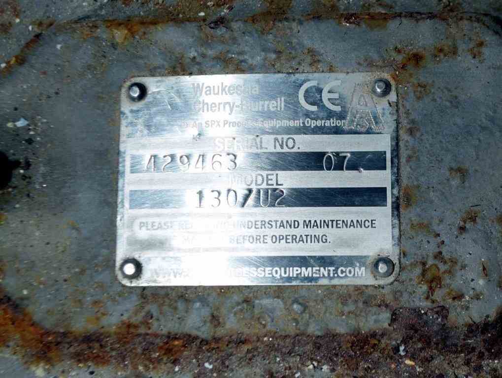 Used- Waukesha Positive Displacement Pump, Model 130/U2, Stainless Steel. Approximate displacement 0.254 gallons per revolution, nominal capacity to 150 gallons per minute. Driven by a 5hp, 3/60/208-230/460 volt, 1750 rpm gear motor. Serial# 429463, built 2007. Includes a control panel with an Allen-Bradley Power Flex drive. Mounted on a stainless steel frame with miscellaneous piping and valves.