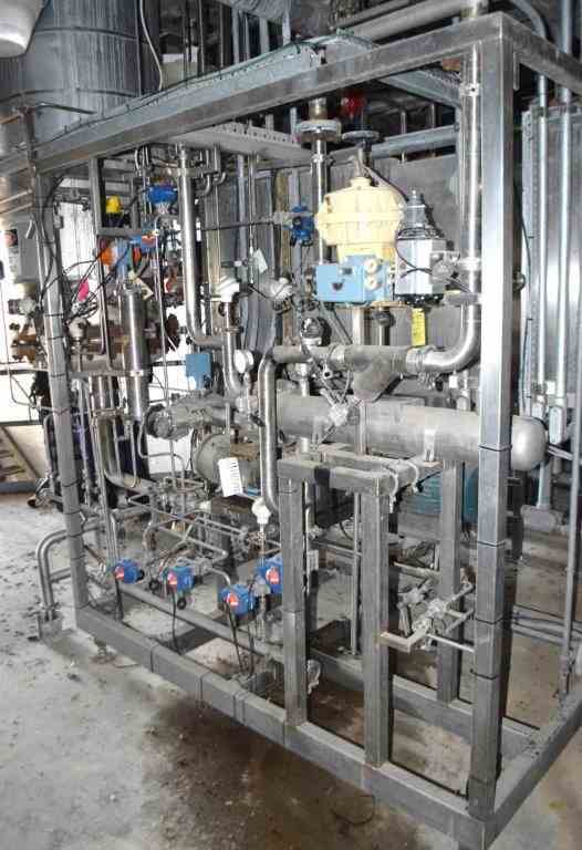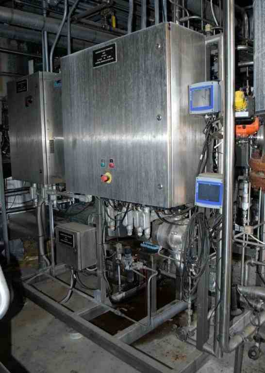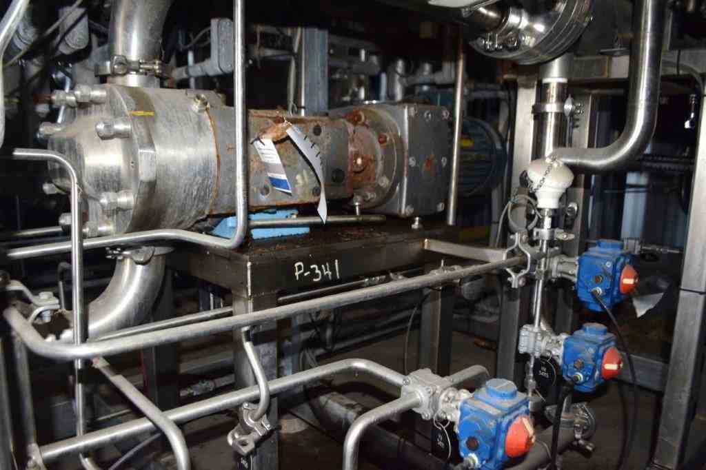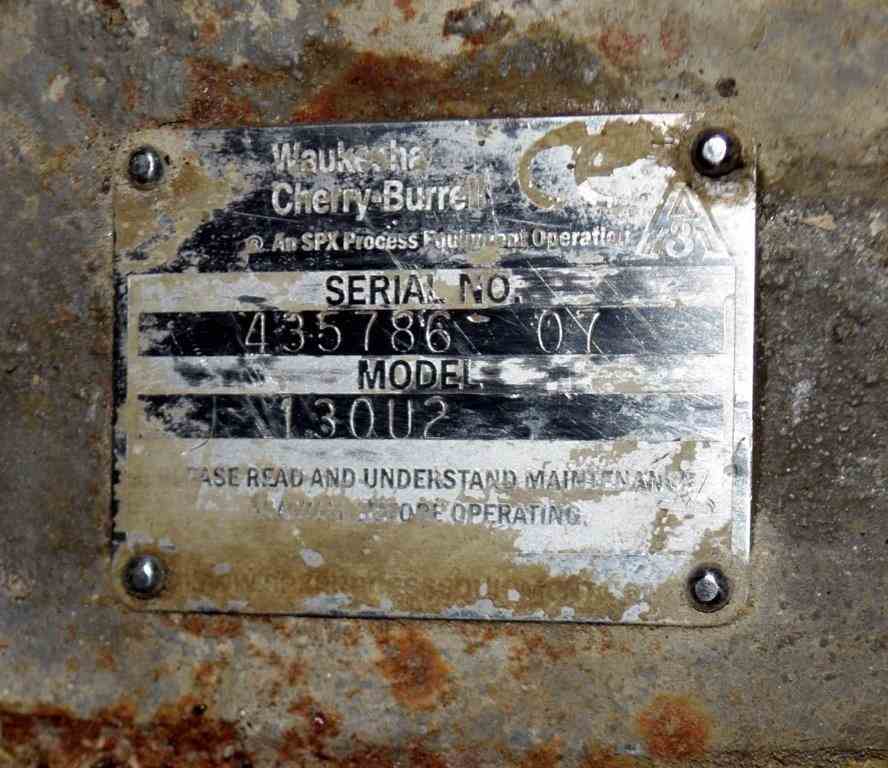Used- Waukesha Positive Displacement Pump, Model 130/U2, Stainless Steel. Approximate displacement 0.254 gallons per revolution, nominal capacity to 150 gallons per minute. Driven by a 5hp, 3/60/208-230/460 volt, 1750 rpm gear motor. Serial# 435786, built 2007. Includes a Yula stainless steel heat exchanger, control panel with an Allen-Bradley Power Flex drive. Mounted on a stainless steel frame with miscellaneous piping and valves.