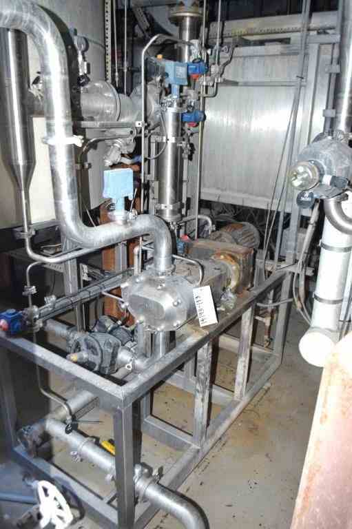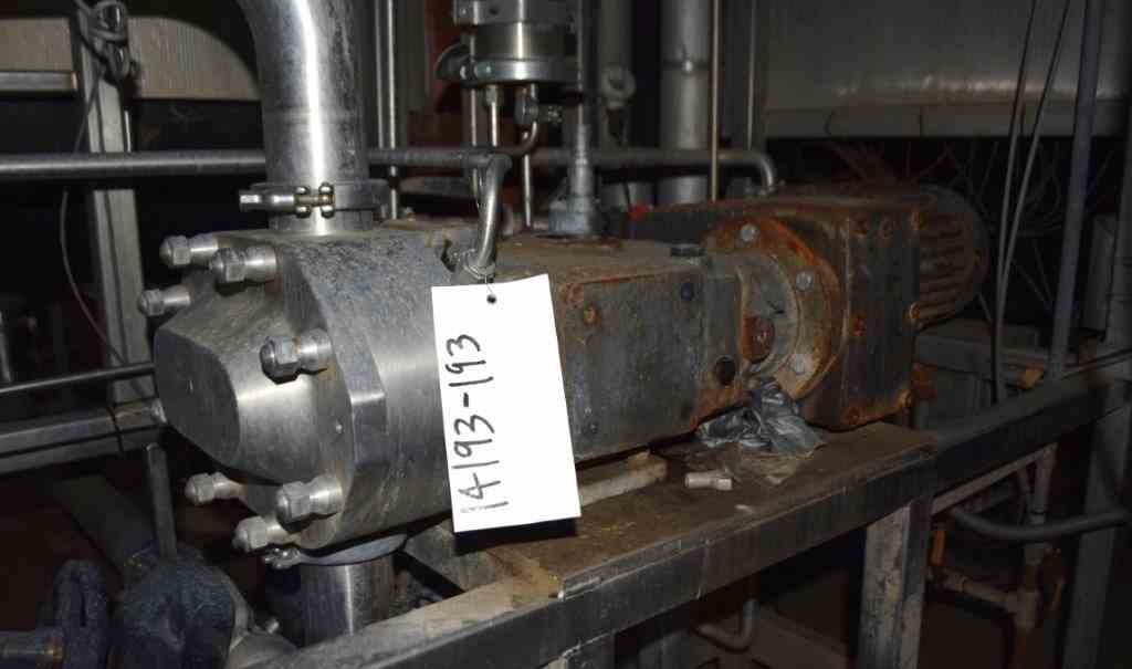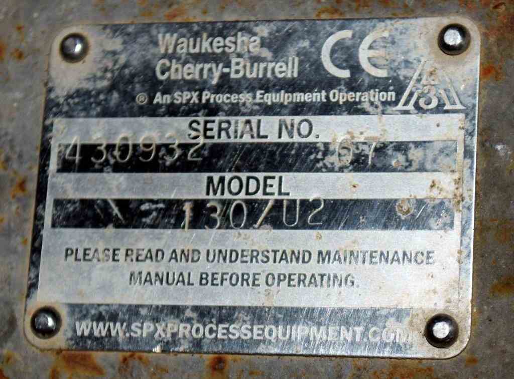 Used- Waukesha Positive Displacement Pump, Model 130/U2, Stainless Steel. Approximate displacement 0.254 gallons per revolution, nominal capacity to 150 gallons per minute. Driven by a 5hp, 3/60/208-230/460 volt, 1750 rpm gear motor. Serial# 430932, built 2007. Includes a control panel. Mounted on a stainless steel frame with miscellaneous piping and valves.