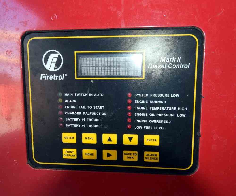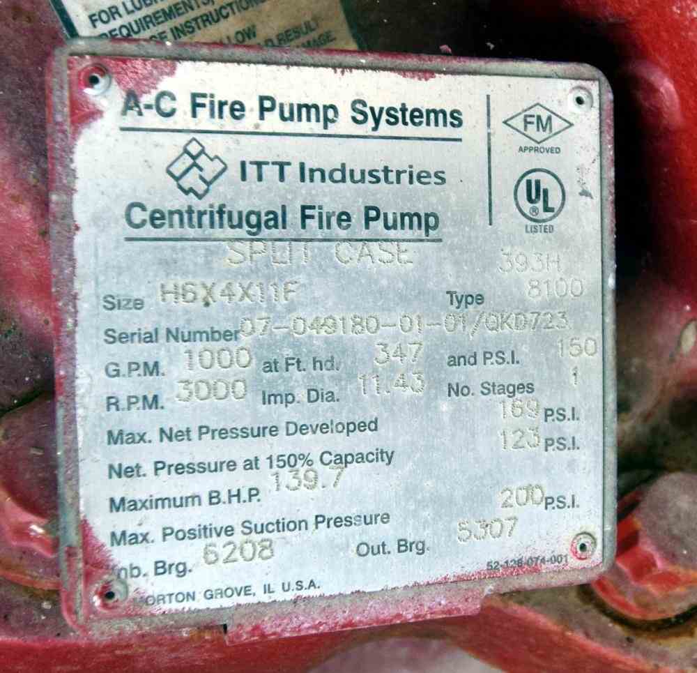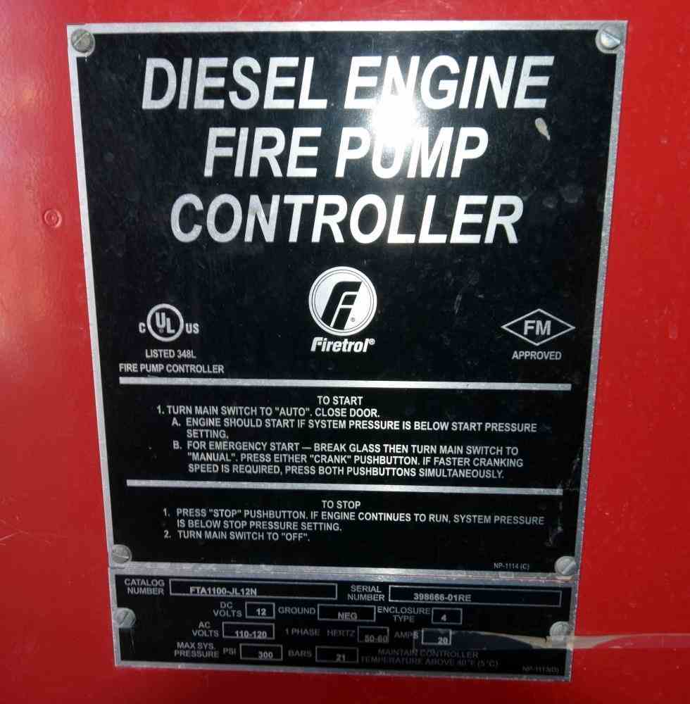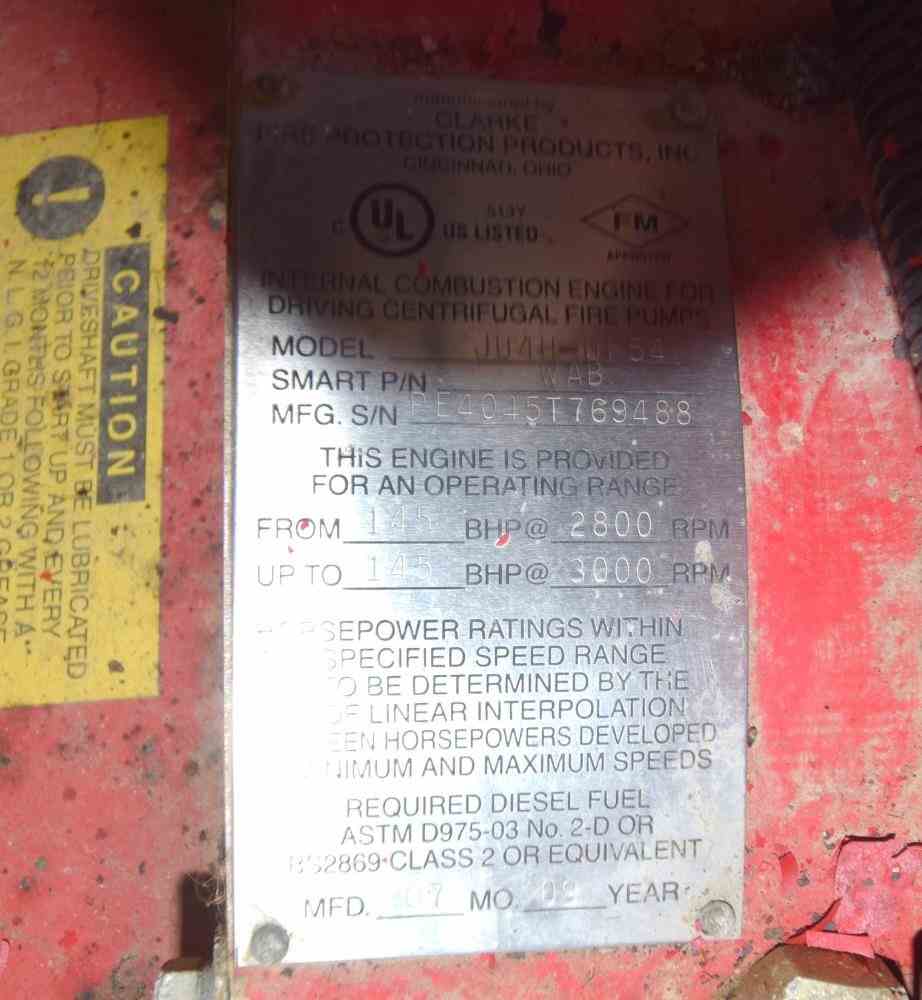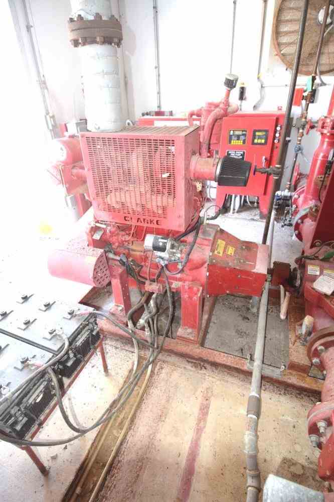 Used- Clarke Fire Protection Products Diesel Driven Fire Pump System. Consisting of: (1) Clarke diesel engine, model JU4H-UF54, part# WAB, serial# PE4045T769488, built 2009. (1) ITT Industries centrifugal AC fire pump, type 8100, size H6X4X11F, rated 1000 gallons per minute at 347' head at 3000 rpm, serial# 07-049180-01-01/QKD723, (1) control panel with a Firetrol FTA1100-JL12N controller, (1) approximate 60 gallon fuel tank, (1) jockey pump with panel., (1) ITT skid with housing approximate 12' wide x 18' long x 10' tall