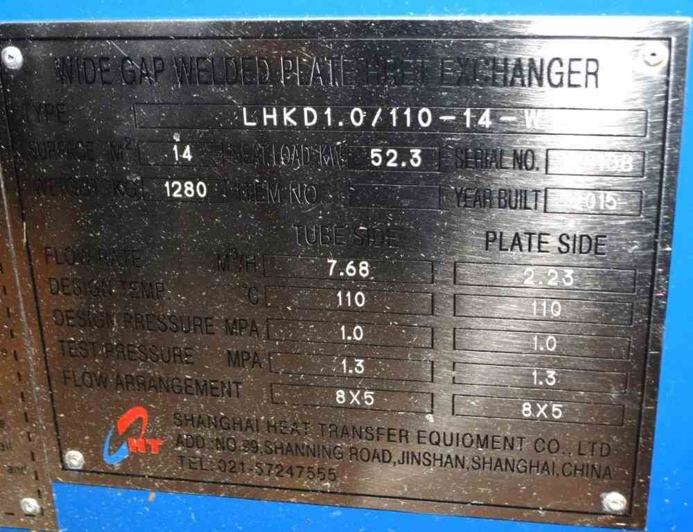 Unused- Shanghai Heat Transfer Equipment Wide Gap Welded Plate Heat Exchanger, 150 Square Feet, Type LHKD1.0/110-14-W, Stainless Steel. Flow rate tube side 271 cubic feet per hour rated 145 psi at 230 degrees F. , flow rate plate side 78 cubic feet per hour rated 145 psi at 230 degrees F. Serial# 140108, built 2015.