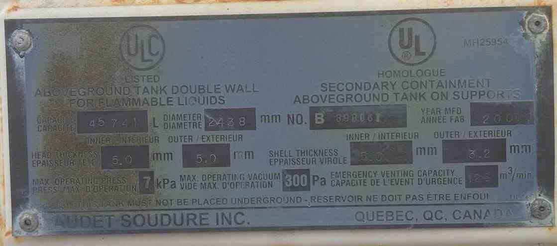 USED 12,000 USG, CARBON STEEL, HORIZONTAL, DOUBLE WALL FUEL TANK WITH EPOXY LINING. DIMENSIONS: 8' DIAMETER X 33' LONG. INTERIOR & EXTERIOR HEAD THICKNESS: 5mm. INTERIOR SHELL THICKNESS: 5mm. OUTER SHELL THICKNESS: 3.2mm. MAX OPERATING PRESSURE: 7 kPa. MAX OPERATING VACUUM: 300 Pa. OVERALL HEIGHT: 10'. MANUFATURED BY AUDET SOUDURE, 2011.