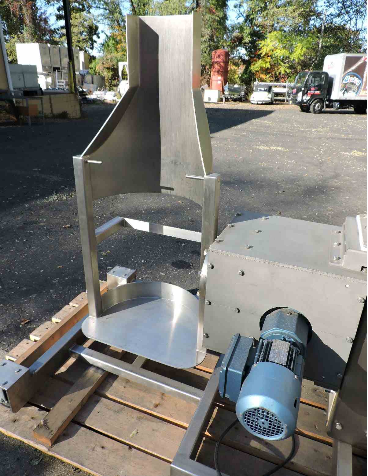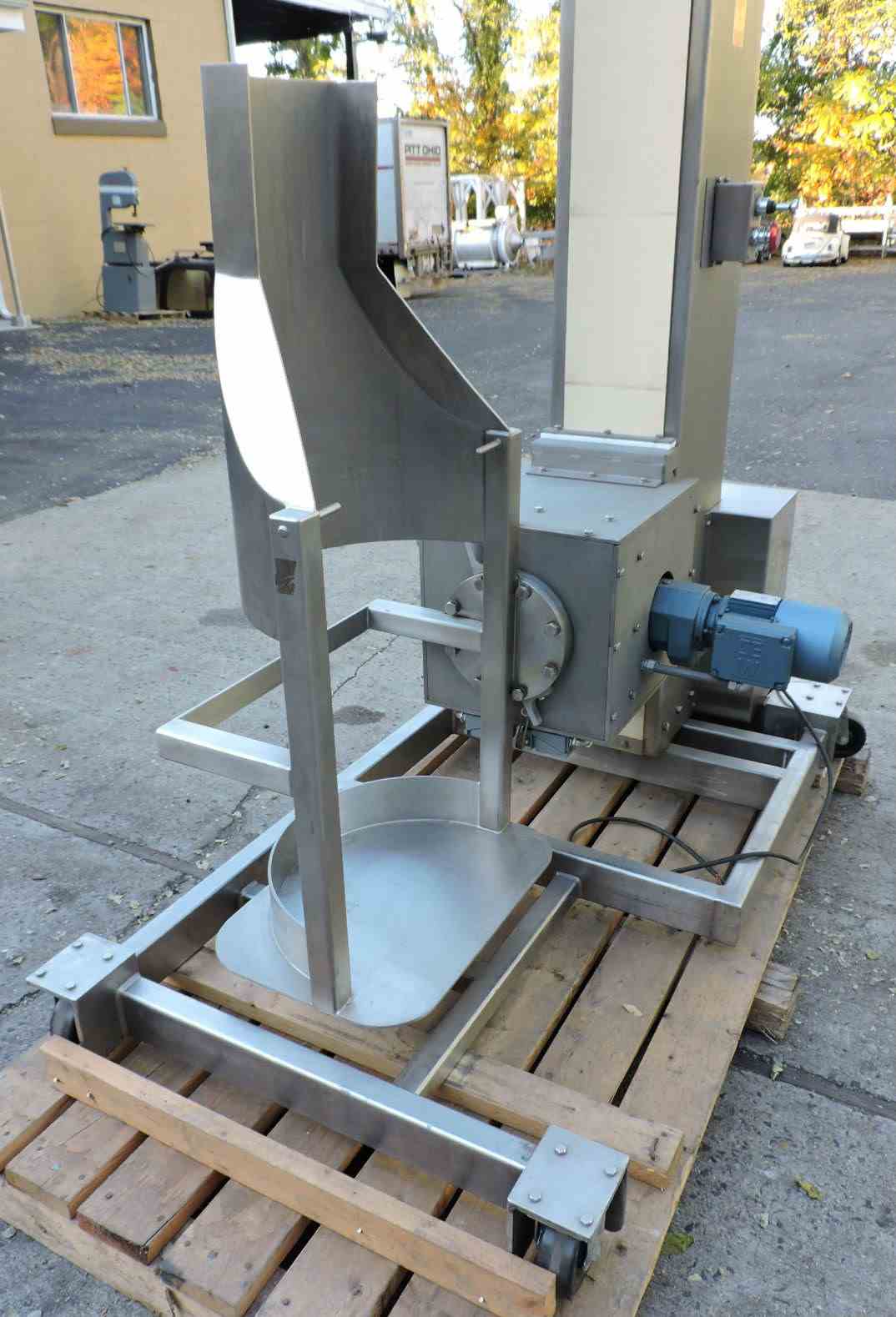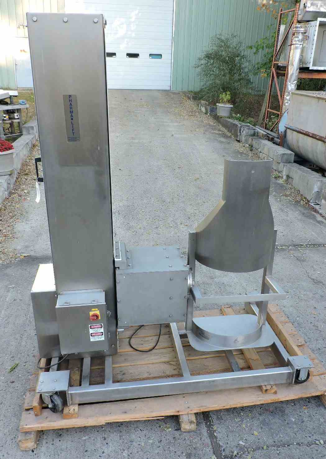 Used Cora pharma lift mobile drum tipper, model DT 550, serial # l94015. Features all stainless steel construction with polished pharmaceutical grade finish, designed for loading tablets into automatic coating machine, rated lifting capacity is 550 lbs. ((250 kg) gross, lifting speed 144"/minute, maximum tipped height at full range is 46 7/8" from floor, 1 horsepower lifting drive, 1/2 horsepower tipping speed, NEMA 12 electrics for 230 volt/3 phase/60 cycle, lift weight less product 1500 lbs., drum tipping speed 180 degrees in 48 seconds. Formerly used in loading automatic tablet coater.