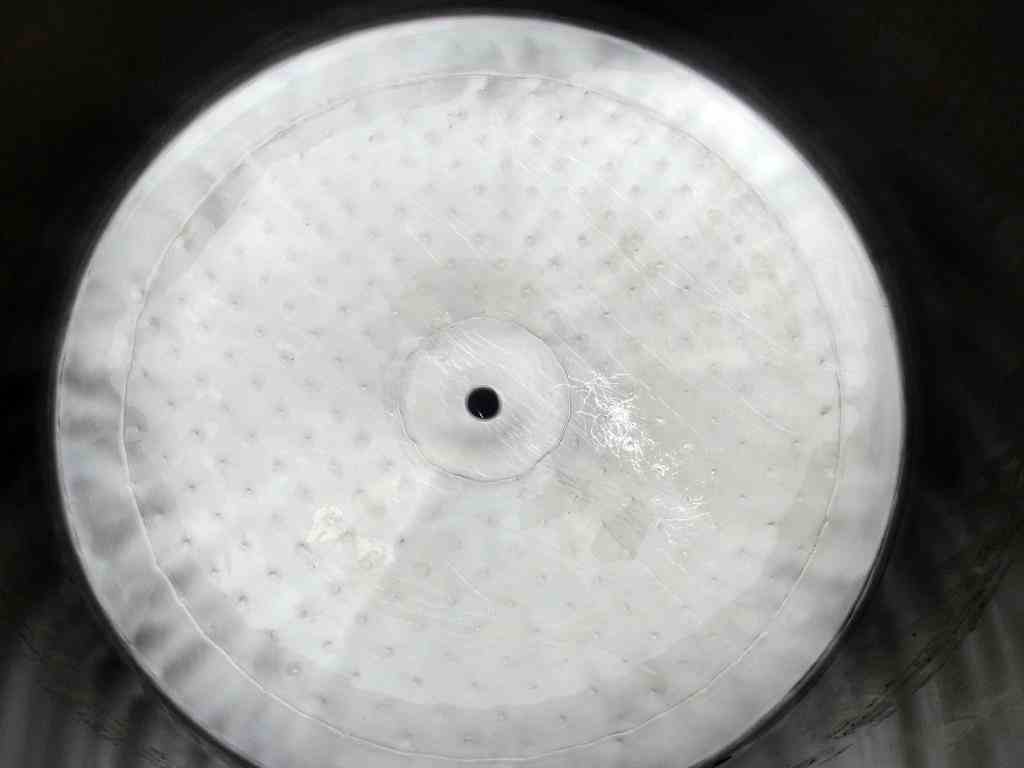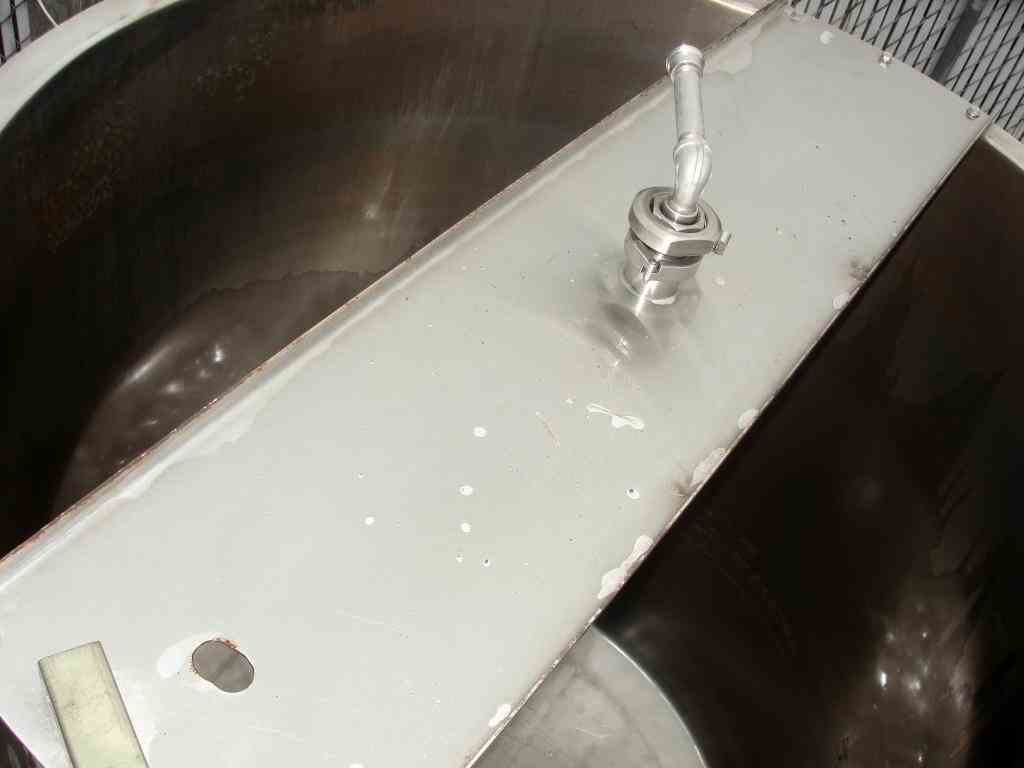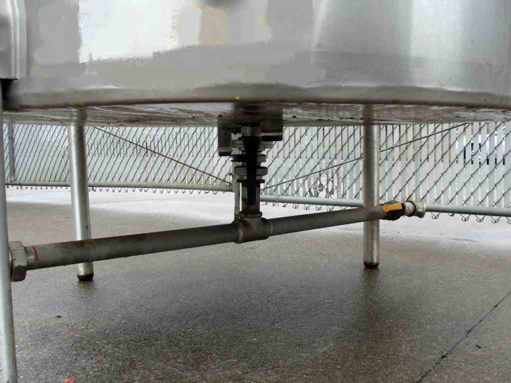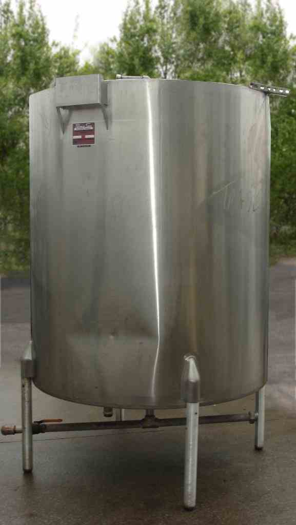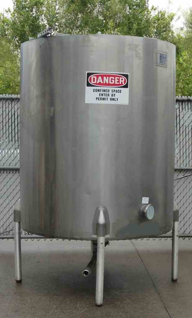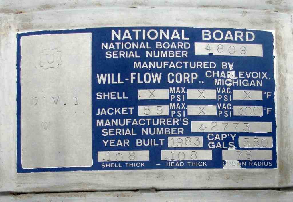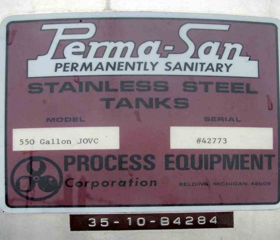 Used Stainless Steel 550 gallon warming tank. Fabricated by Perma-San. 52" diameter x 65" straight side. Flat bottom with open top, partial top plate and one partial removable lid. Sides insulated. Bottom jacket is rated for 55 psi @ 300F, The tank bottom currently sits 21” from the ground on four threaded pipe legs. Tank has one 2" center pipe, two 2" pipe openings, and one 1" threaded coupling on lower part of the side with pressure dial. Cosmetic dent in the side does not affect the inner vessel. Overall Size 86” Tall x 65” wide. National Board # 4809. Serial #42773. Built 1983. Last used for flavorings.