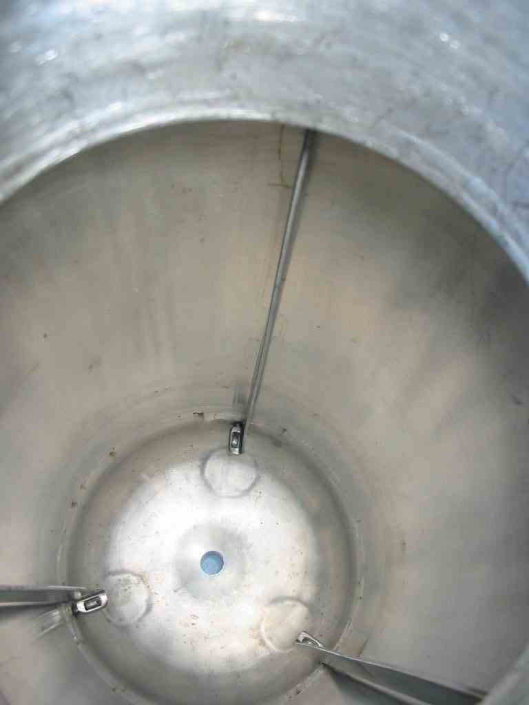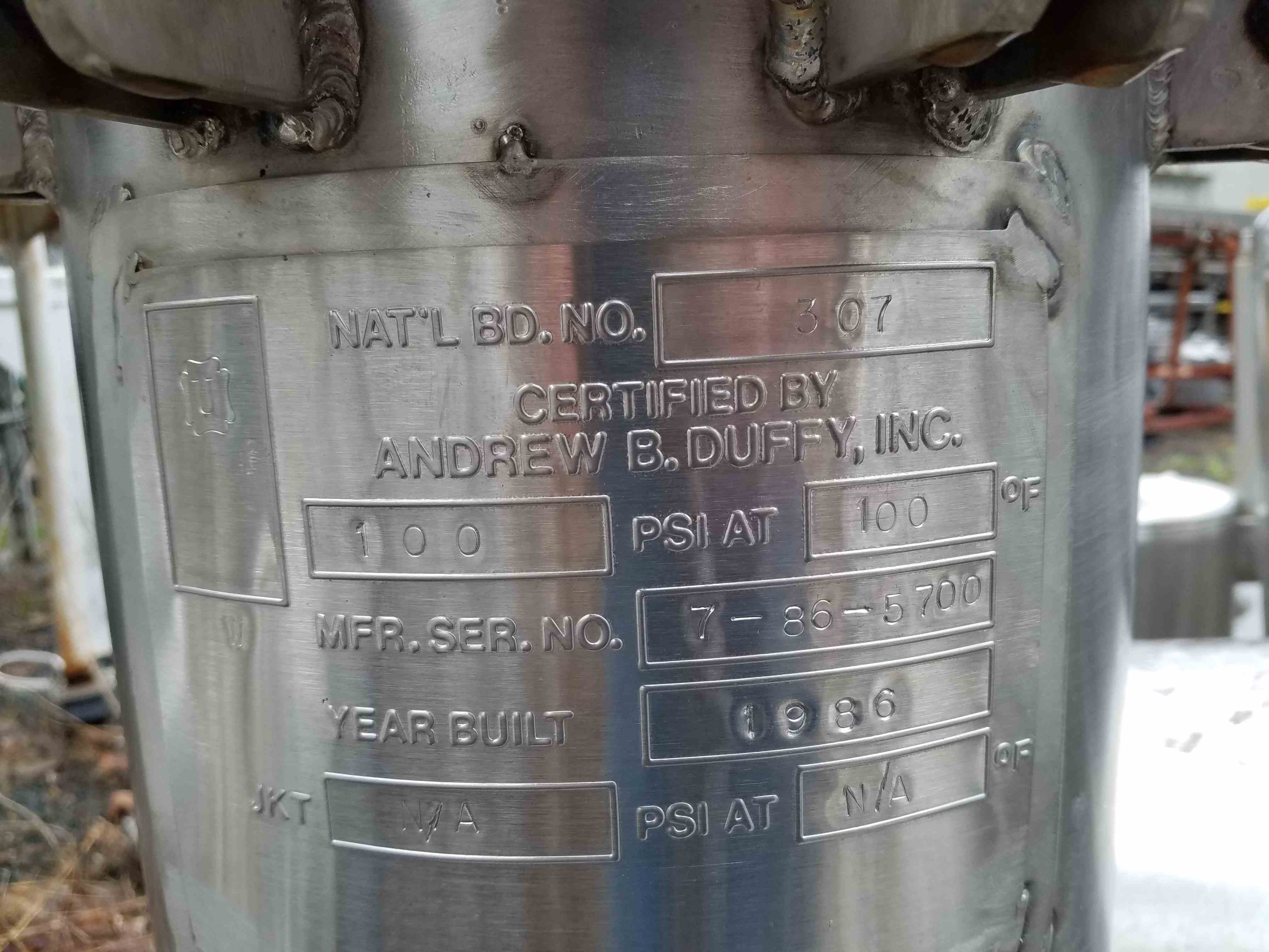 Used 6 Gallon Vertical, Stainless Steel Pressure Vessel. 10" dia x 22" T to T, dished bottom, flat bolted top head, stainless steel construction, rated 100 PSI@ 100 F internal, (2)- 1" threaded and (1)- 6" dia Top openings, center bottom outlet, on legs, ASME & NB Code Stamped.